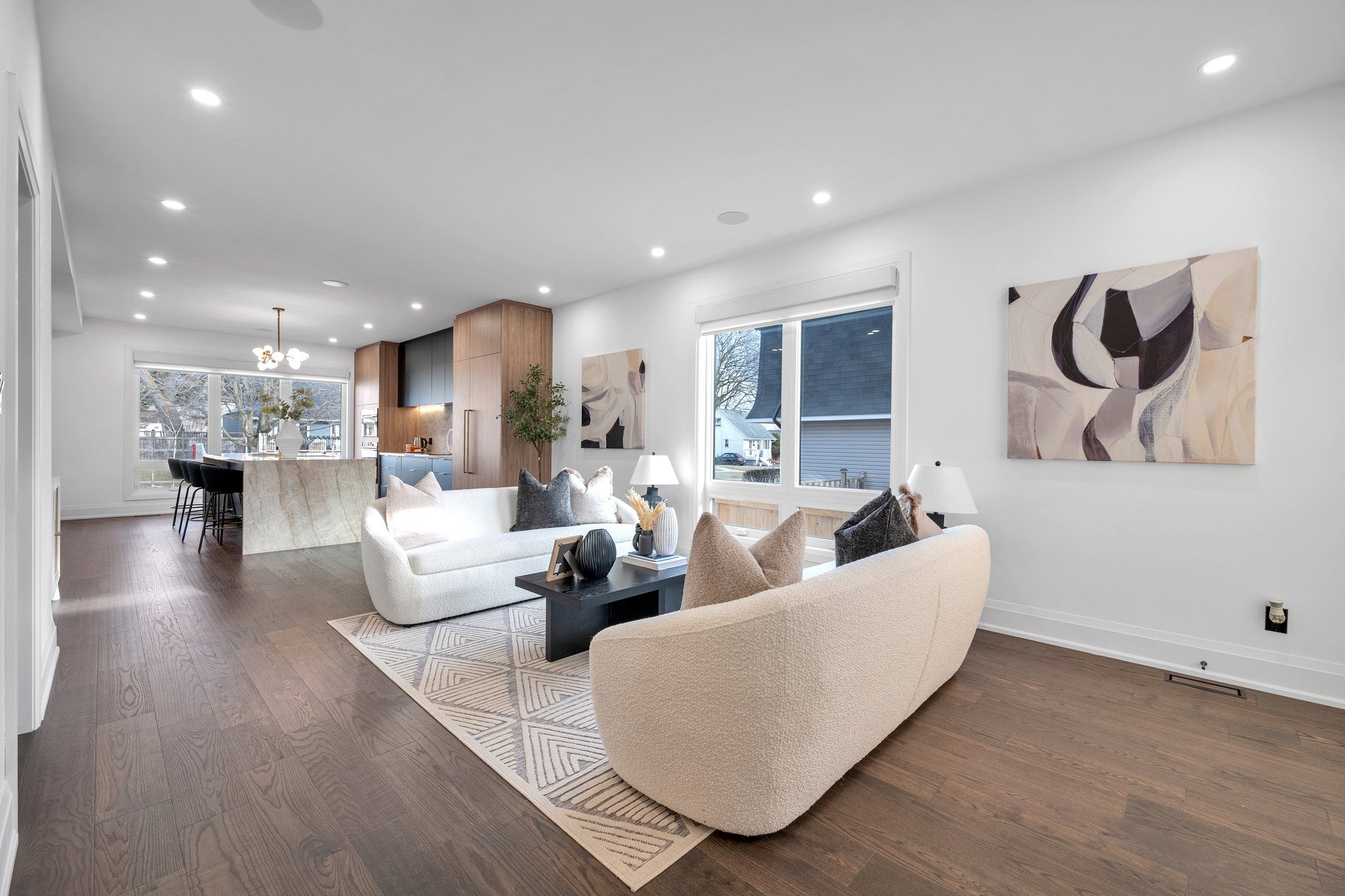 • Spacious open-concept main floor with 9-ft ceilings and large windows.