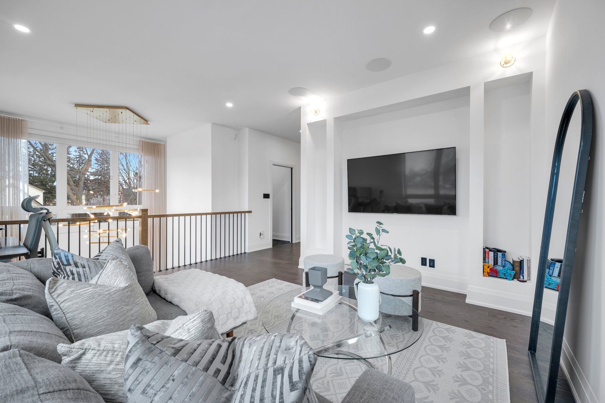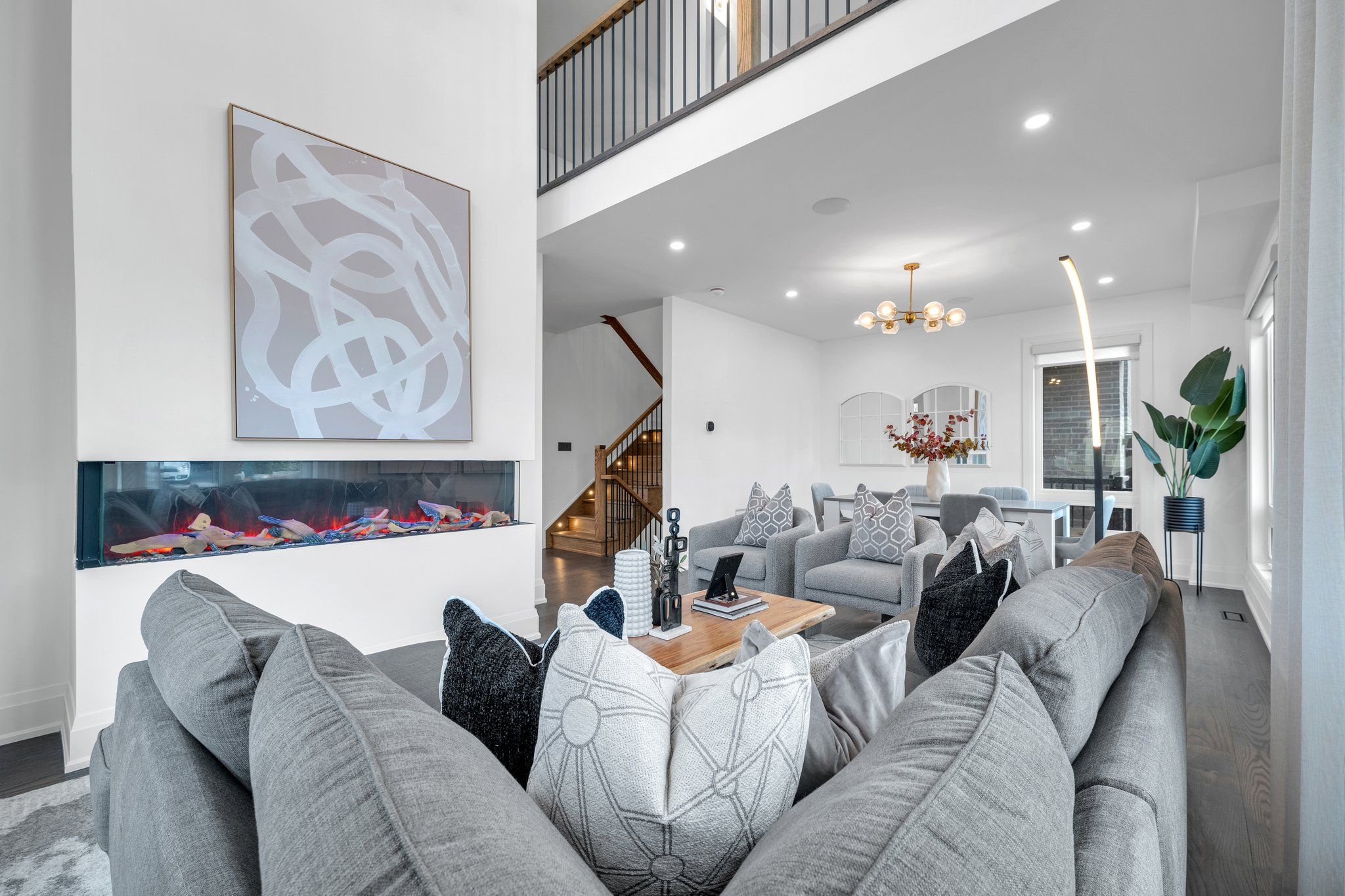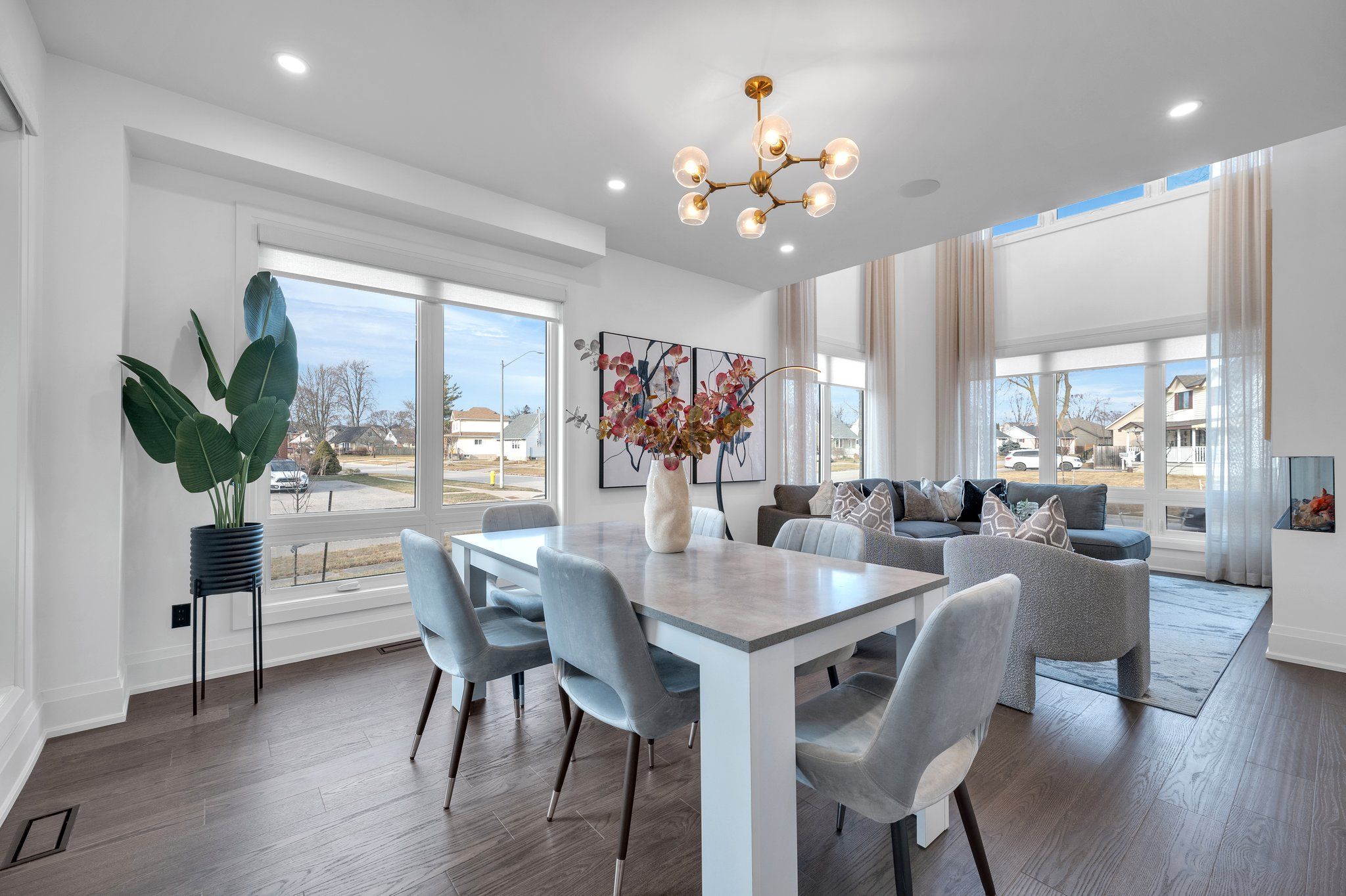Stunning two-storey custom home in a family-friendly, walkable neighborhood with mature trees. Featuring 4 bedrooms, 3. 5 bathrooms, and a scandinavian-inspired kitchen with a large waterfall quartzite island, induction cooktop, and panel-ready appliances. The open-concept main floor boasts 9-ft ceilings, large windows, hardwood and porcelain flooring, two living areas, dining space, and plenty of custom storage. Upstairs, the primary suite offers a spa-like 6-piece ensuite, plus three additional bedrooms and two more bathrooms. Luxury touches include gold-accented fixtures, motorized curtains, electric fireplace, in-ceiling speakers, a mezzanine, and a garage with tesla ev charging. Security is advanced with automated entry and multiple cameras. The unfinished basement has a separate entrance, and the large front and backyards are perfect for relaxing. Close to schools, shopping, highways, ajax go station, and the waterfront. Modern comfort, style, and convenience-all in one home!