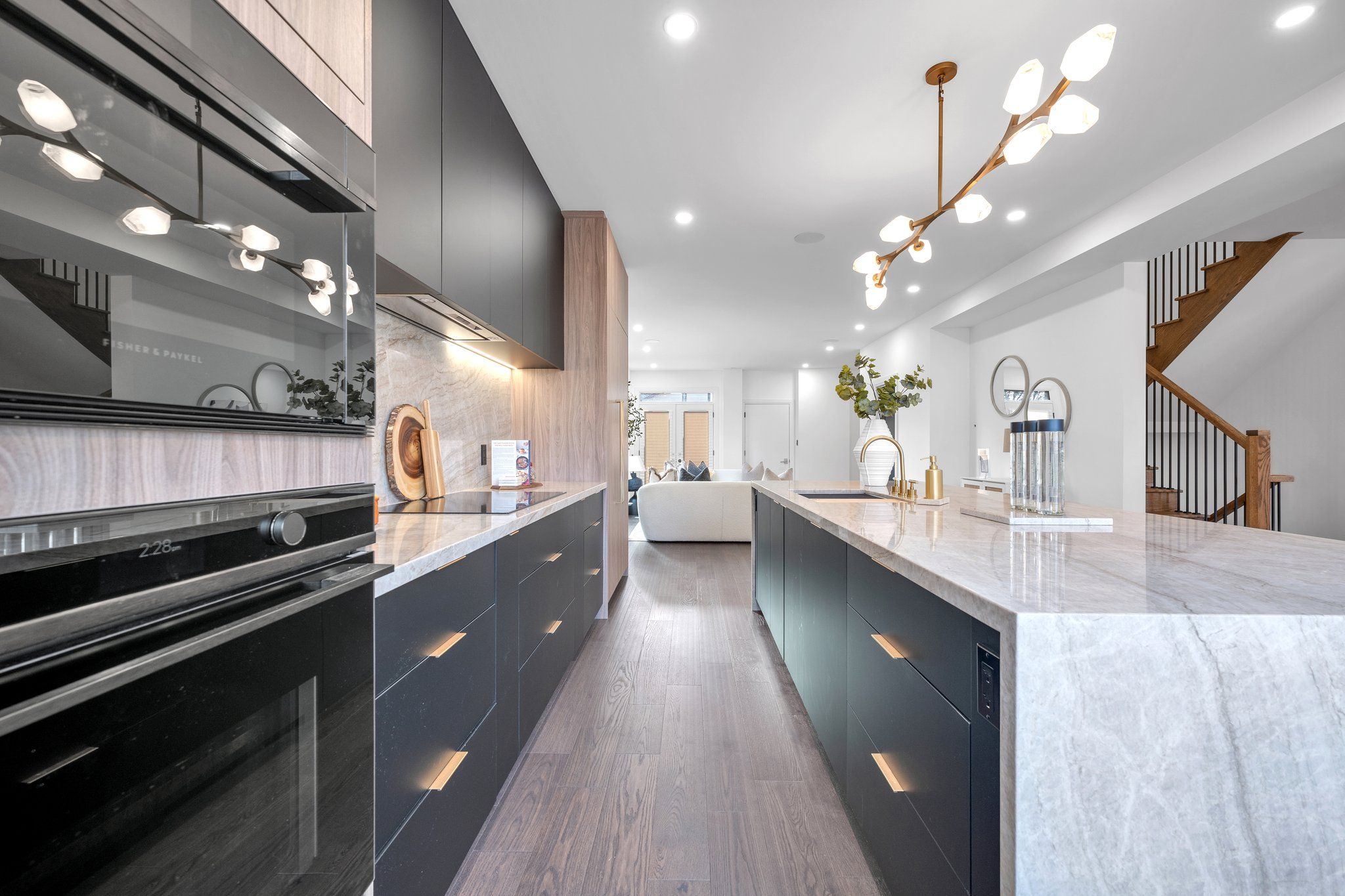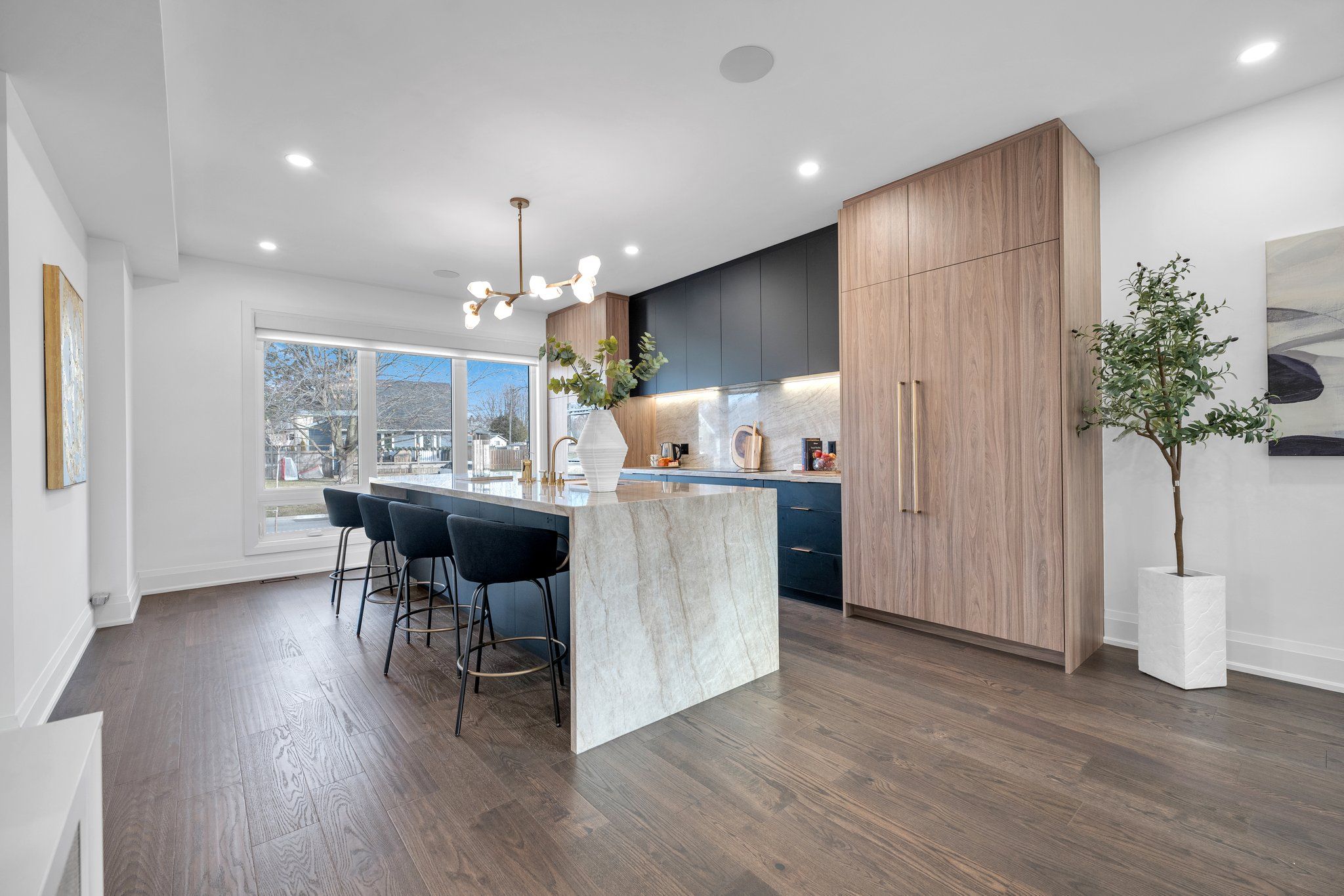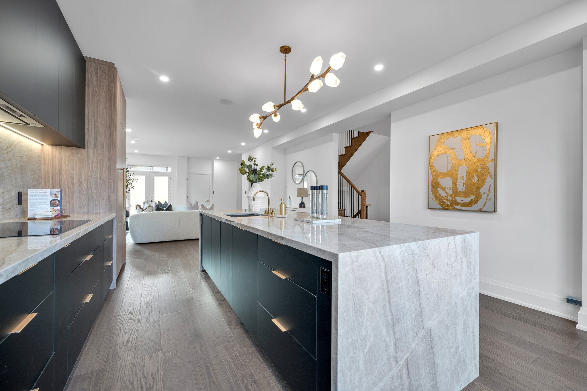 • Scandinavian-inspired kitchen with large quartzite island and modern appliances.