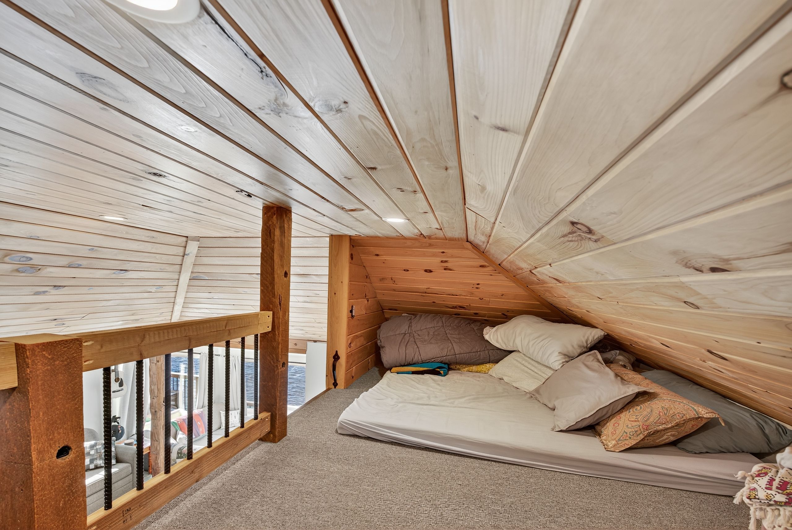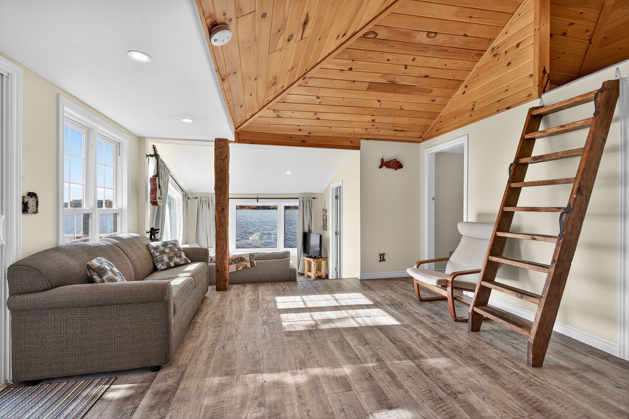• Open-concept living area features vaulted ceilings and stunning water views.