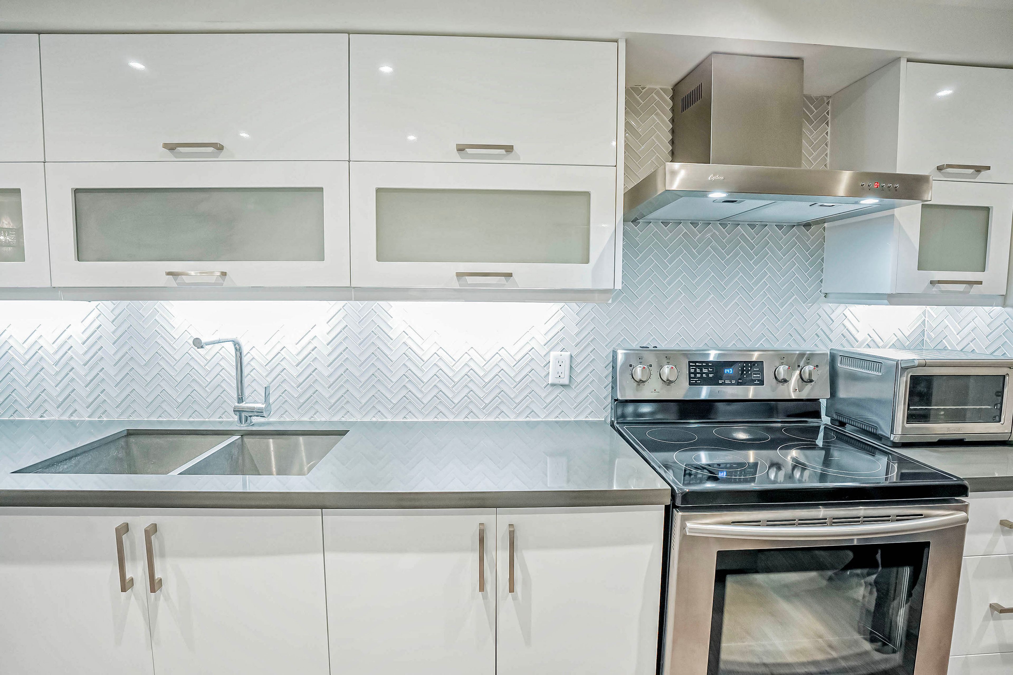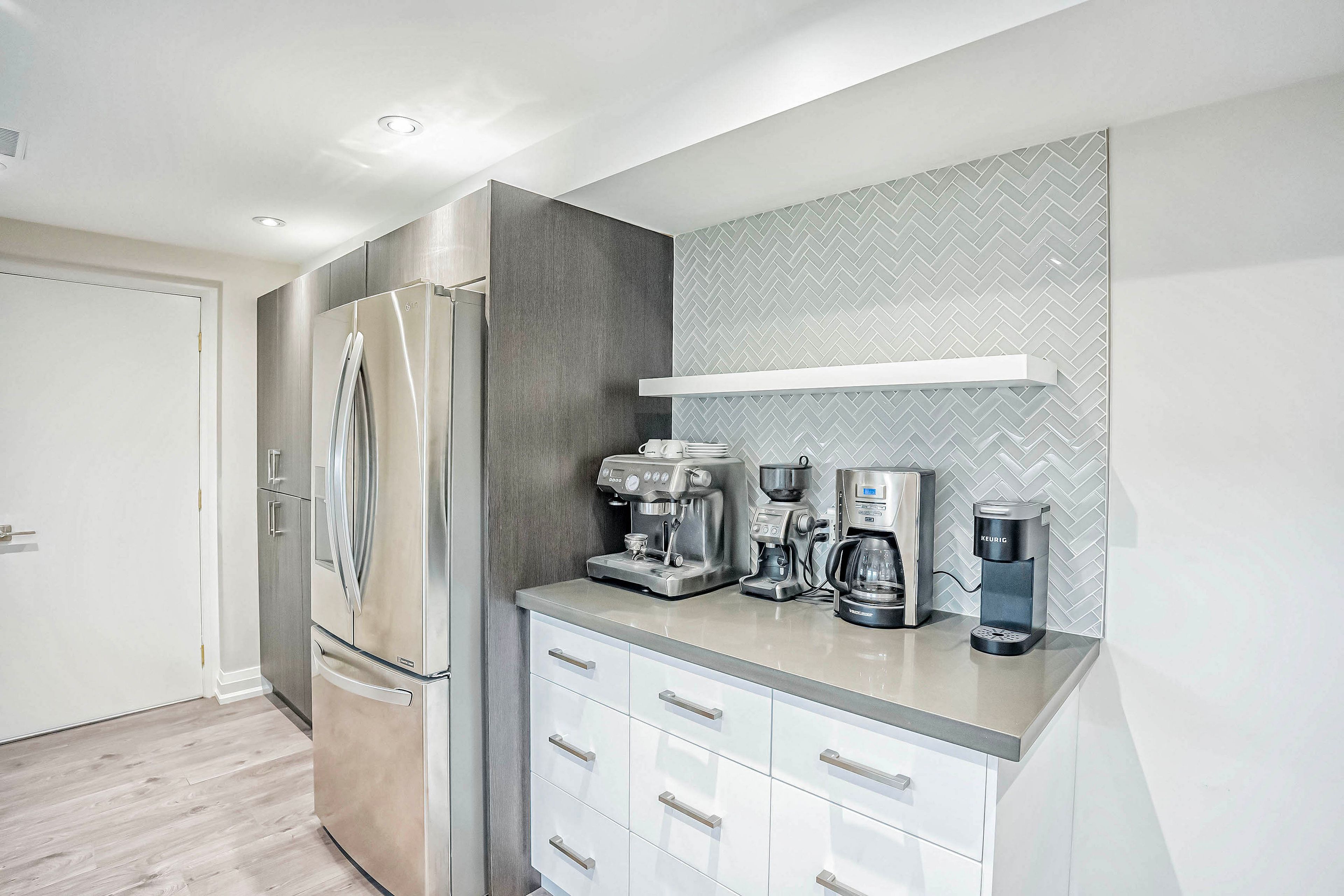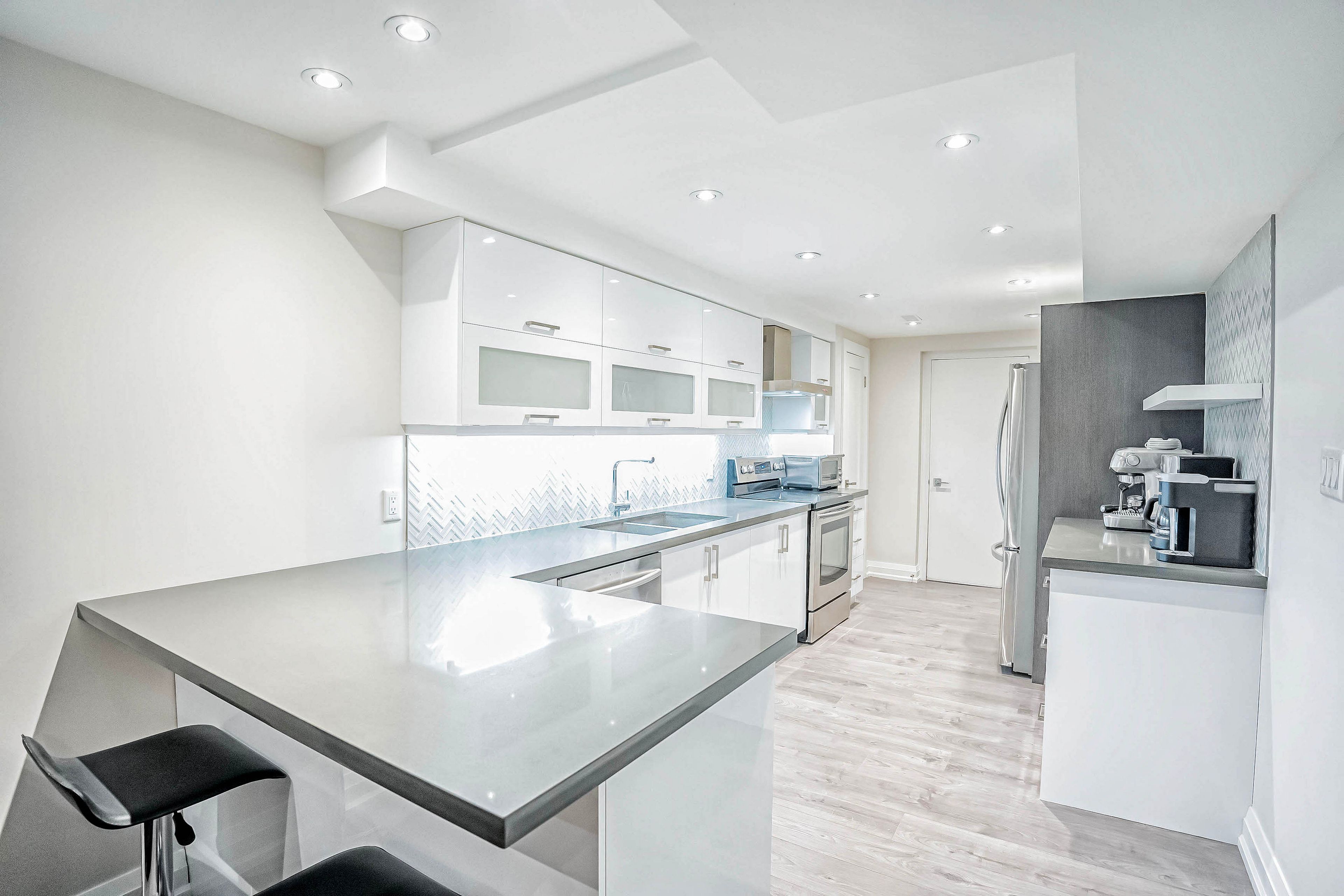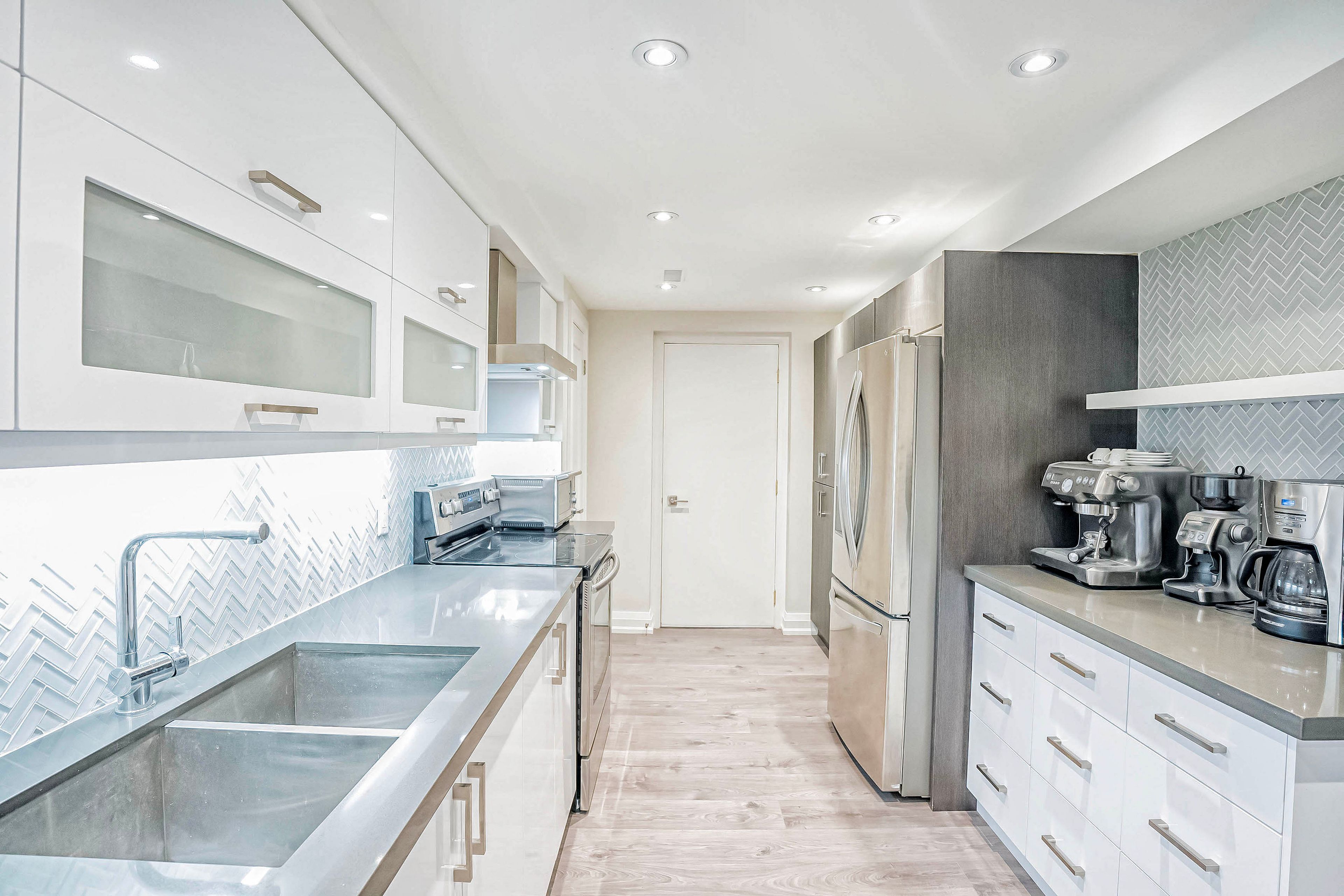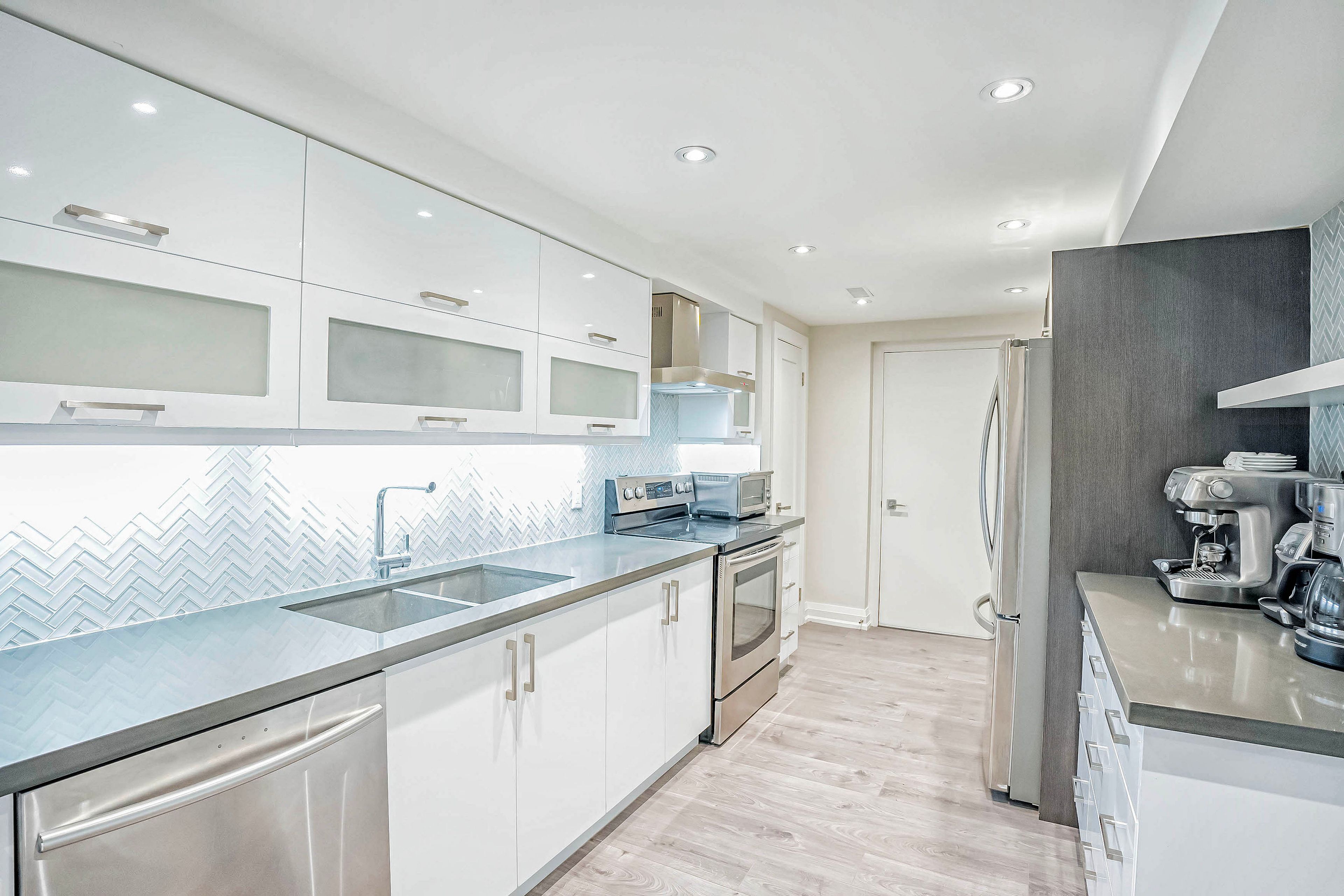 • Modern kitchen featuring stainless steel appliances and quartz countertops.