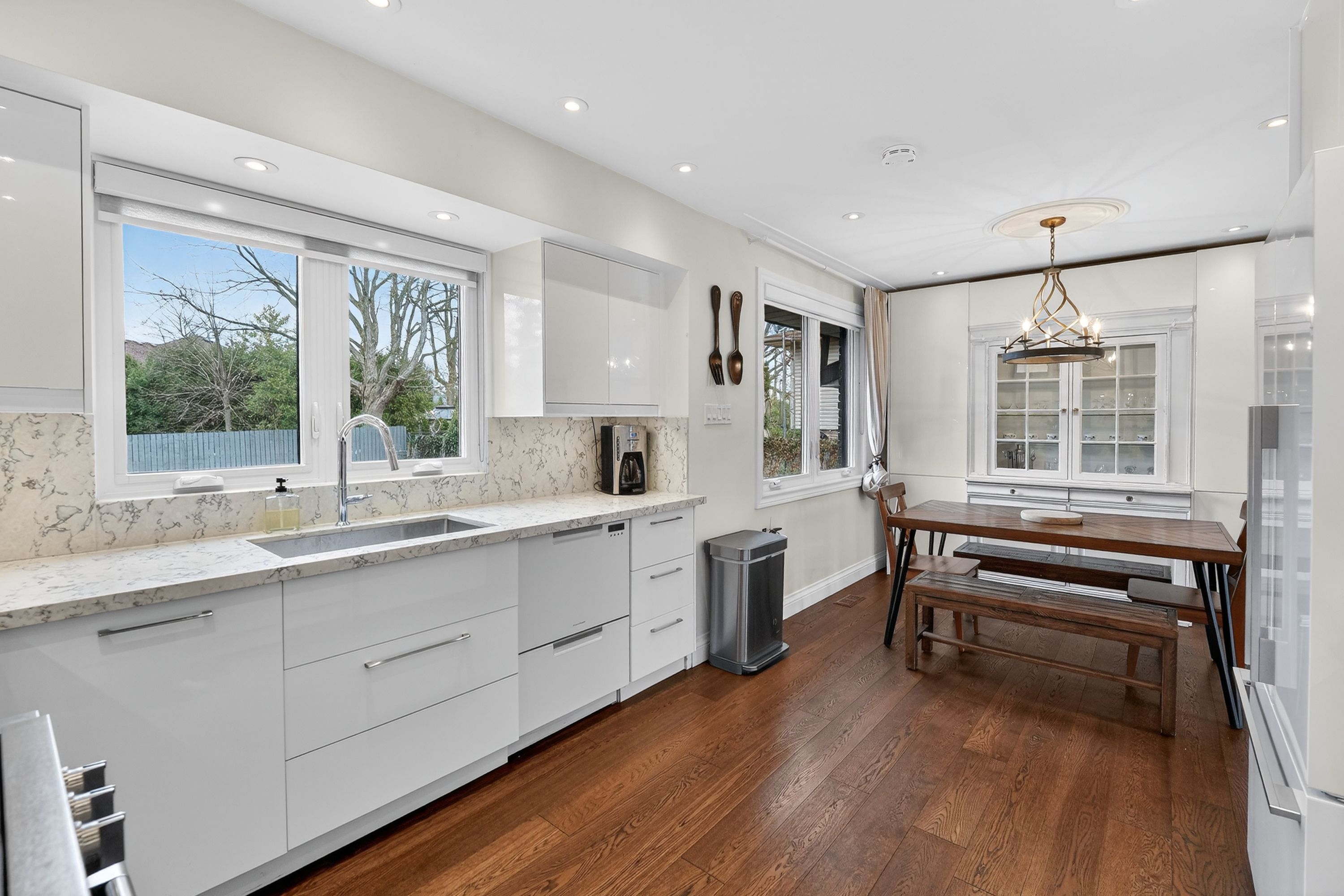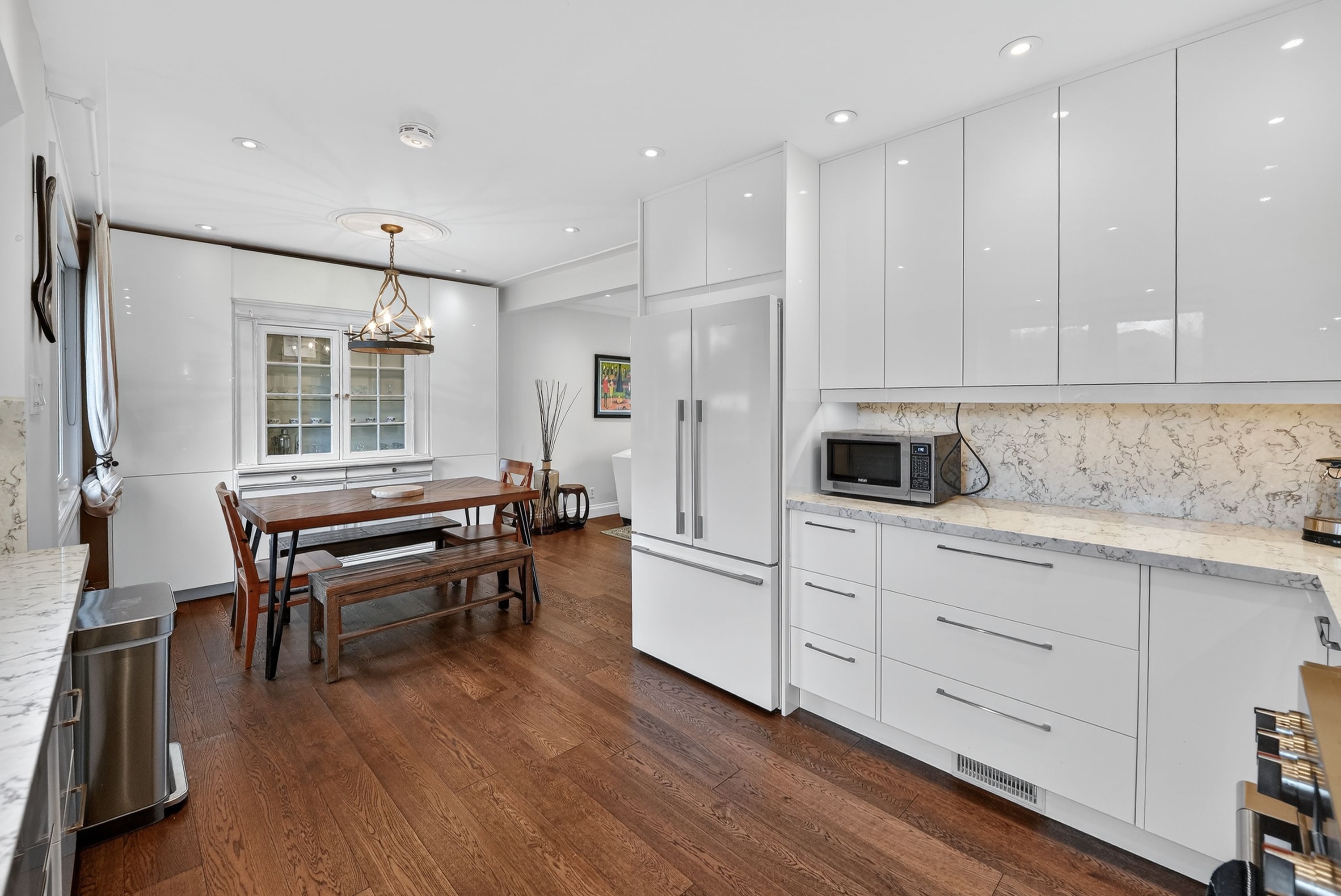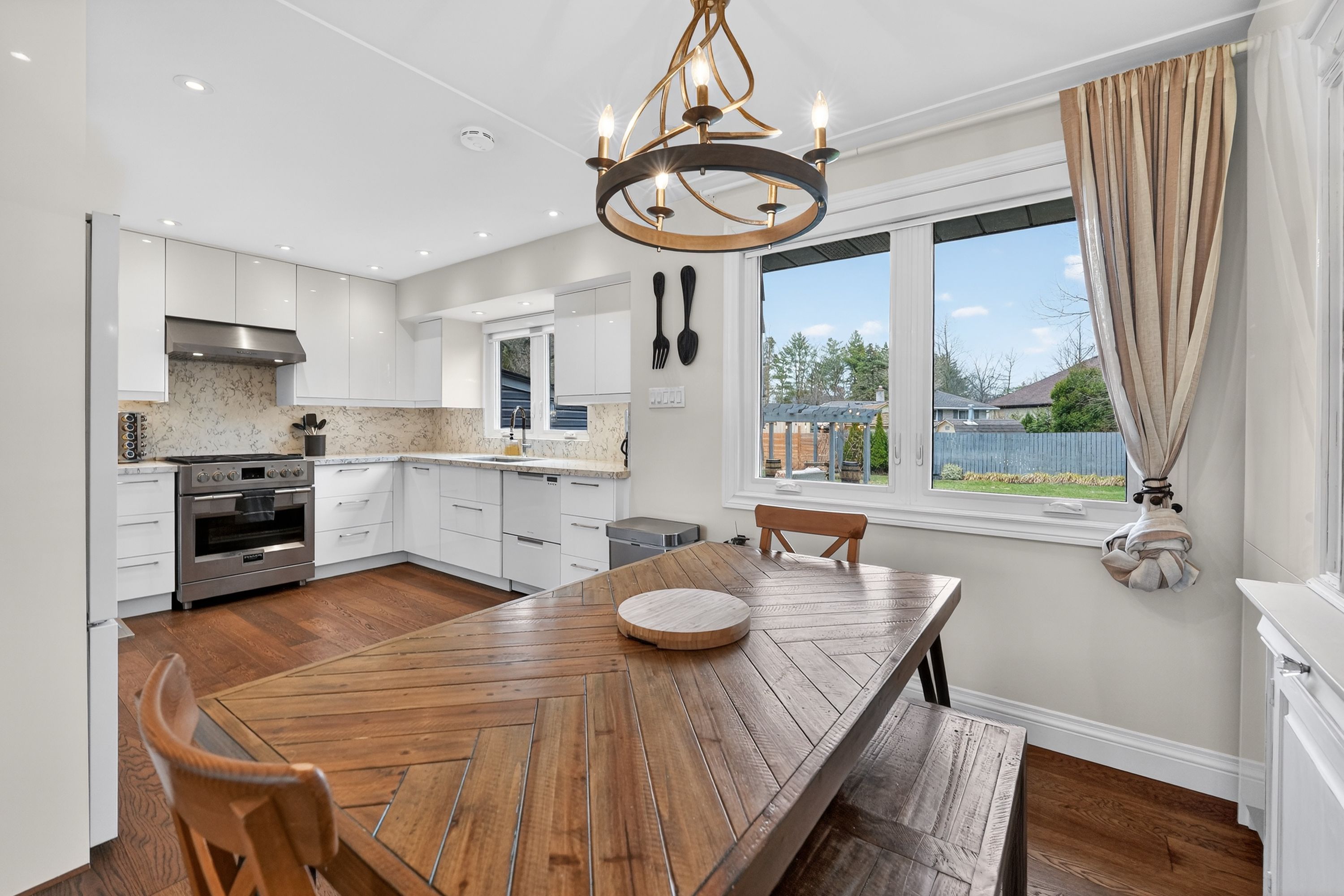 • Modern kitchen with high-end appliances and bright dining area.