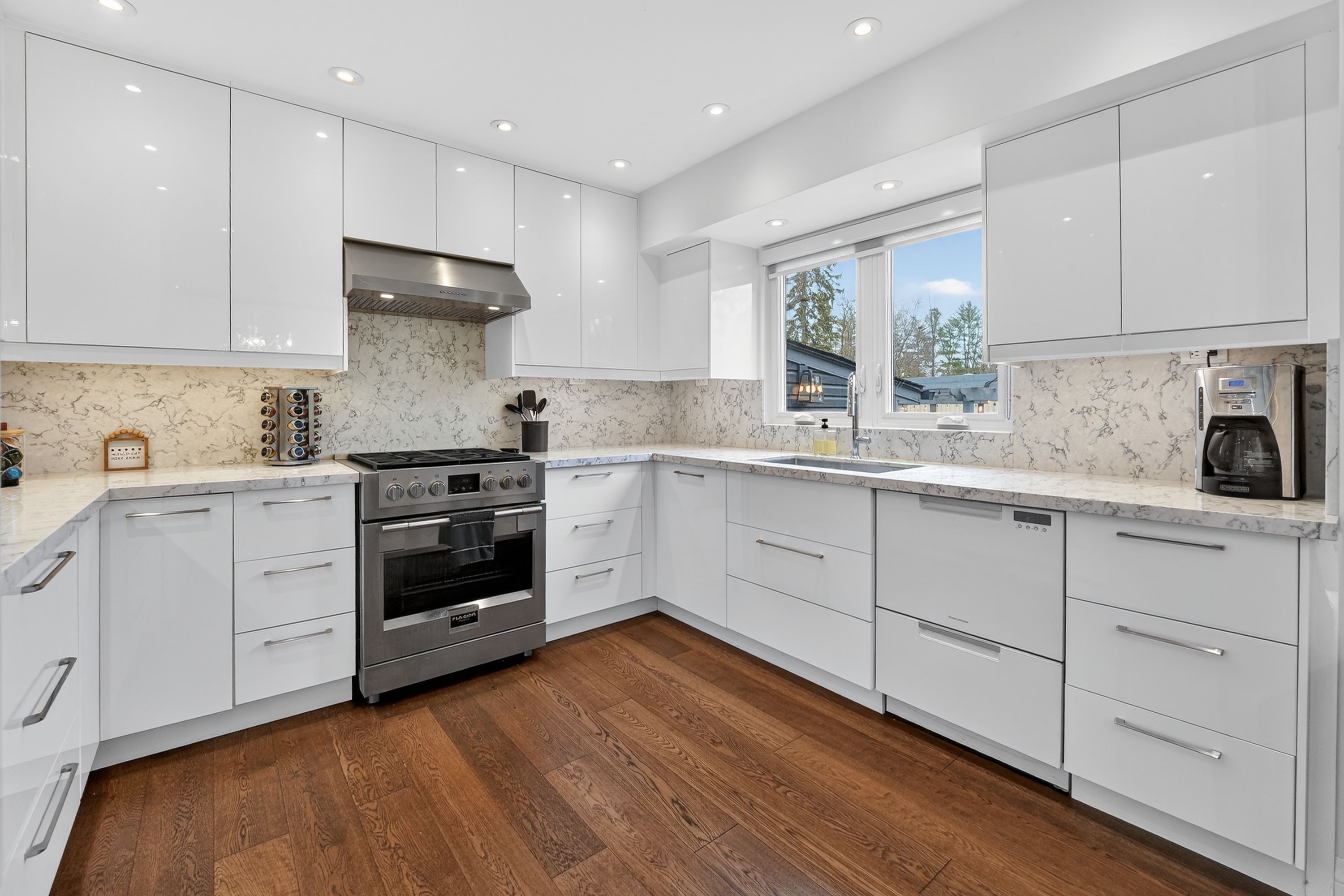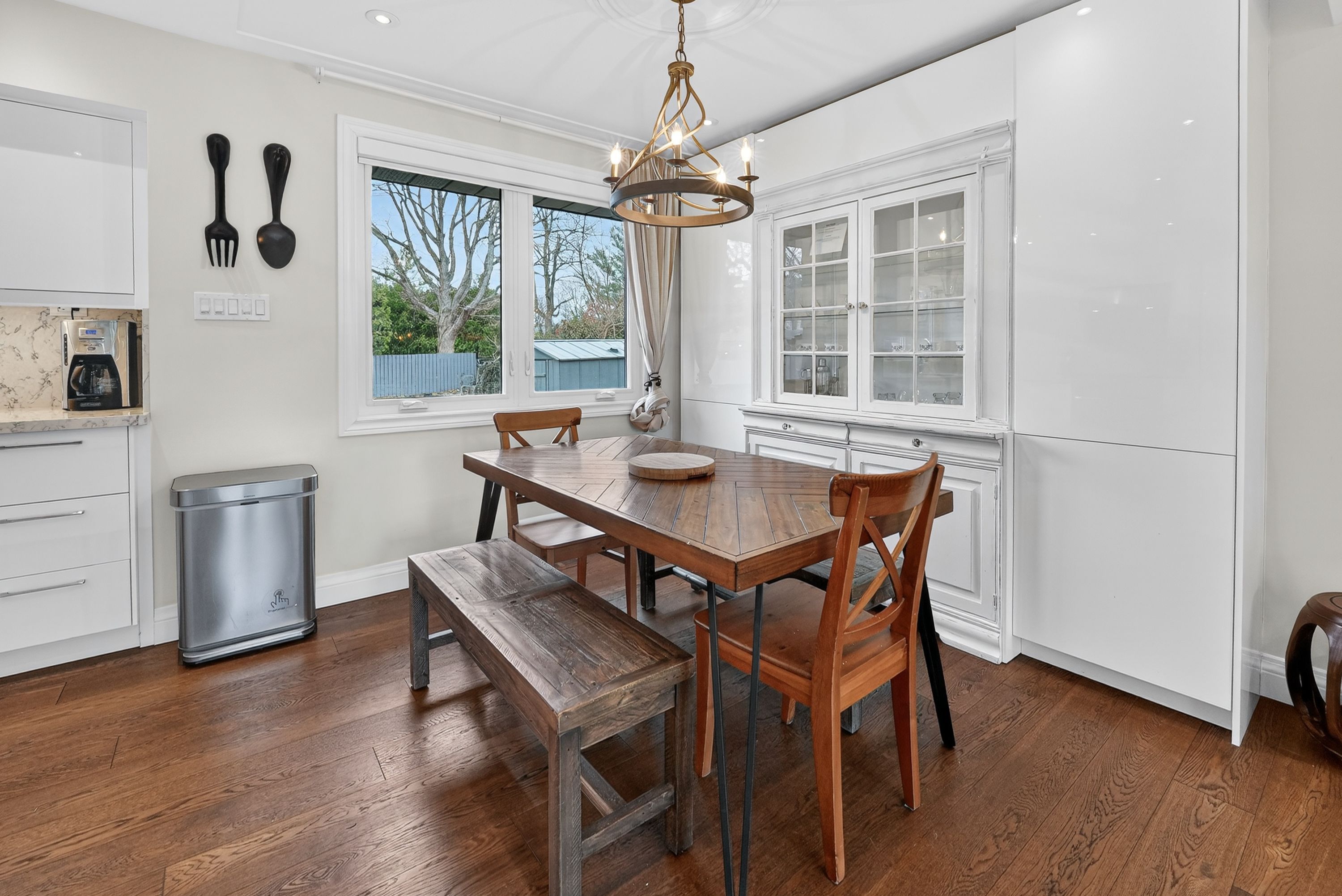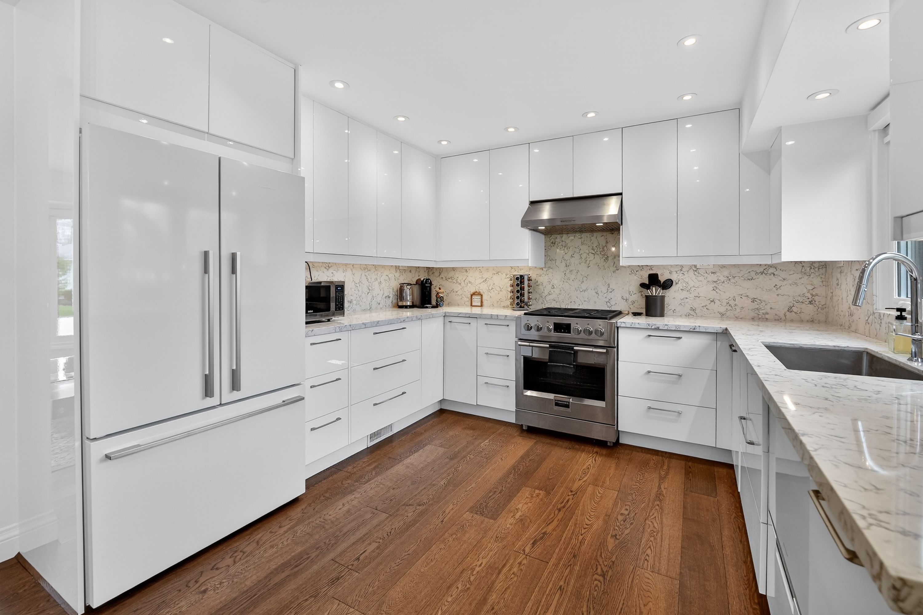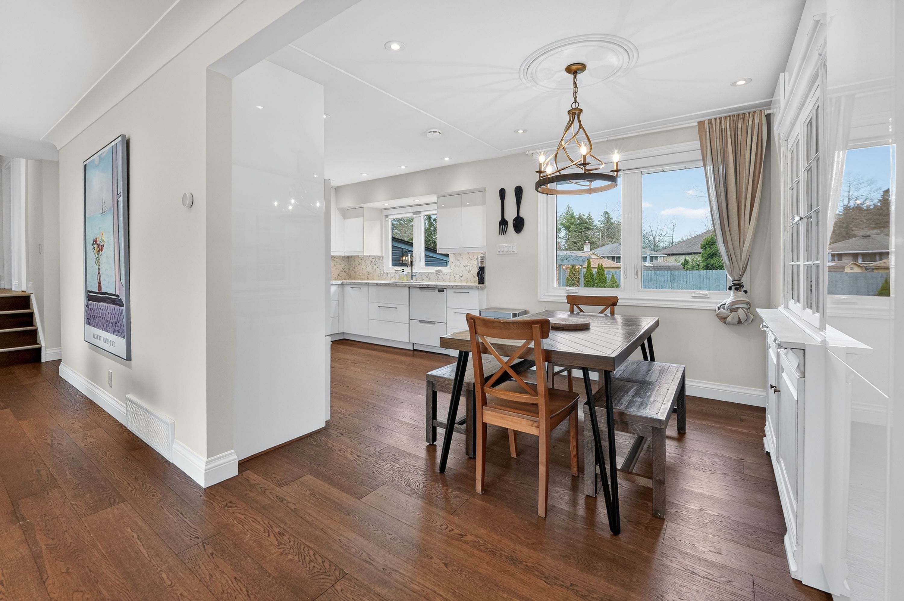 • Modern kitchen with high-end appliances and bright dining area.