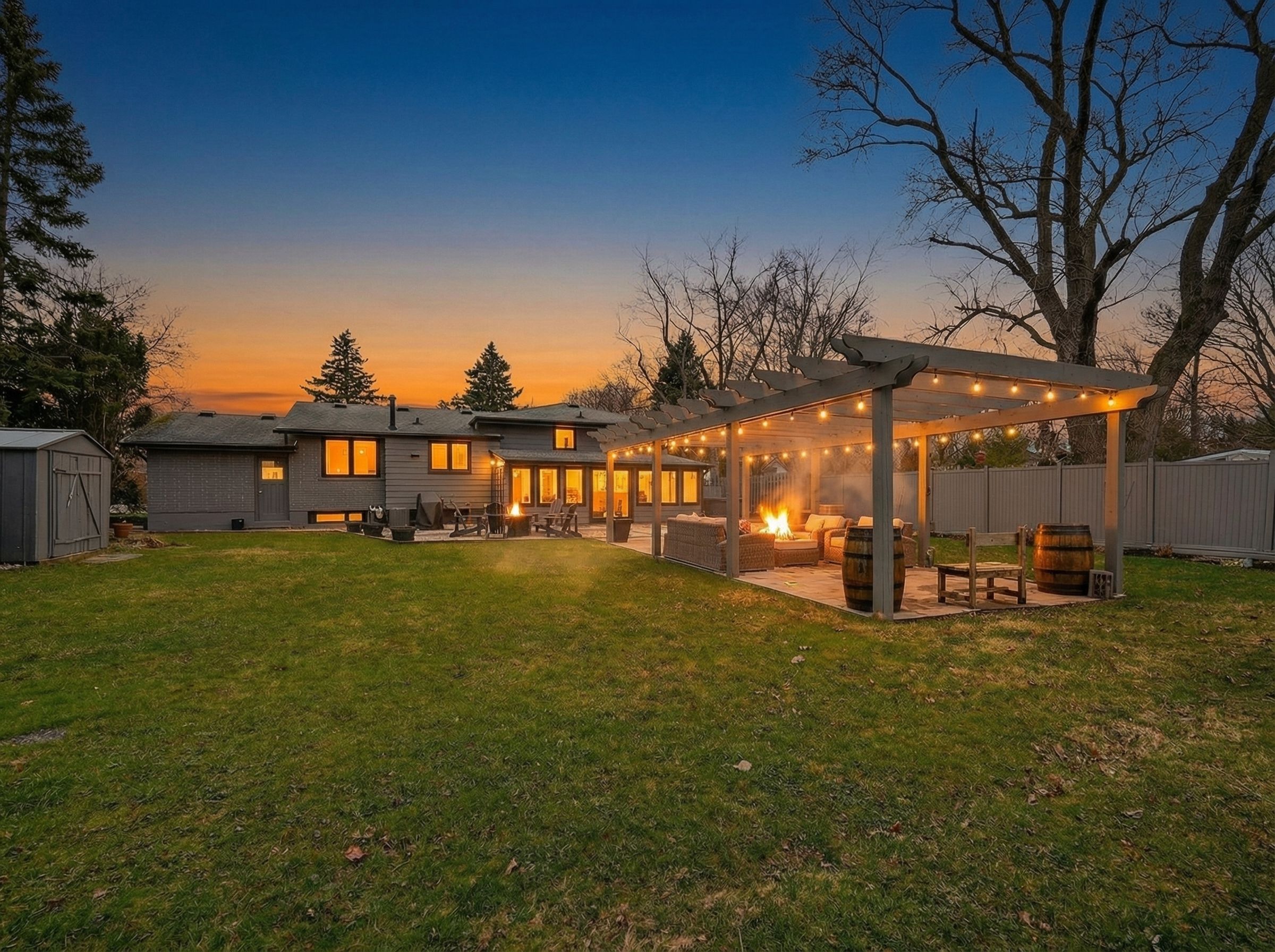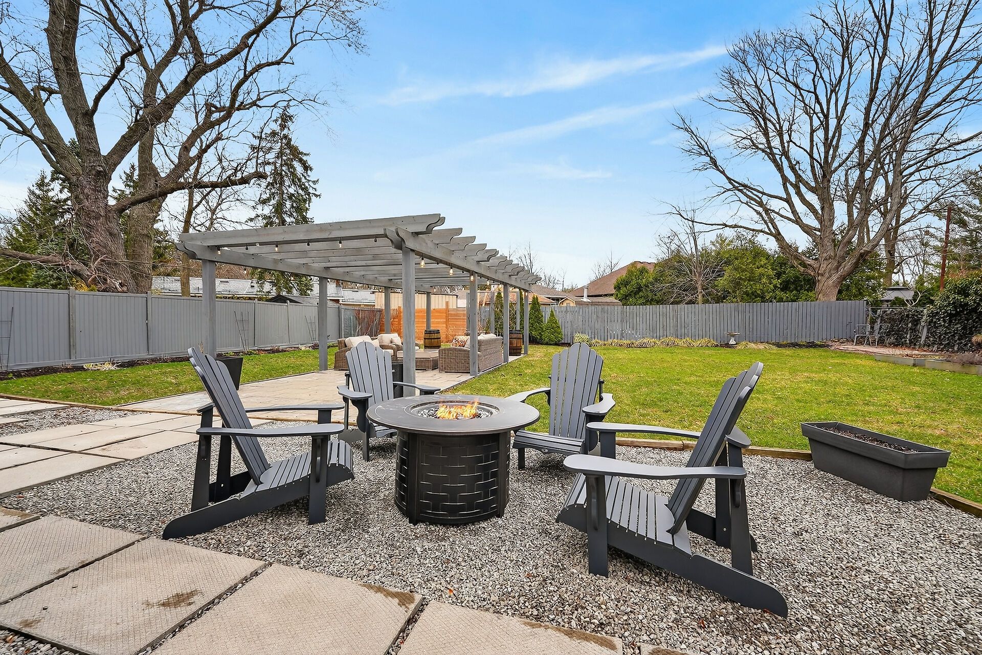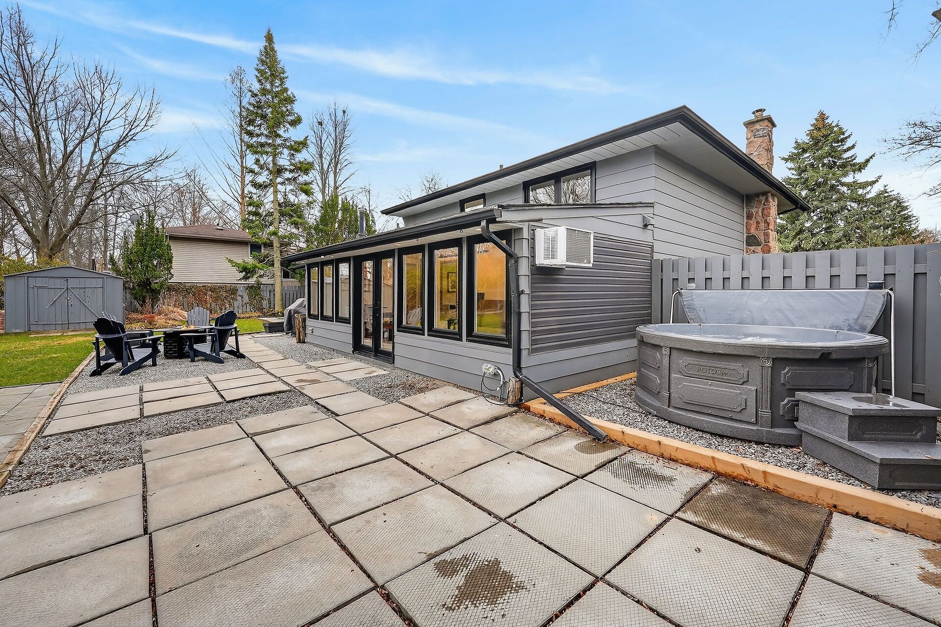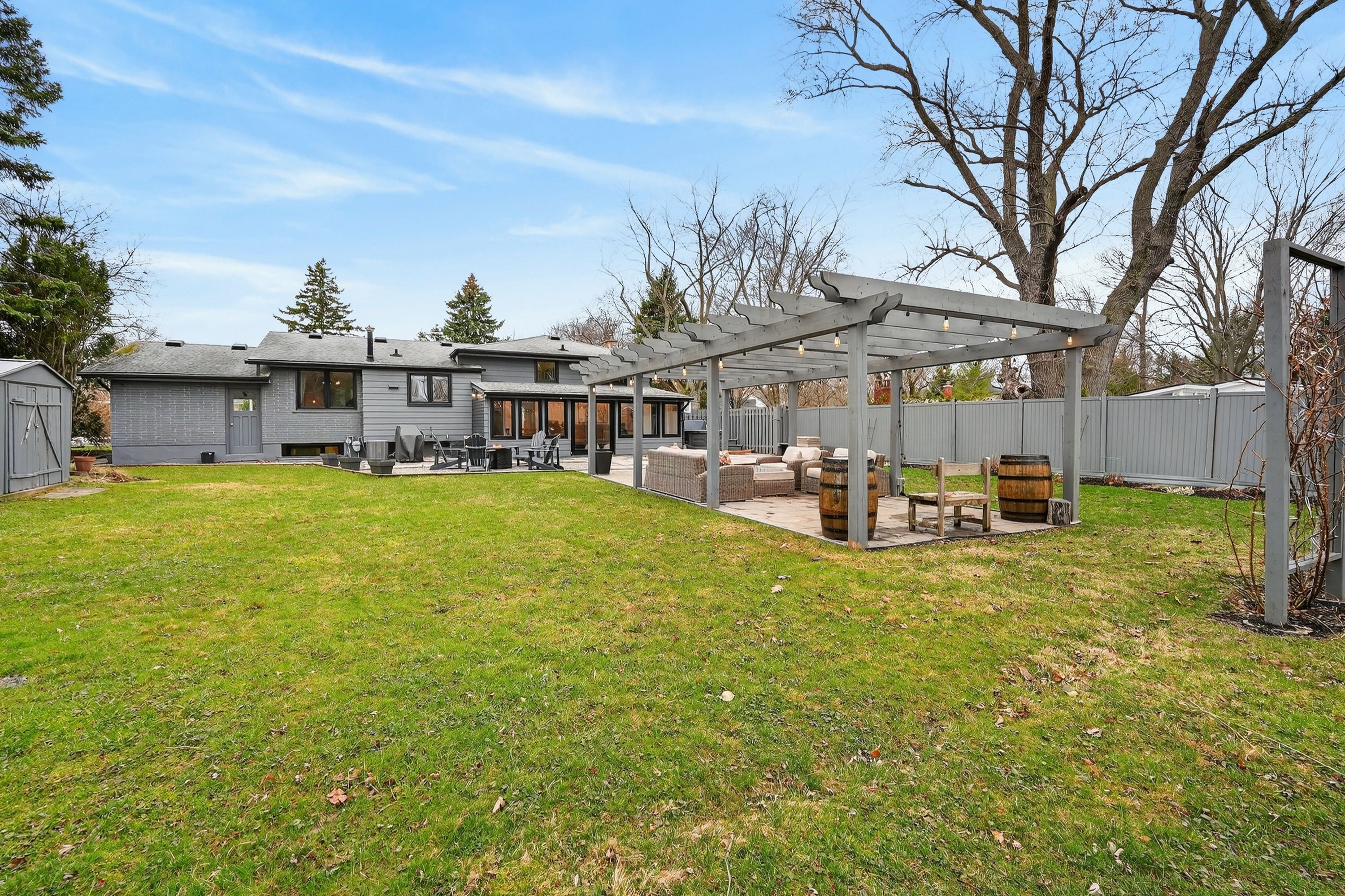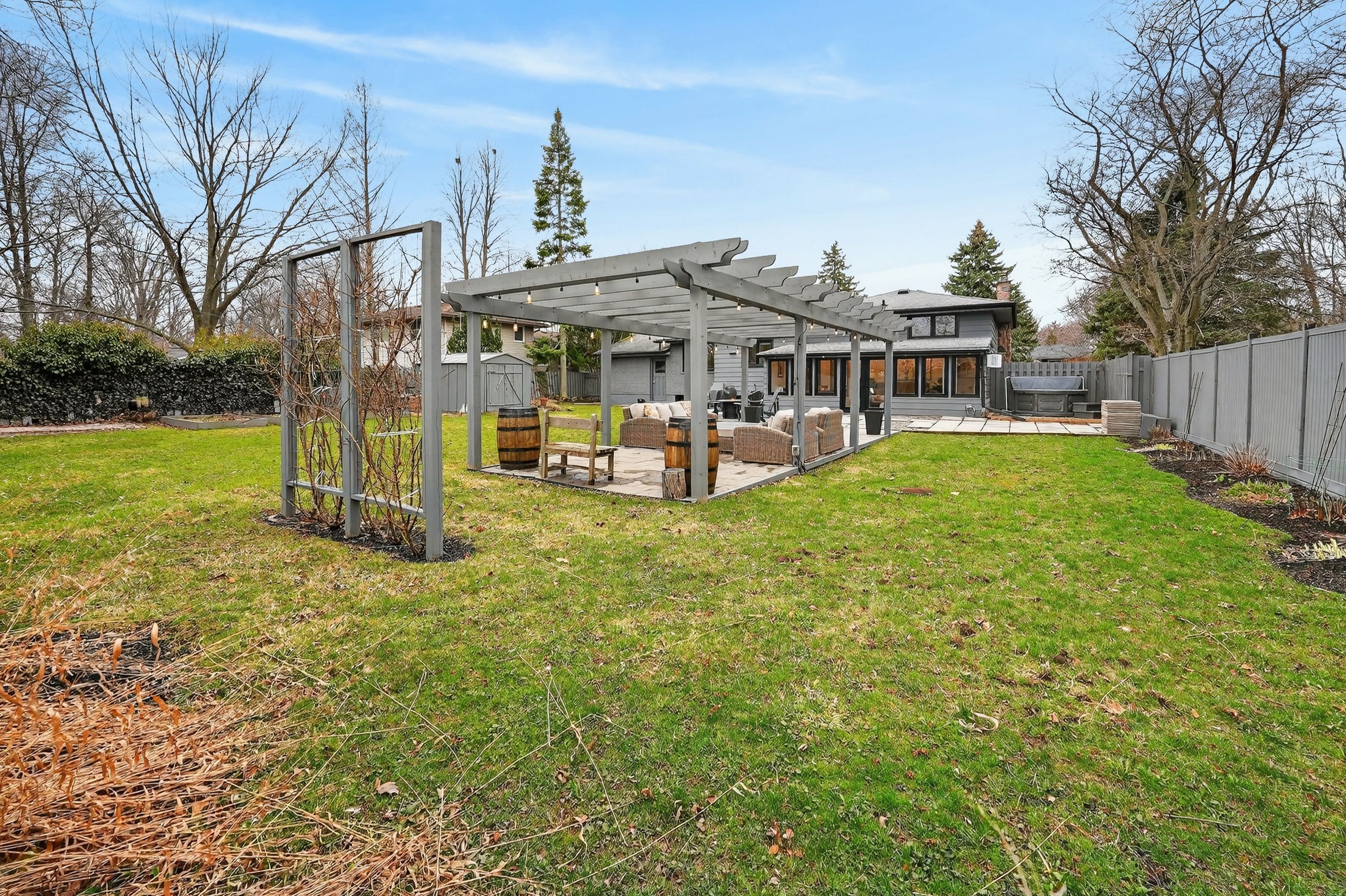 • Large private backyard with a pergola and hot tub.