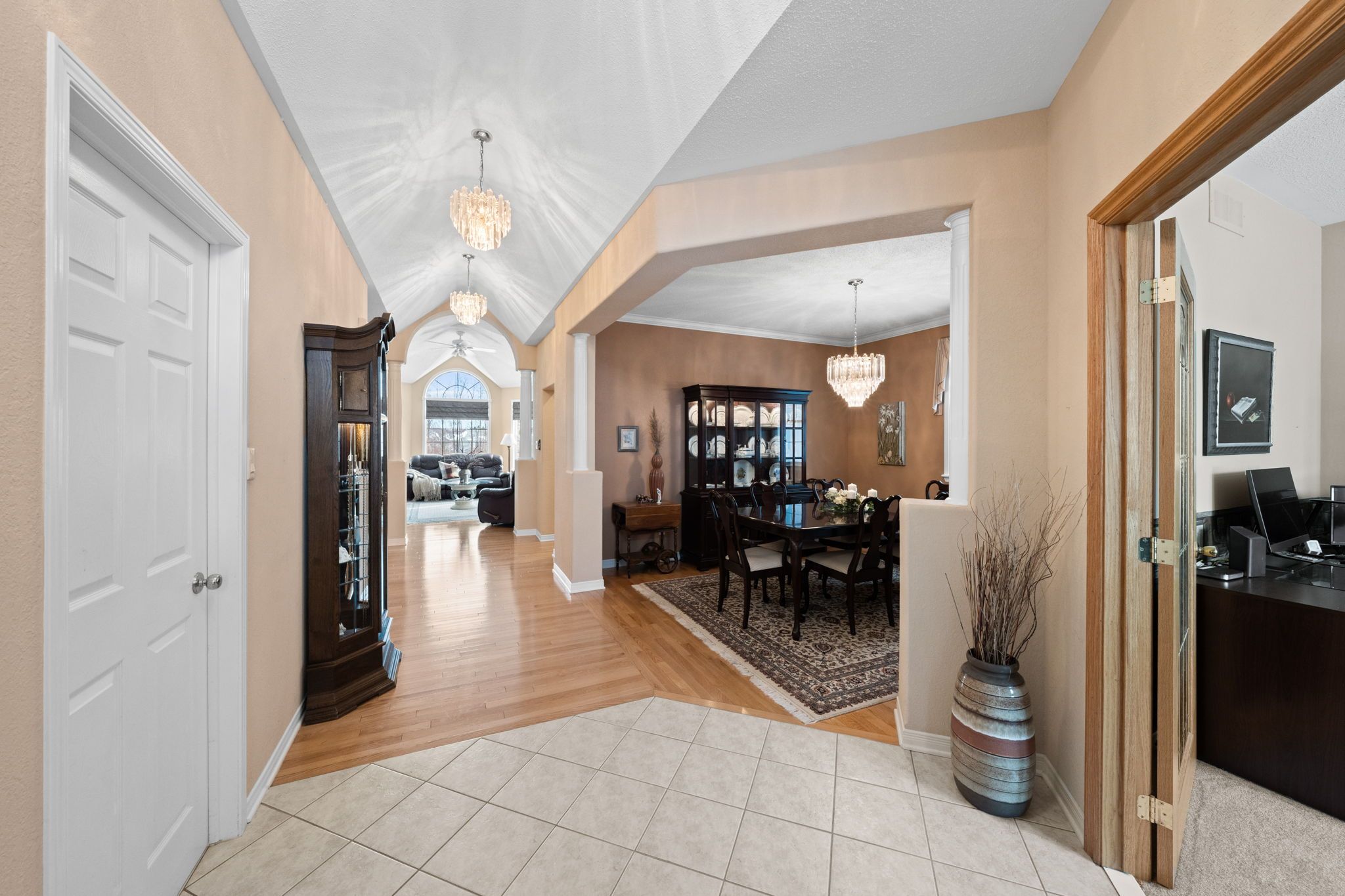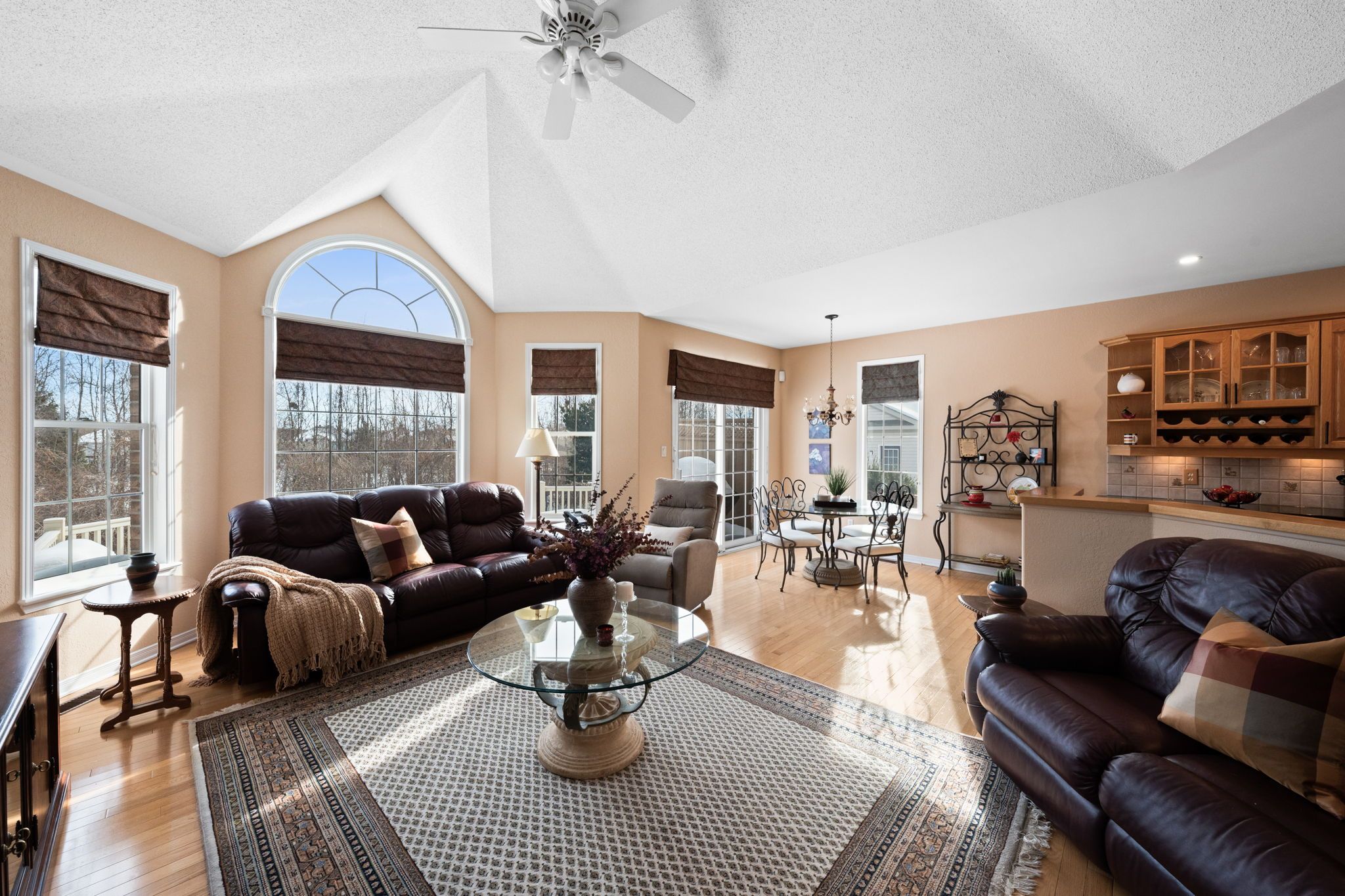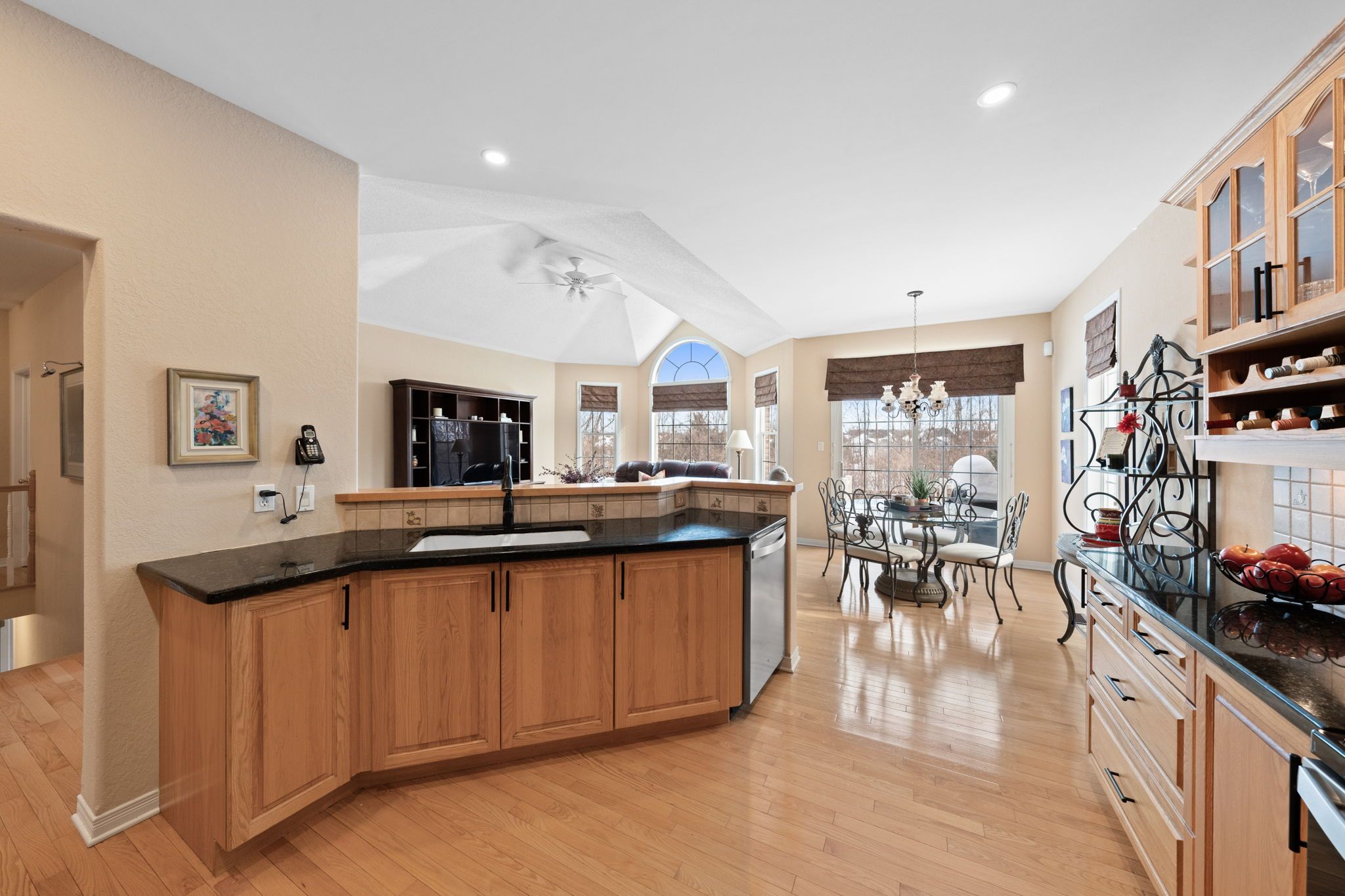 • Open concept living area with sloped ceilings and spacious kitchen.
