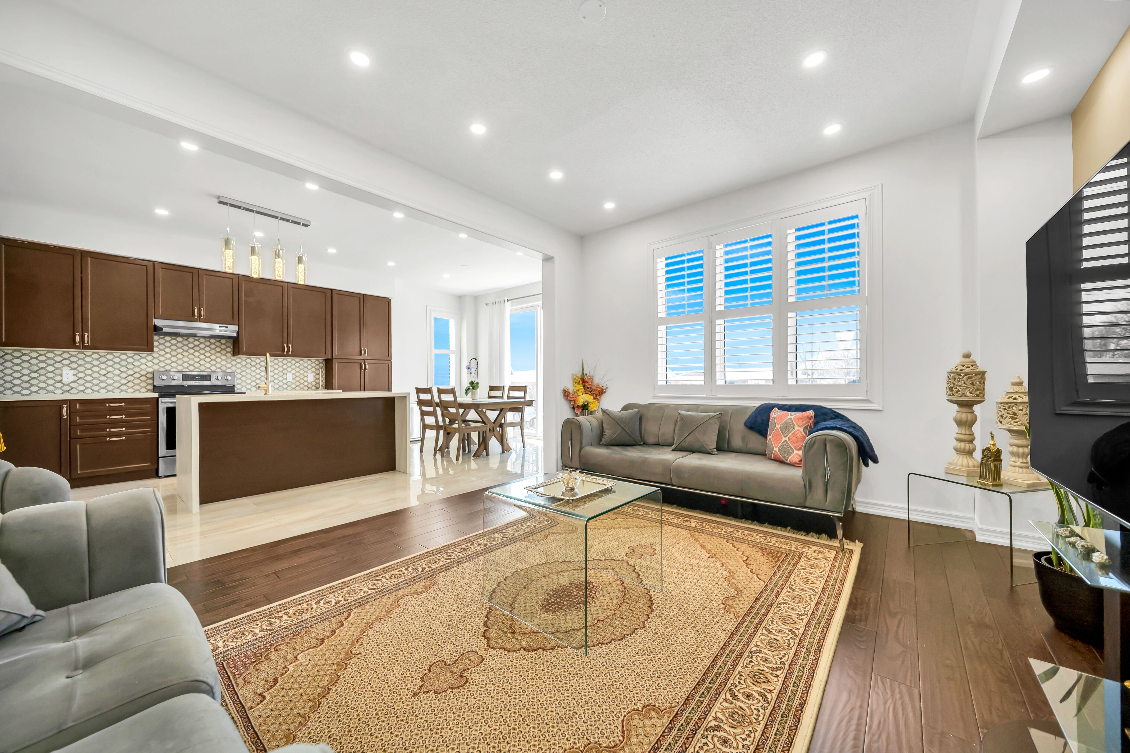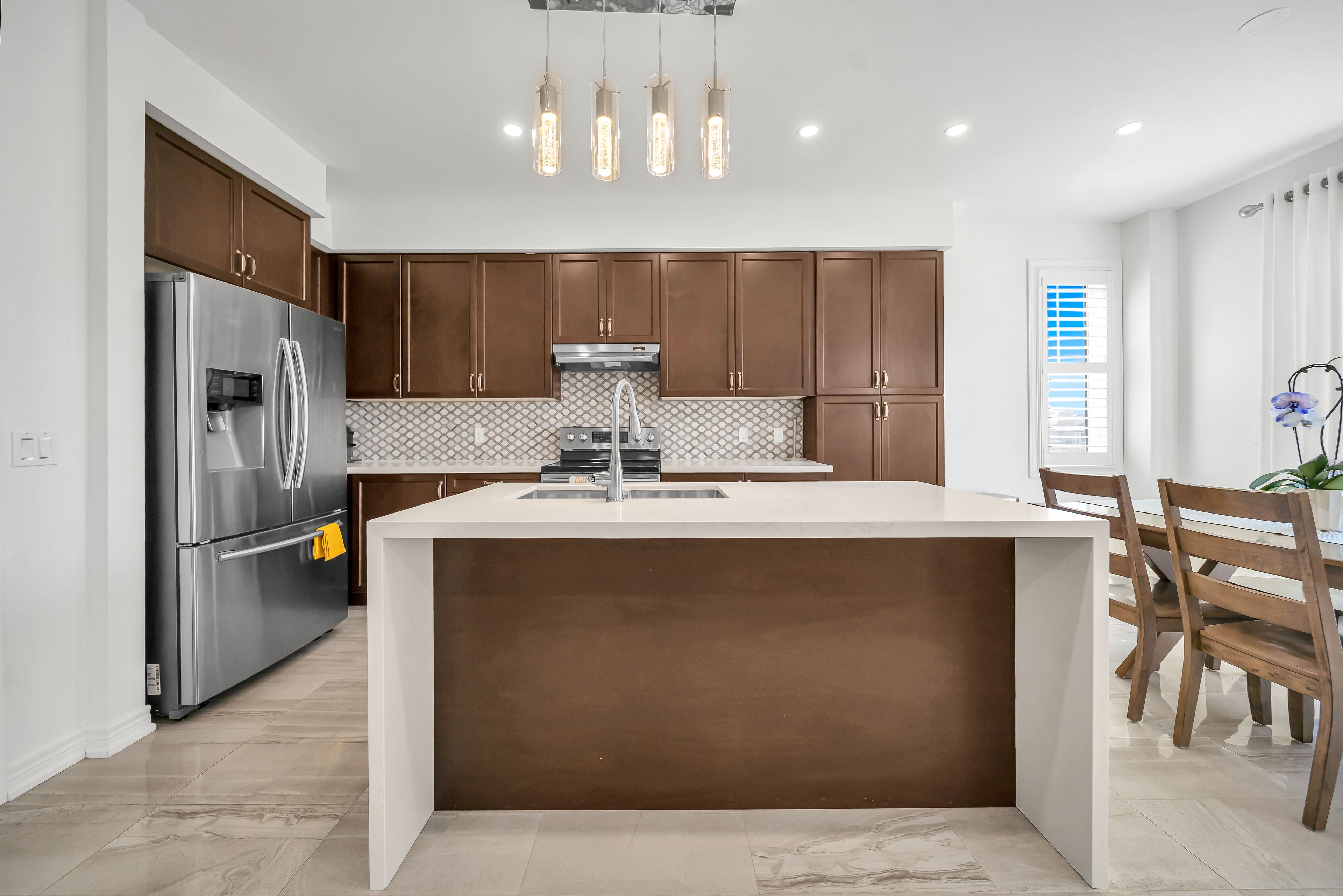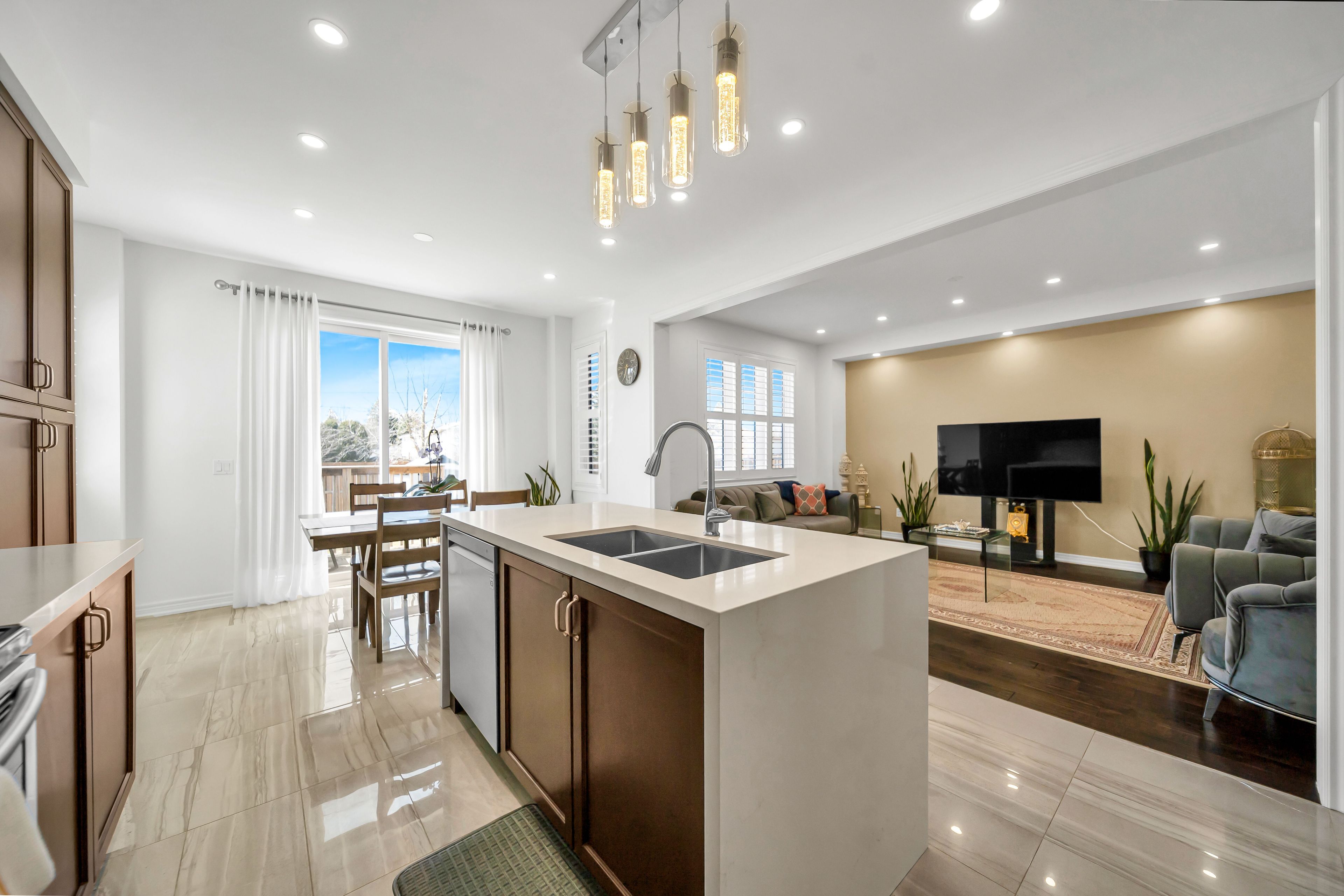• Stylish kitchen flows into an elegant dining and living area.