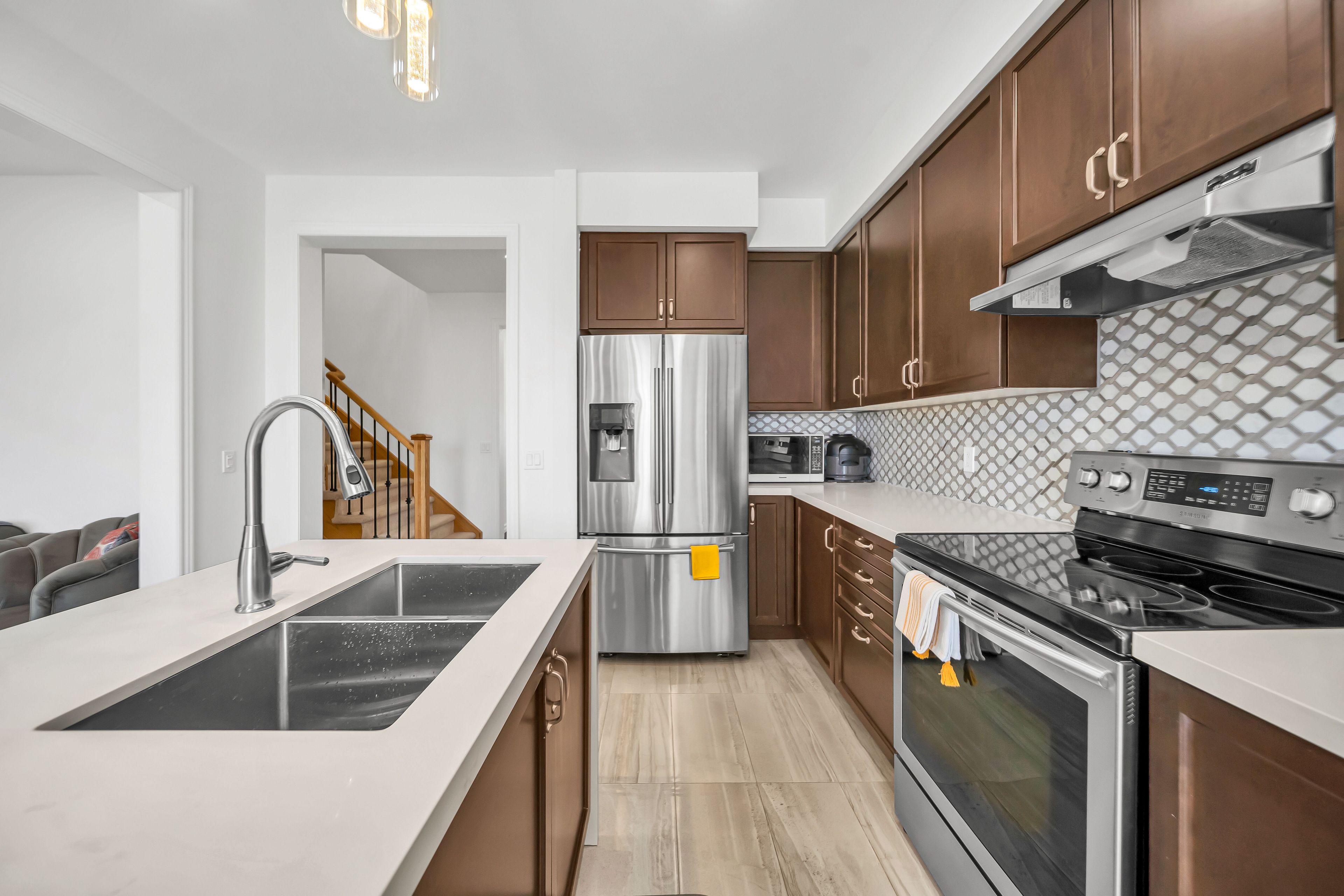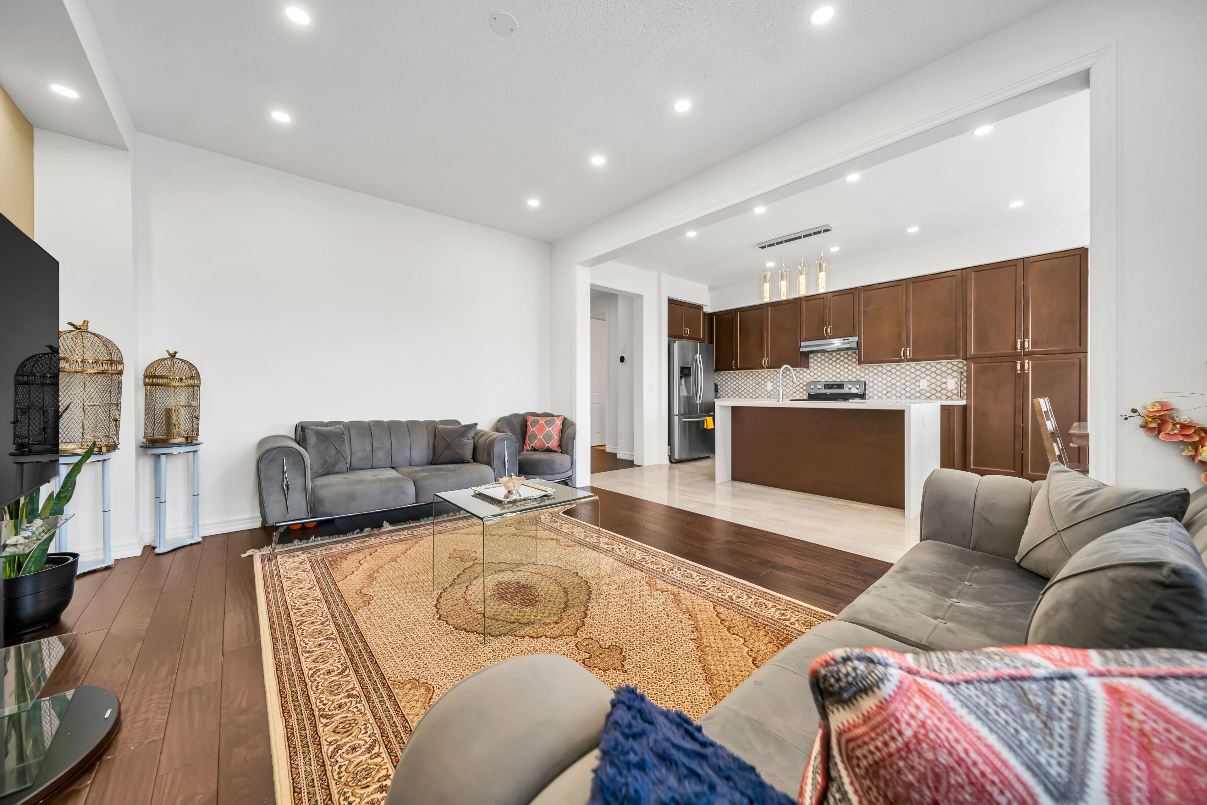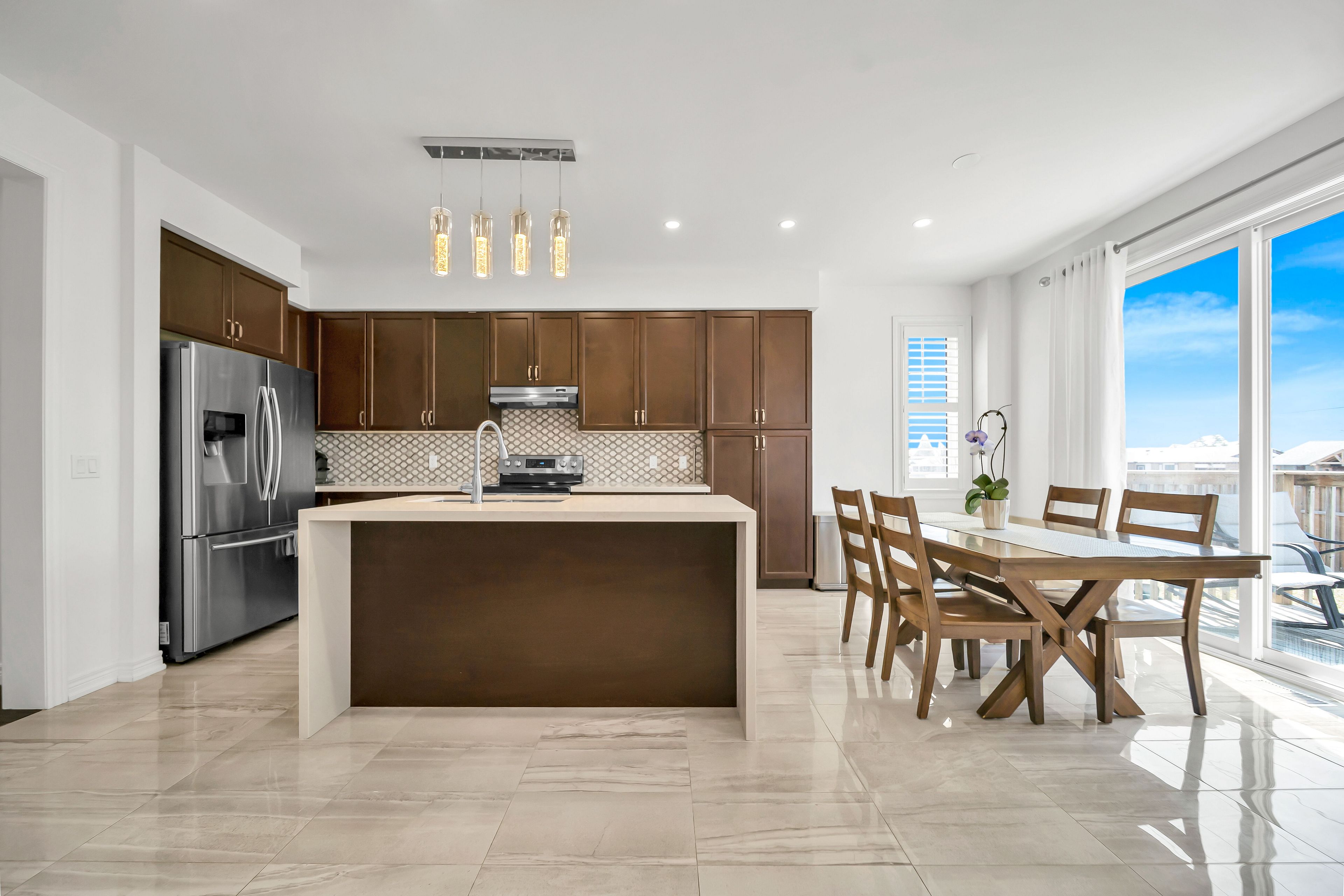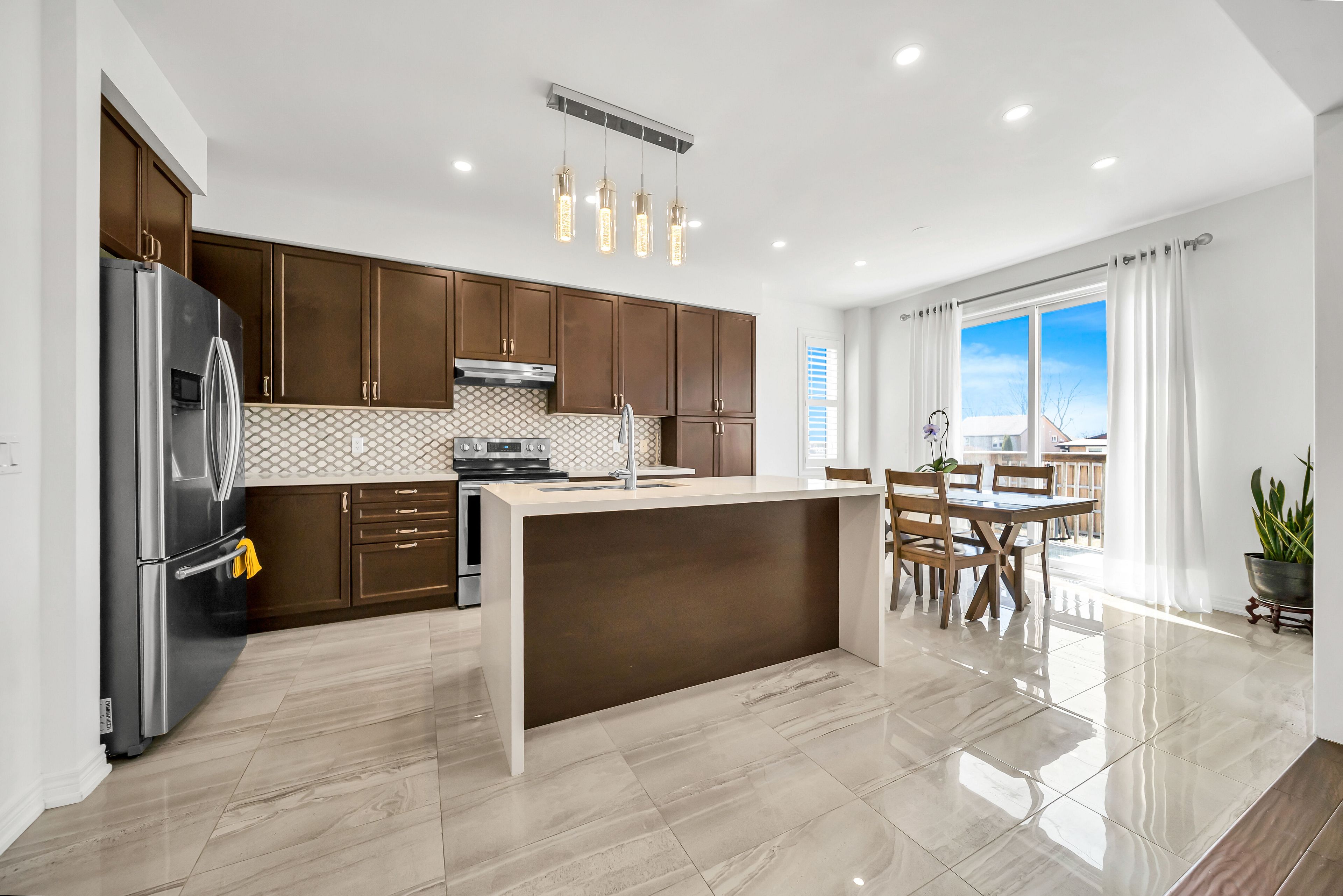 • Stylish kitchen flows into an elegant dining and living area.