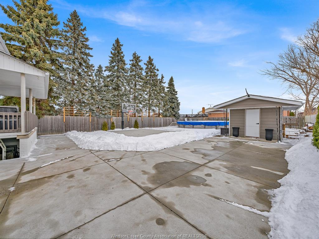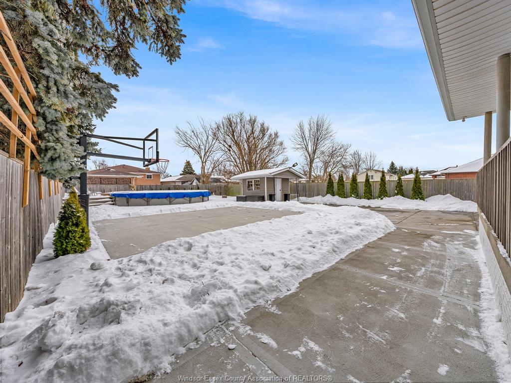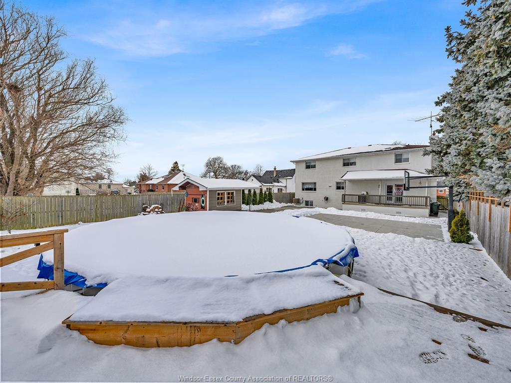• Fenced yard features an above-ground pool and two-car garage.