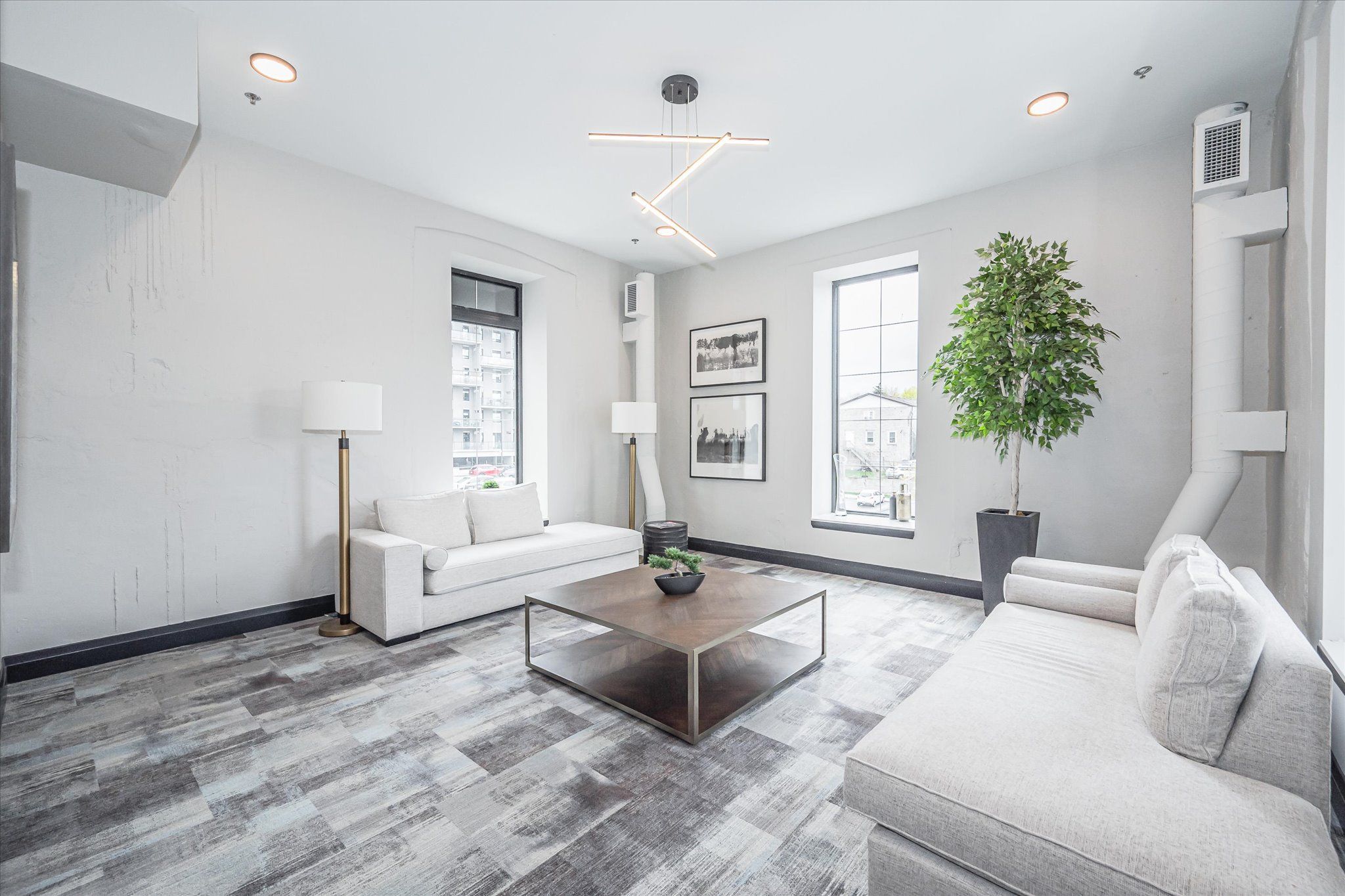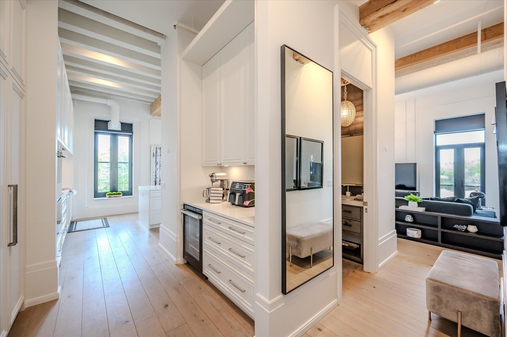 • Bright corner unit with 12' ceilings and oversized windows for scenic views.