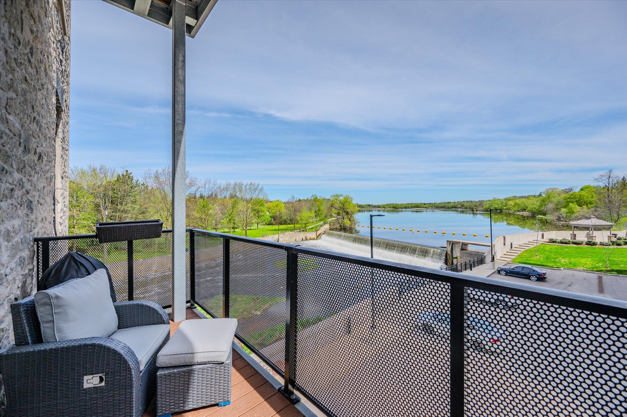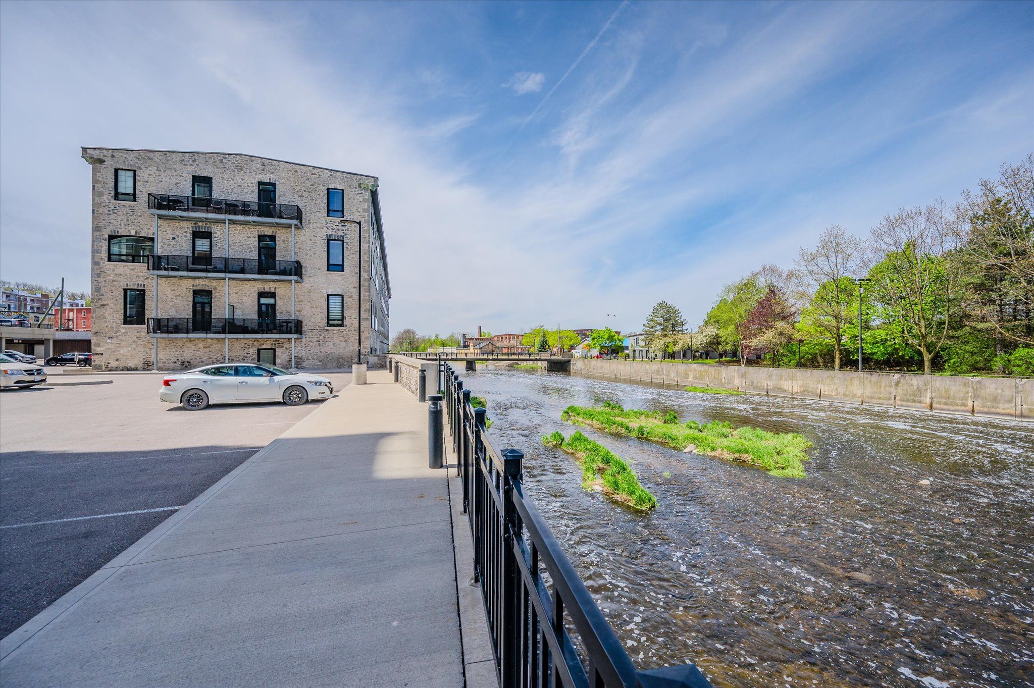 Welcome to riverbank lofts, a boutique historic stone conversion on the speed river in the heart of hespeler village. This rare corner unit offers luxury with 12' ceilings, exposed beams, and oversized windows showcasing river and waterfall views. Featuring 2 bedrooms with private ensuites, a powder room, and a show-stopping 18' island kitchen with built-in appliances, servery, and pantry. High-end finishes include european white oak flooring, heated floors in baths and laundry, custom built-ins, automatic blinds, and designer lighting. One of only three units with a private river-view balcony and a 2-car garage. Enjoy amenities like a fitness centre, common lounges, bike storage, and direct access to trails and the river. Steps to shops, restaurants, and cafes, with easy access to hwy 401-this is elevated loft living in one of cambridge's most desirable locations.