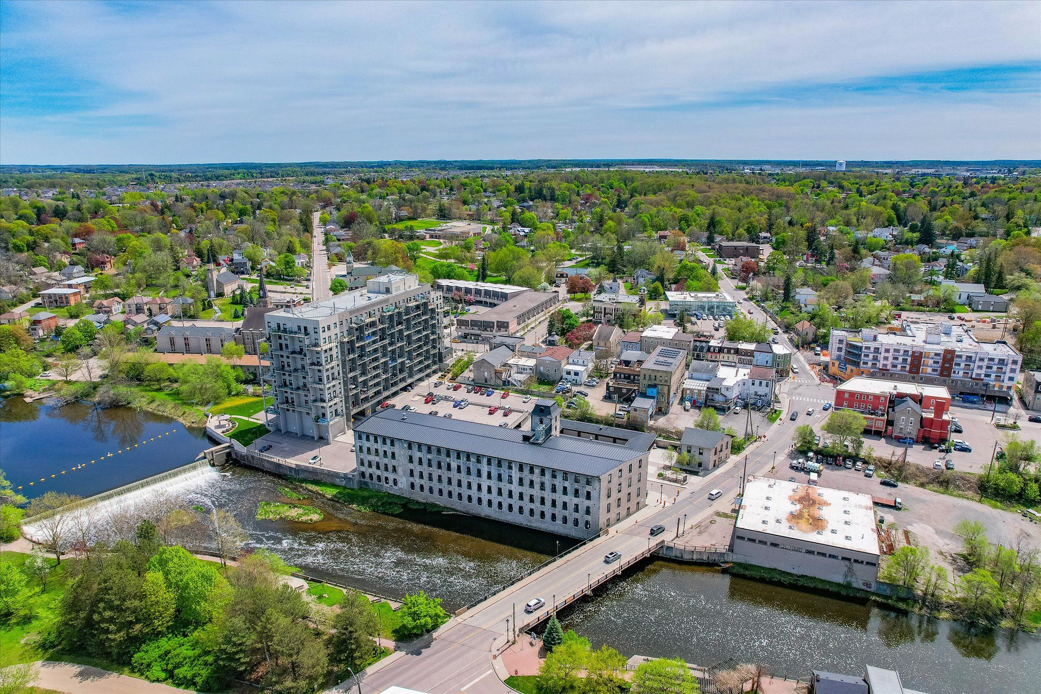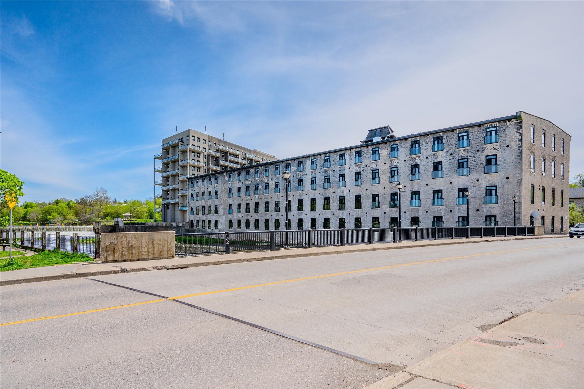 Welcome to riverbank lofts, a boutique historic stone conversion on the speed river in the heart of hespeler village. This rare corner unit offers luxury with 12' ceilings, exposed beams, and oversized windows showcasing river and waterfall views. Featuring 2 bedrooms with private ensuites, a powder room, and a show-stopping 18' island kitchen with built-in appliances, servery, and pantry. High-end finishes include european white oak flooring, heated floors in baths and laundry, custom built-ins, automatic blinds, and designer lighting. One of only three units with a private river-view balcony and a 2-car garage. Enjoy amenities like a fitness centre, common lounges, bike storage, and direct access to trails and the river. Steps to shops, restaurants, and cafes, with easy access to hwy 401-this is elevated loft living in one of cambridge's most desirable locations.
