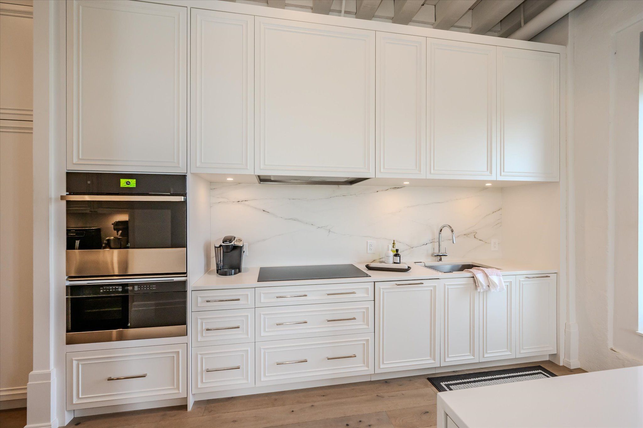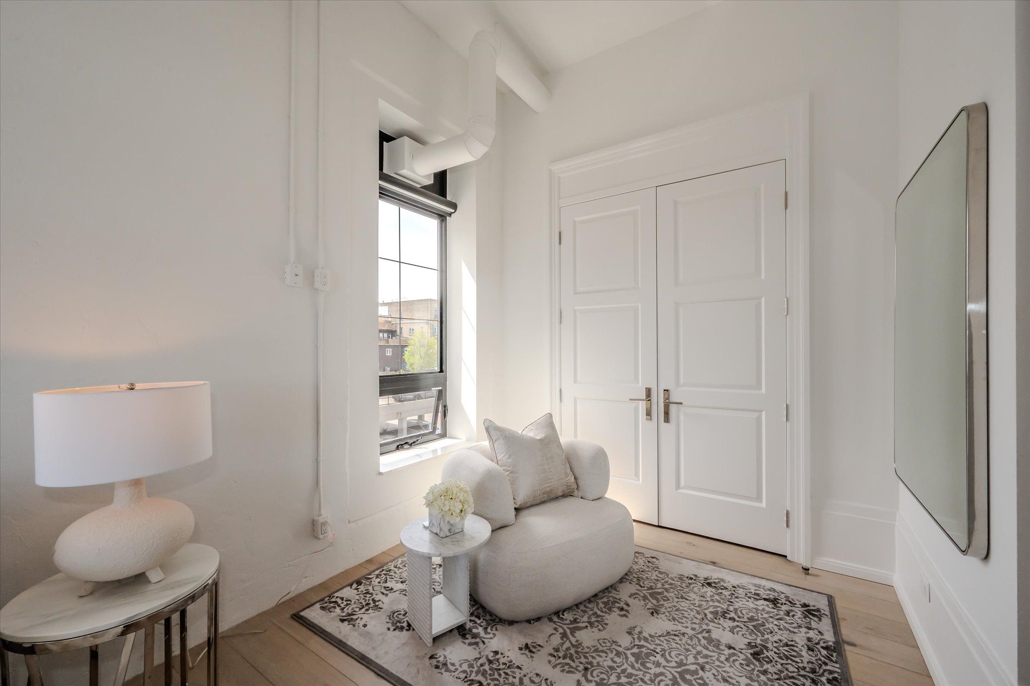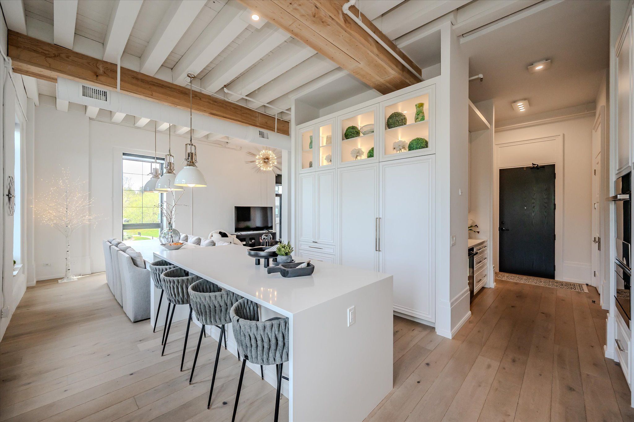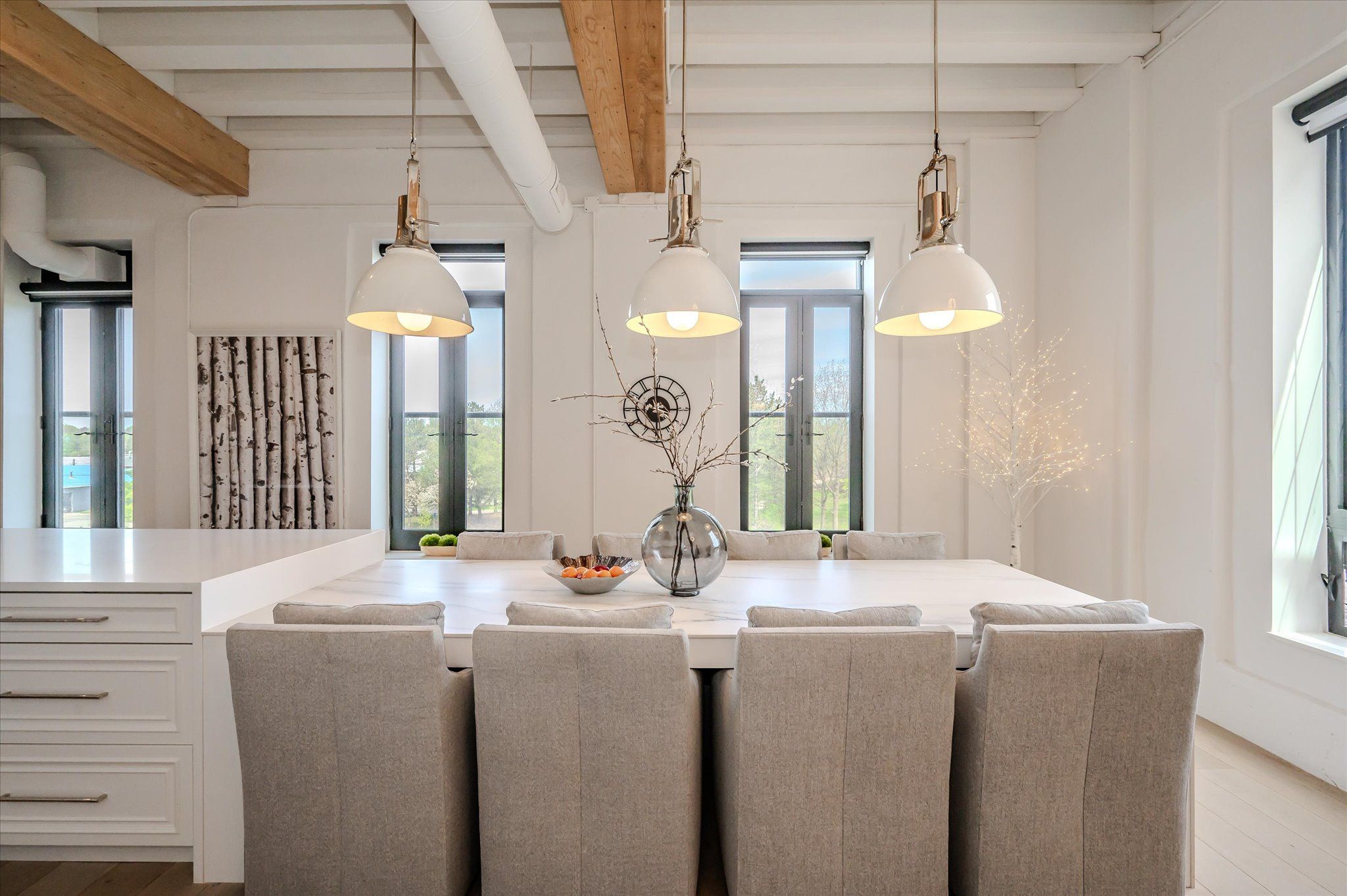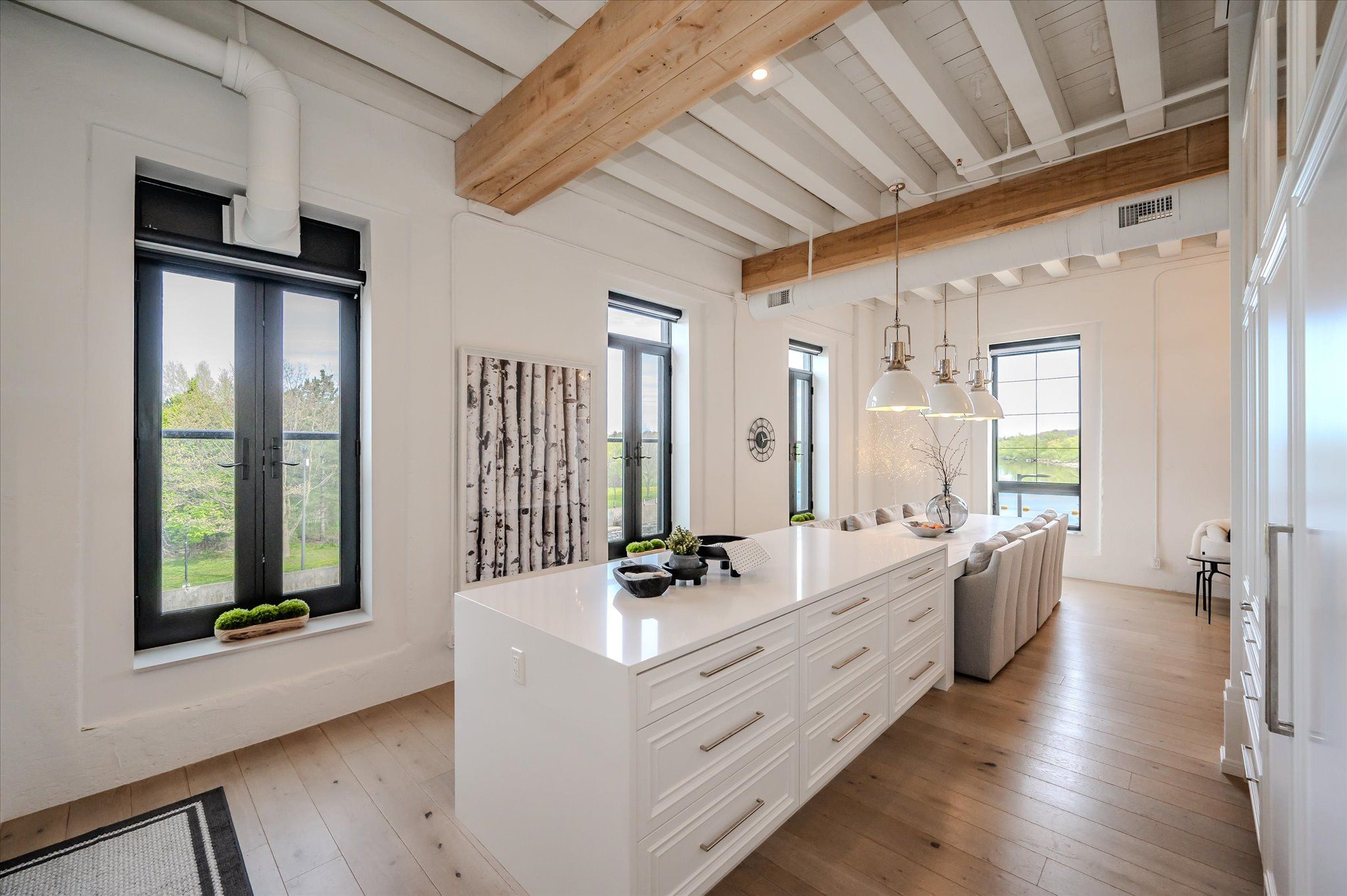 • Luxurious features like 12' ceilings, exposed beams, and oversized windows.