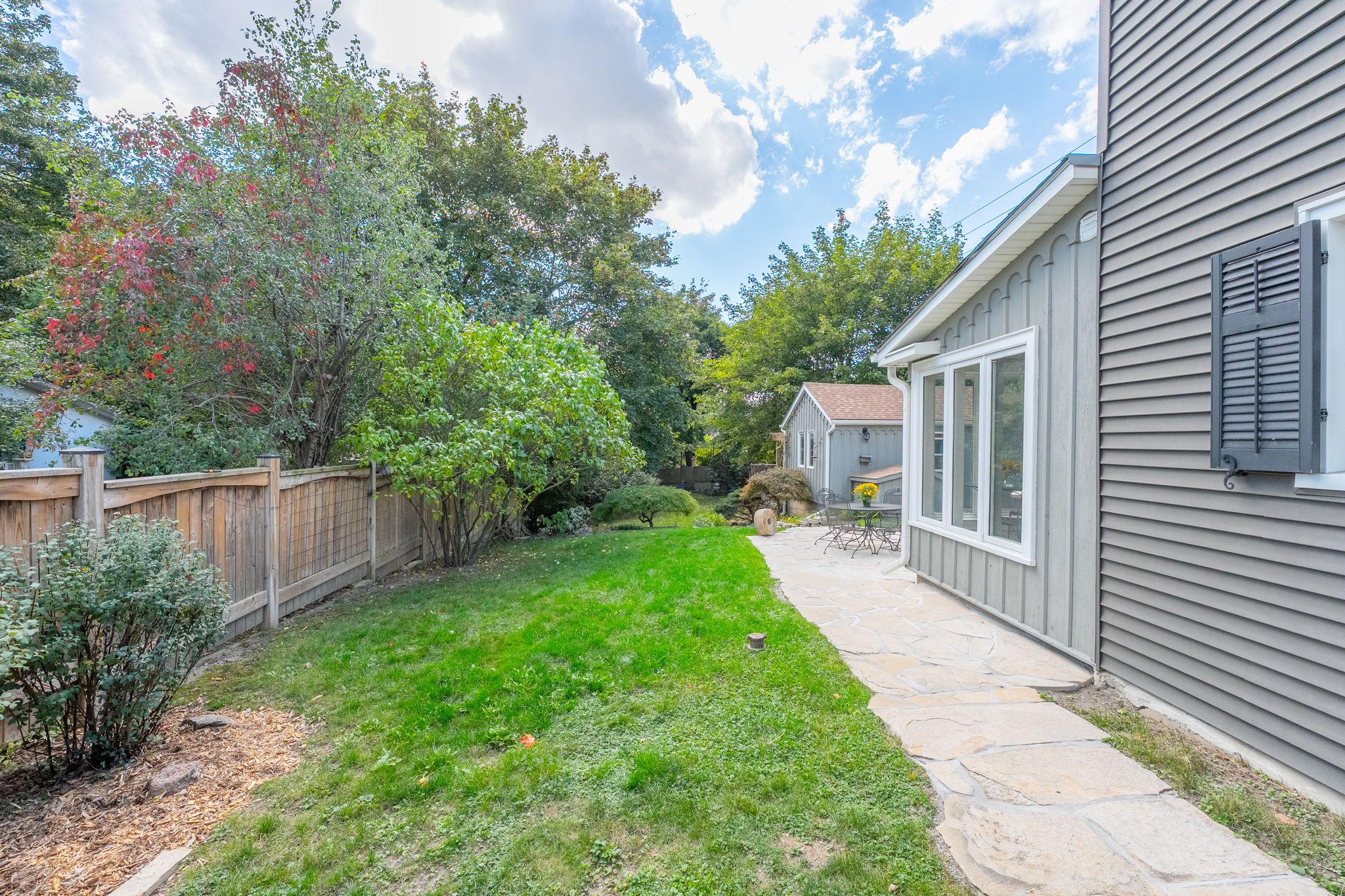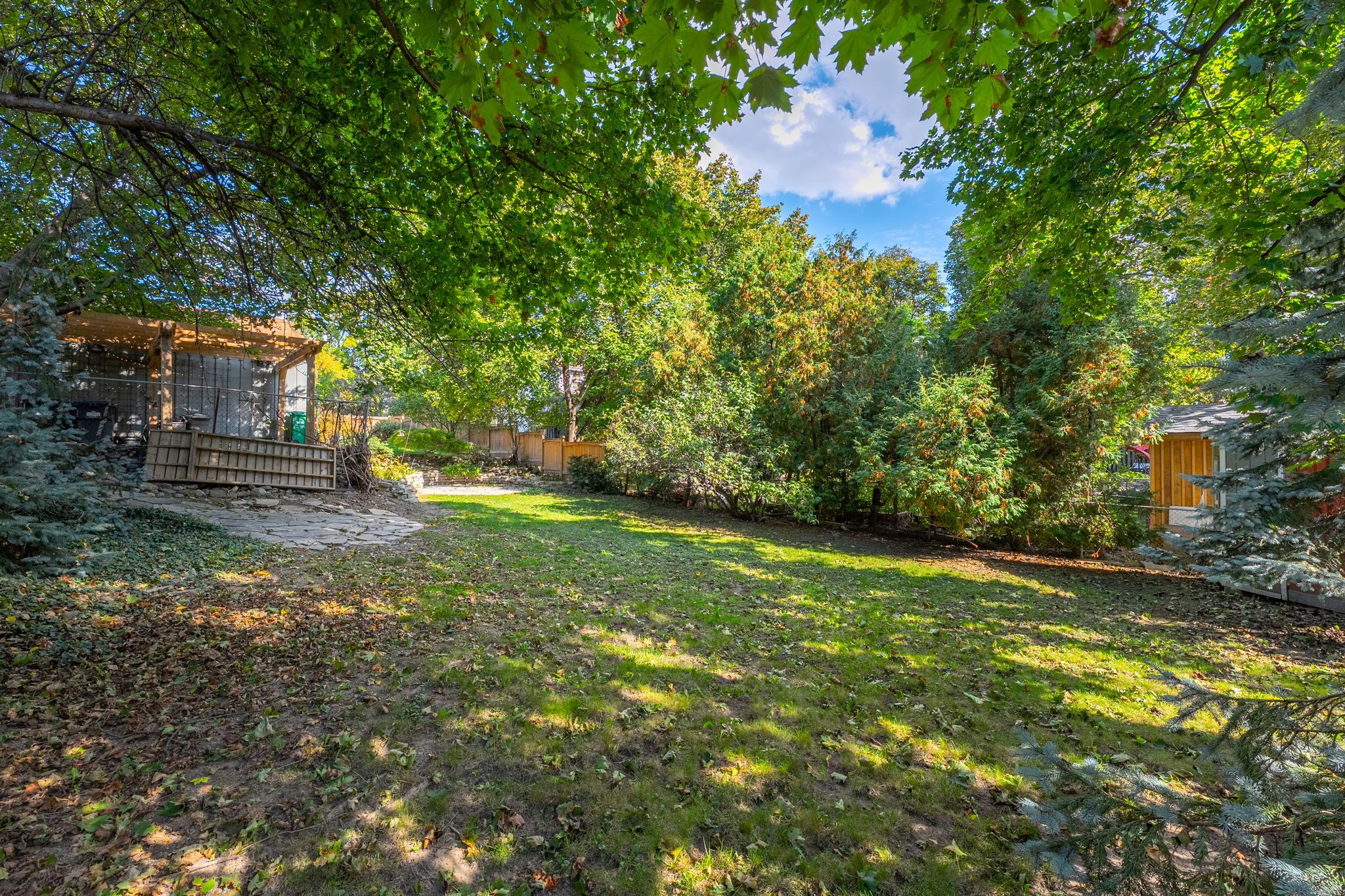 • Large corner lot with tiered patios, mature trees, and a private yard.