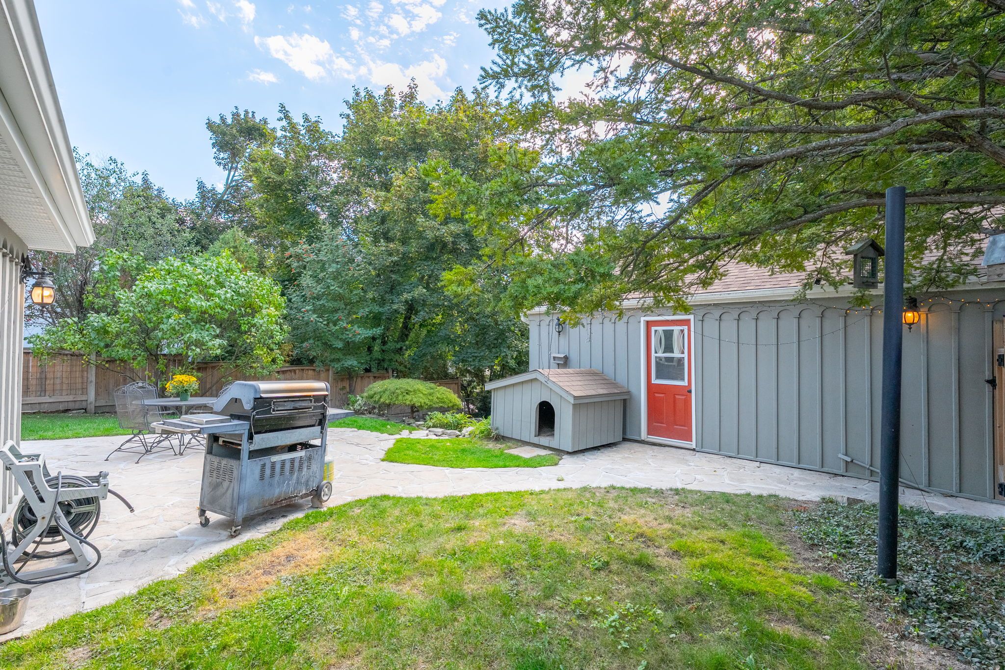 • Detached garage for vehicle storage or hobby space, plus a dog house.
