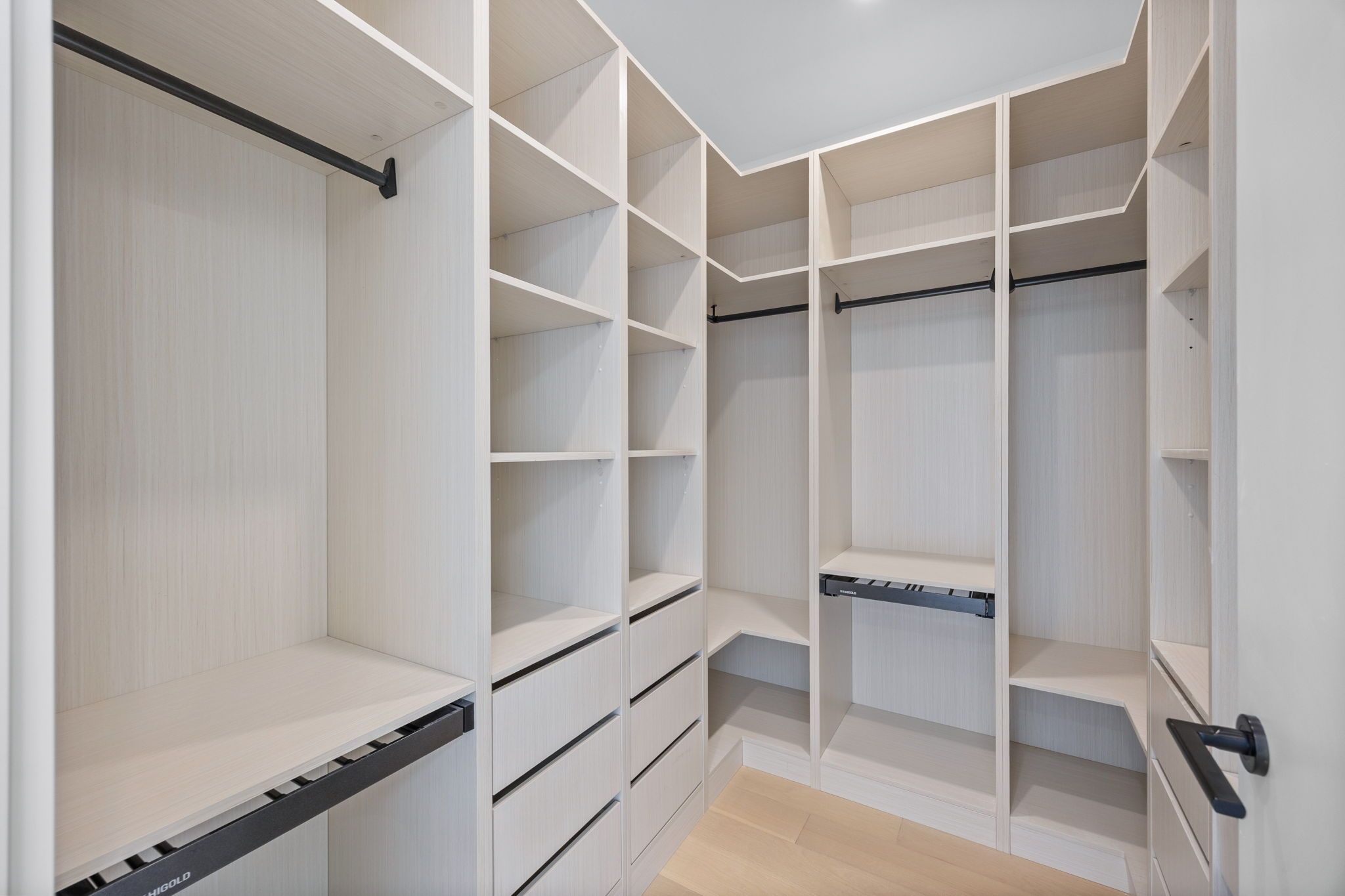 • Contemporary kitchen features waterfall counters and built-in appliances.