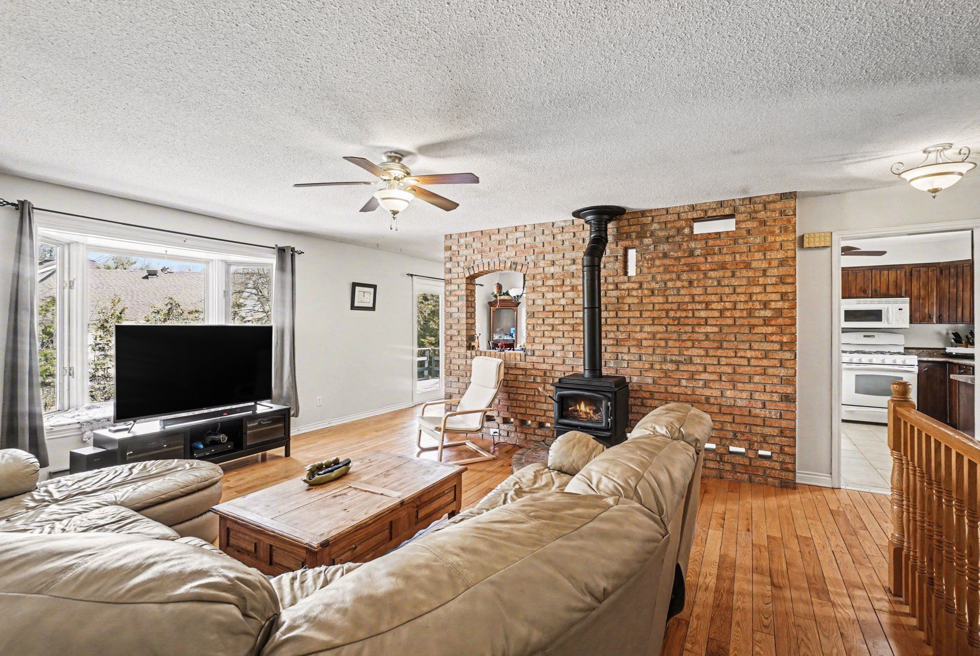 • Bright main level with oak hardwood floors and cozy gas stove.