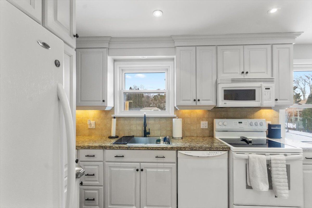 • Updated eat-in kitchen with granite countertops and ample cabinetry.