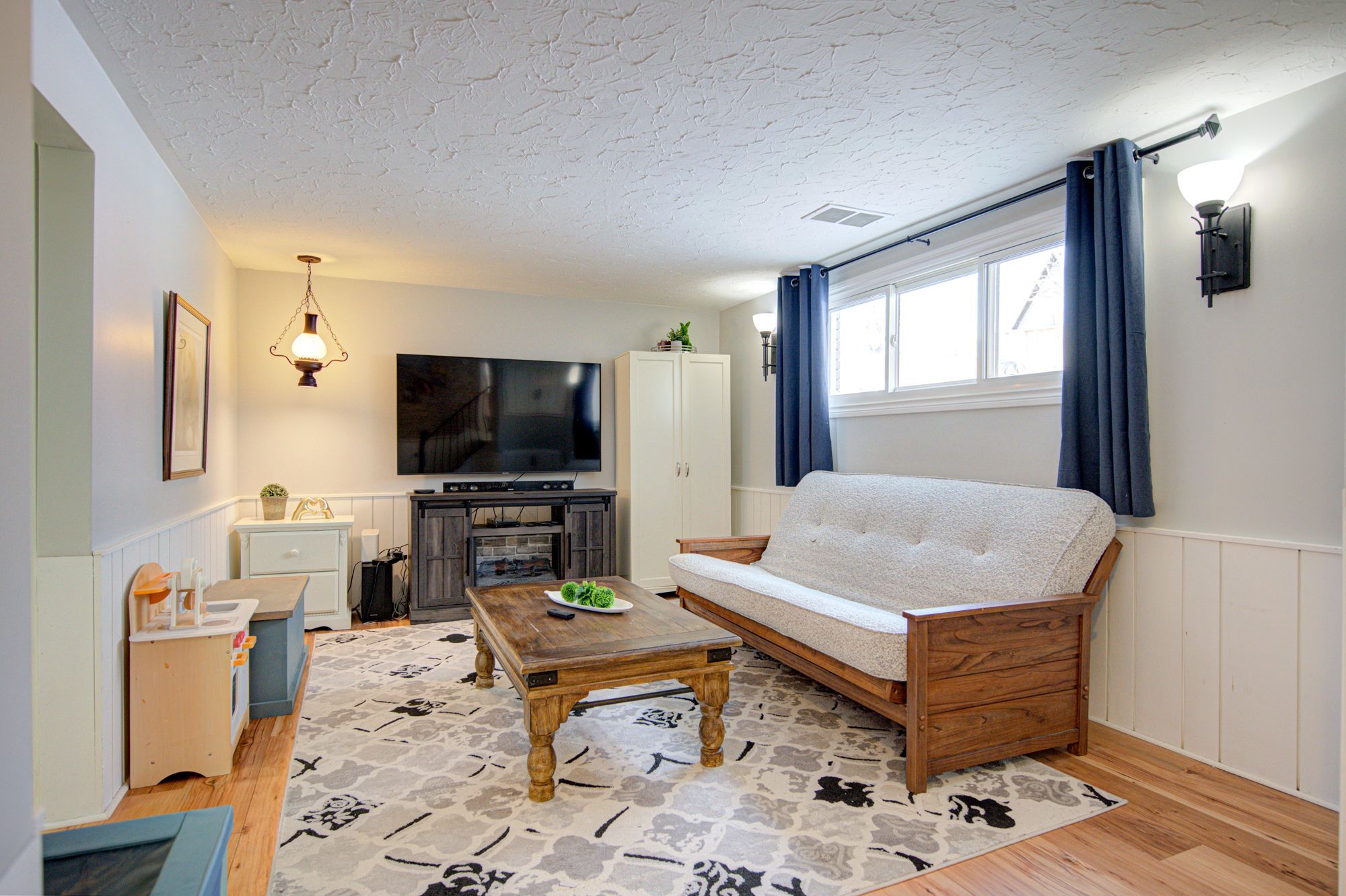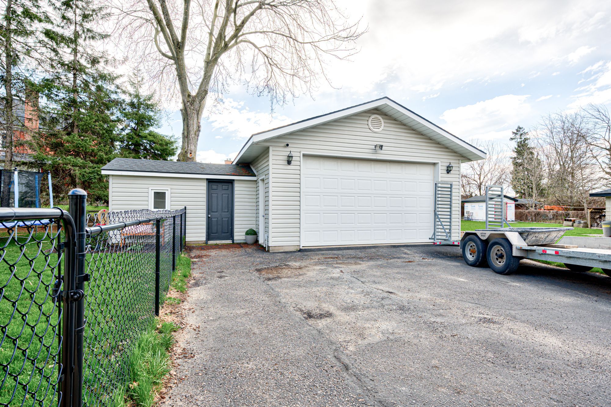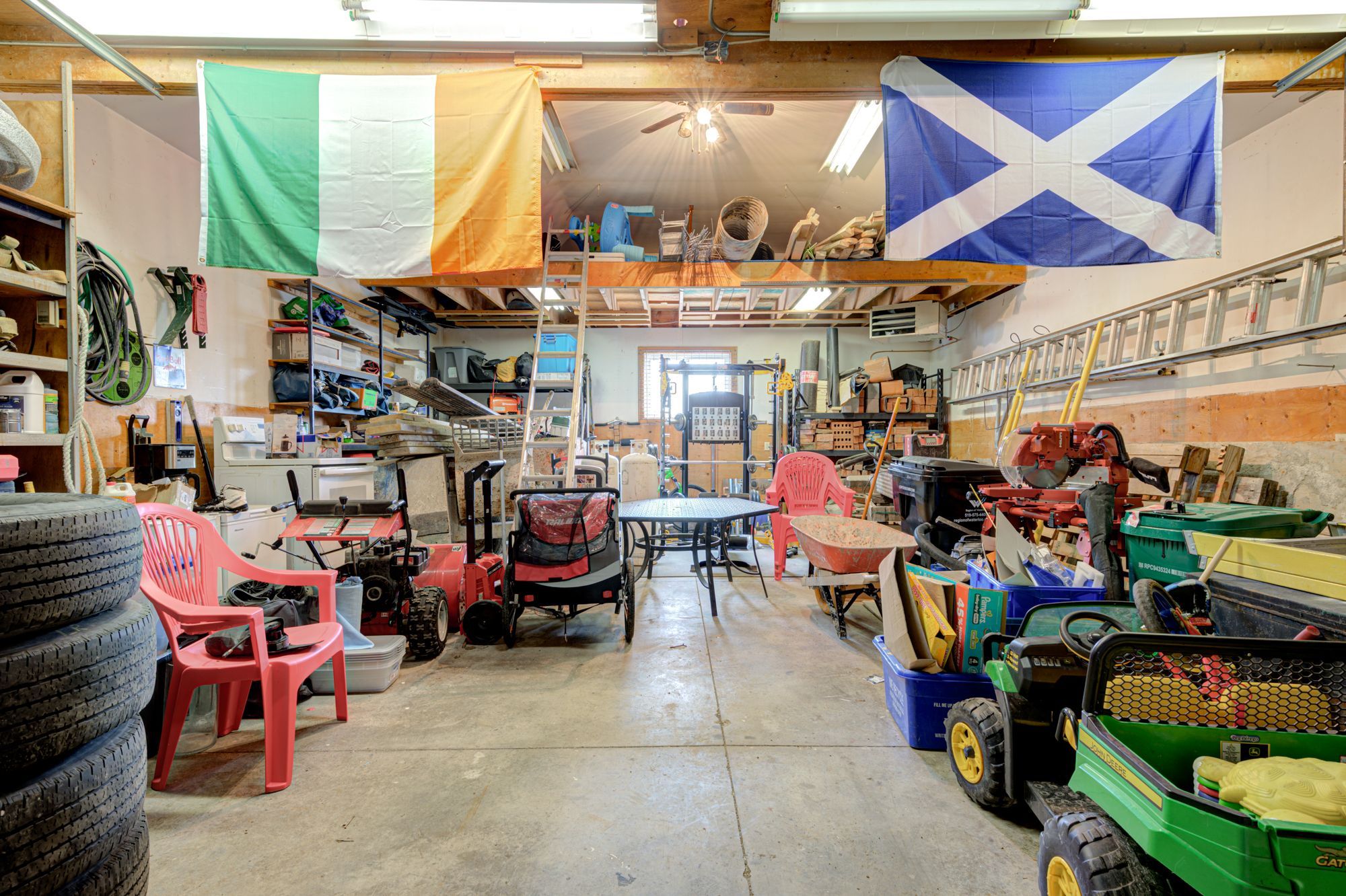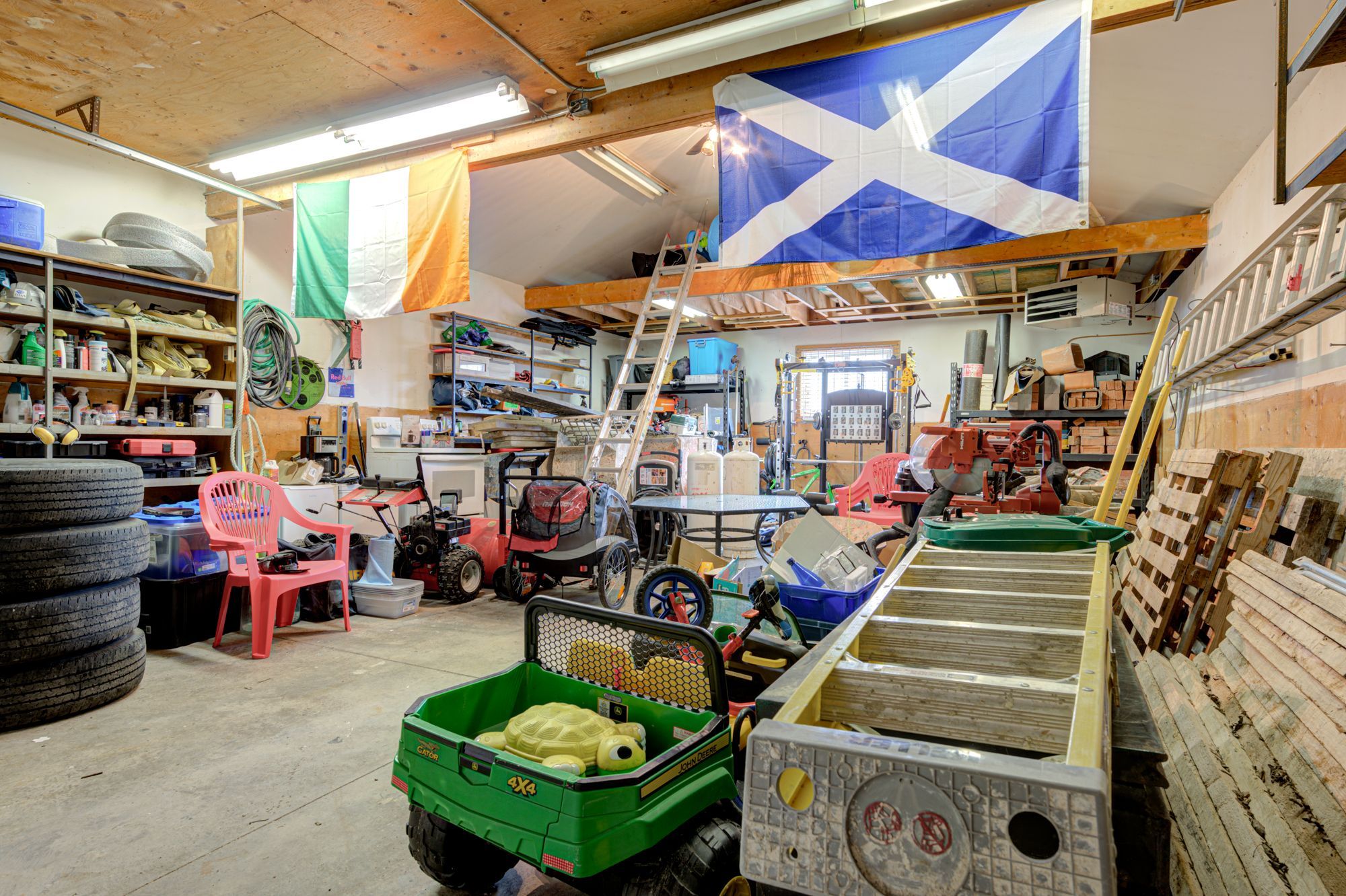 • Oversized garage/shop with 12-foot ceilings, perfect for hobbies or projects.