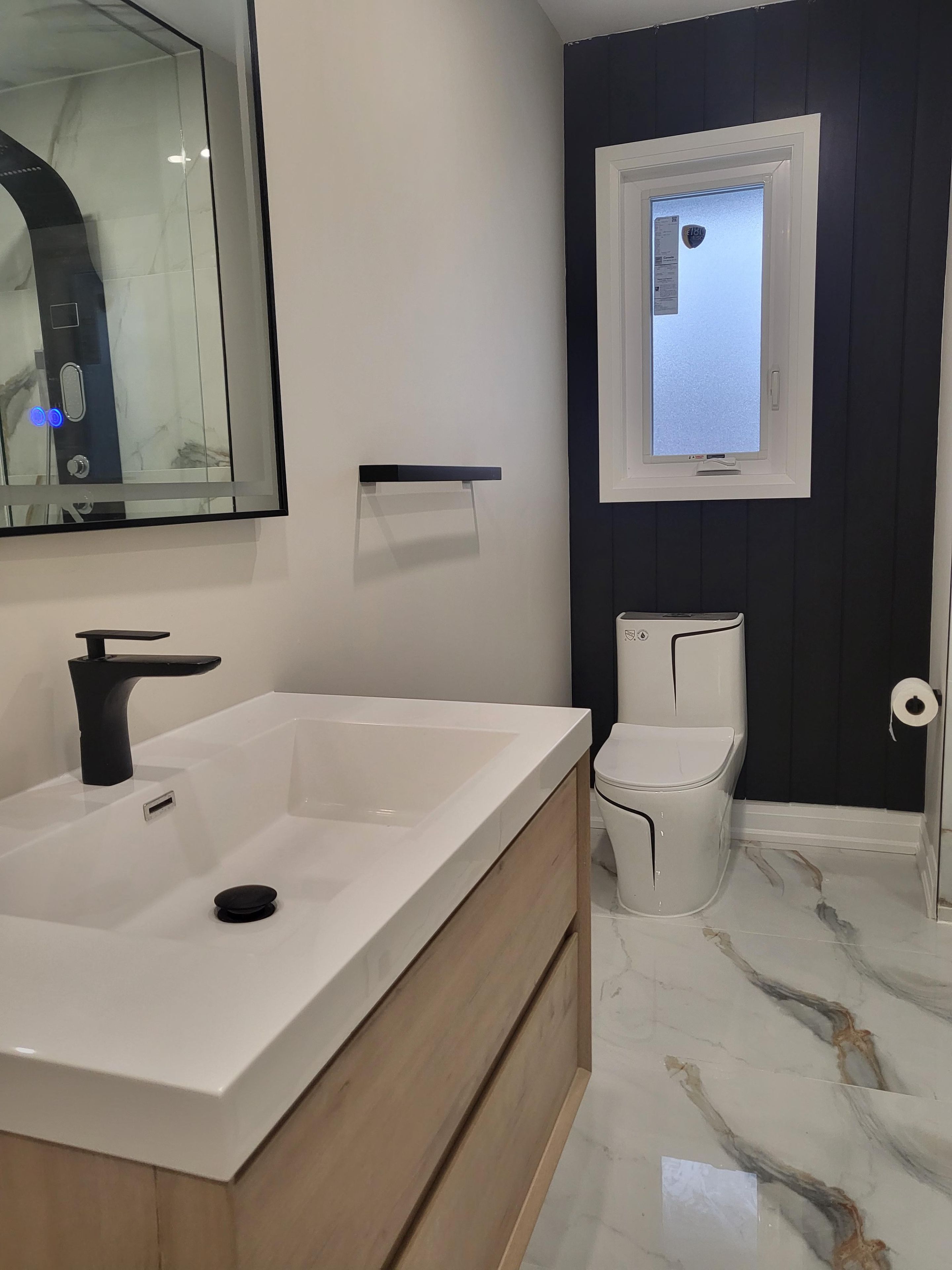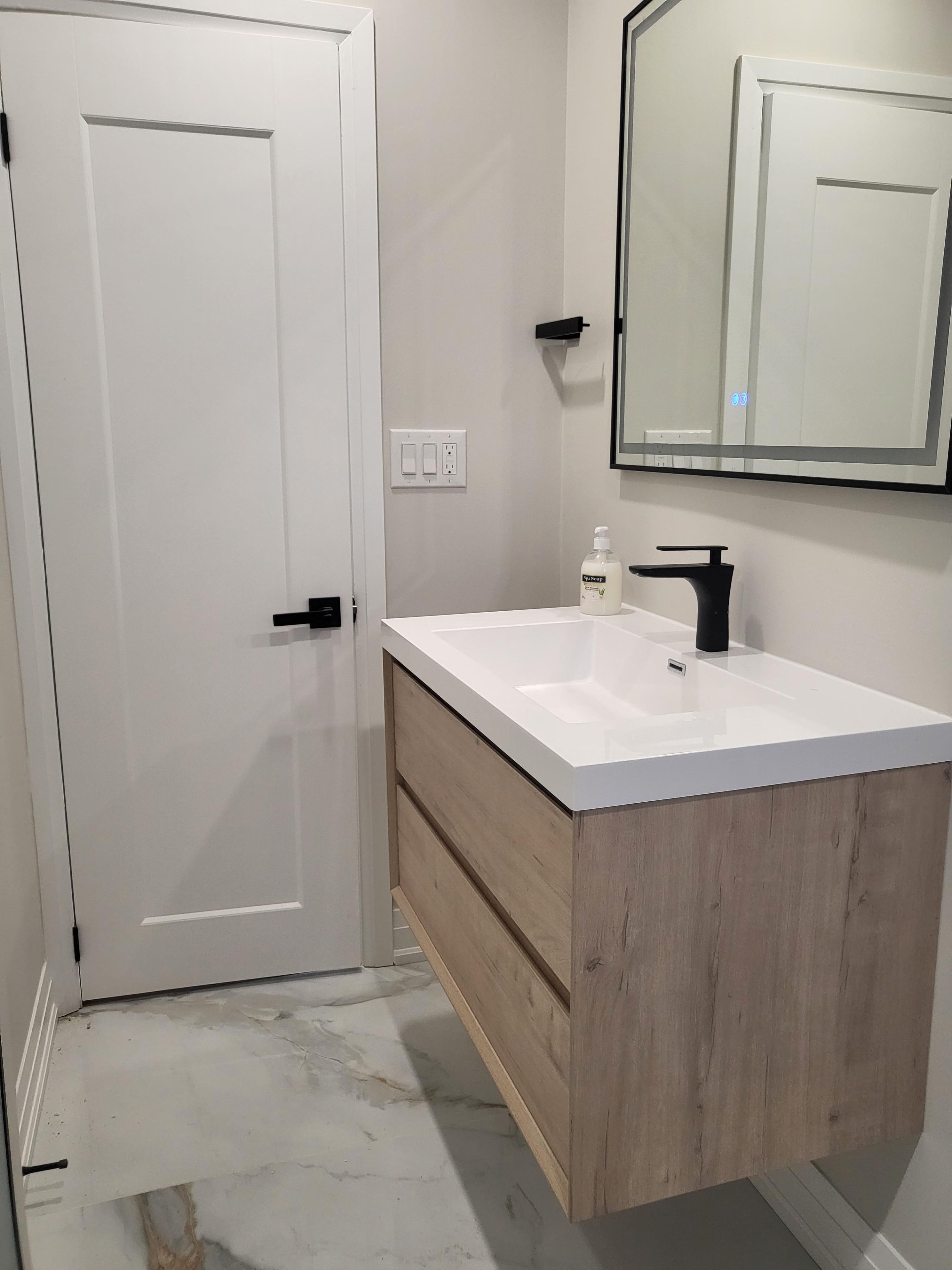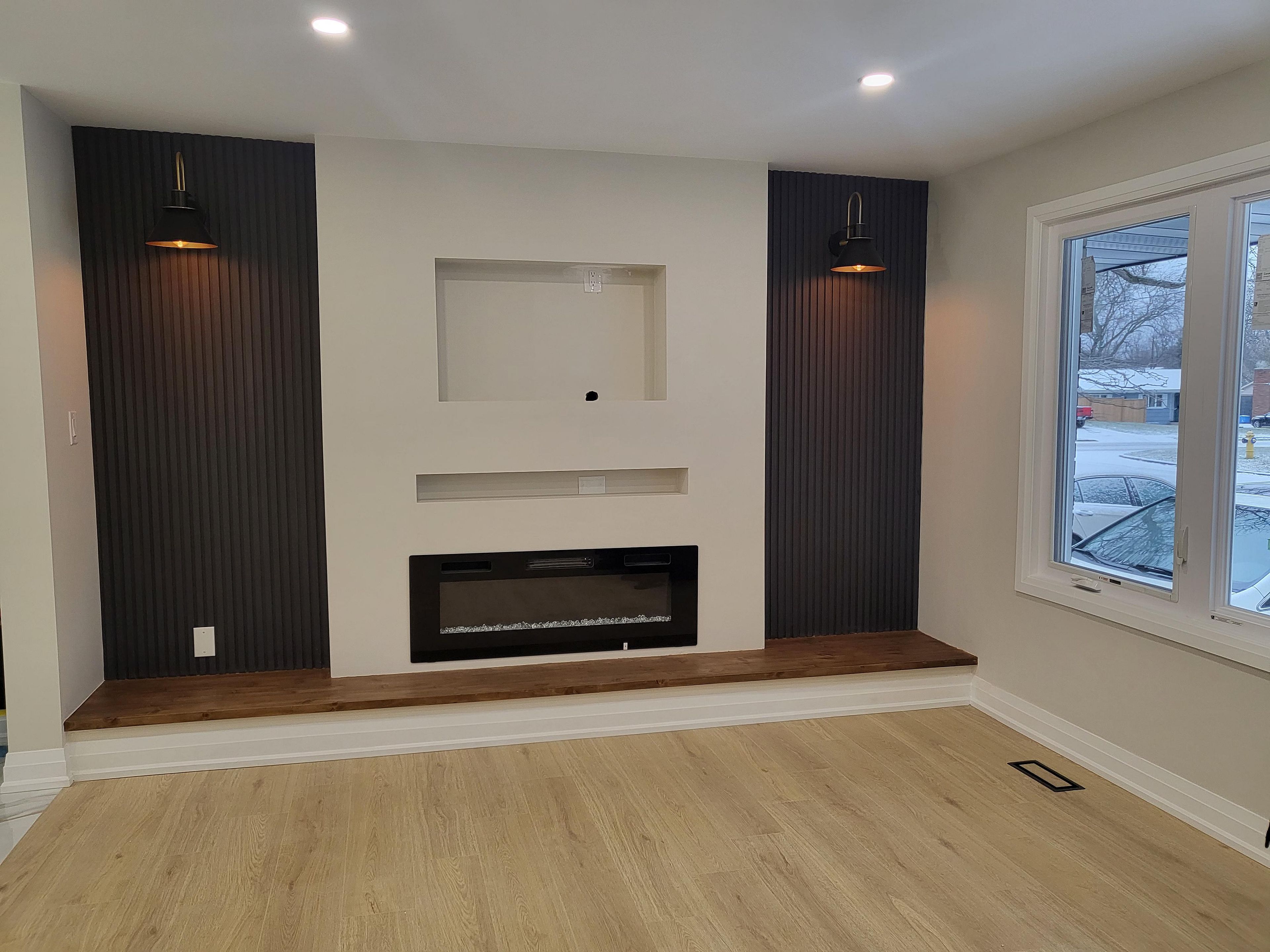 • Bright open-concept living area with a stylish electric fireplace.