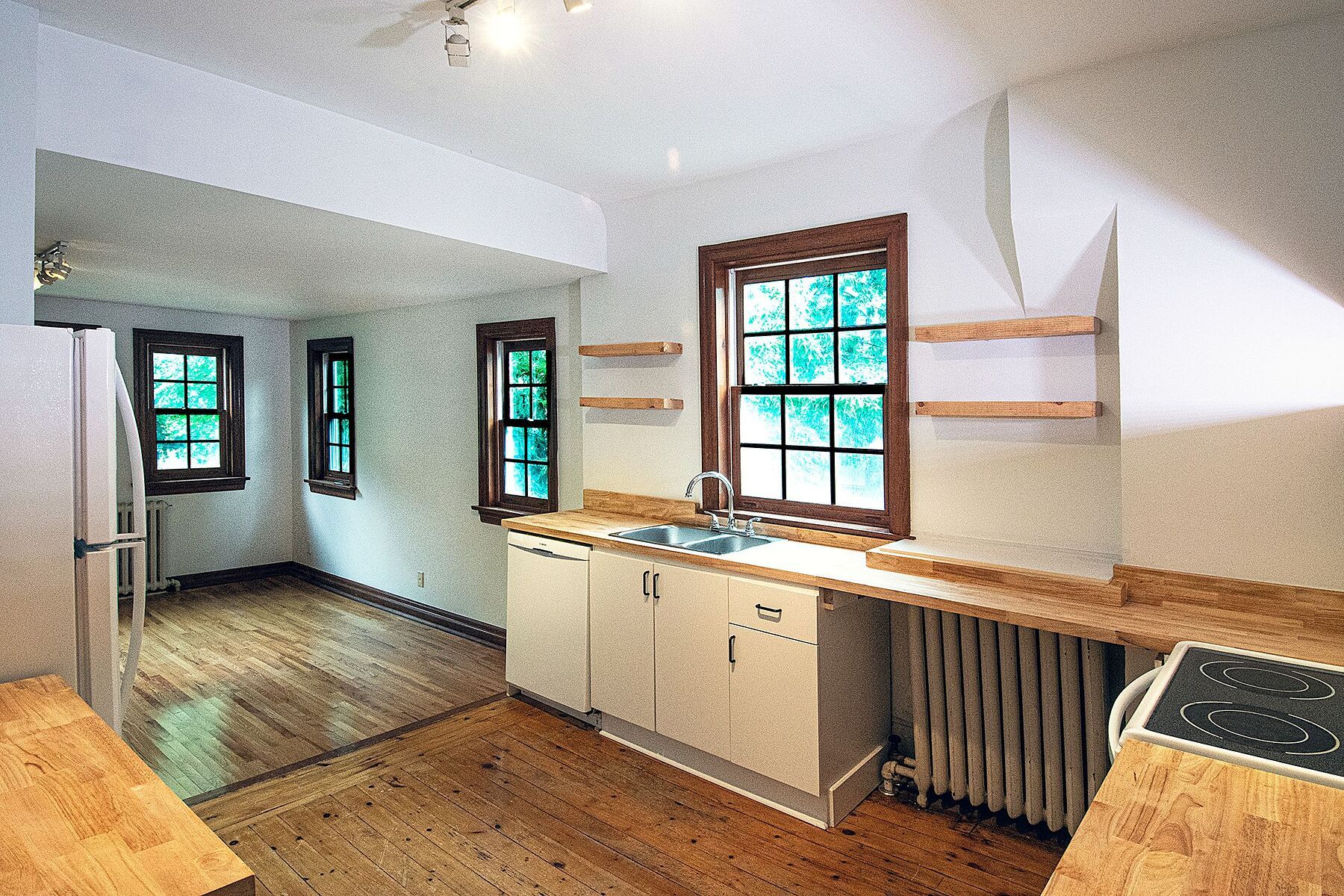 • Oversized kitchen with butcher block counters and large dining area.
