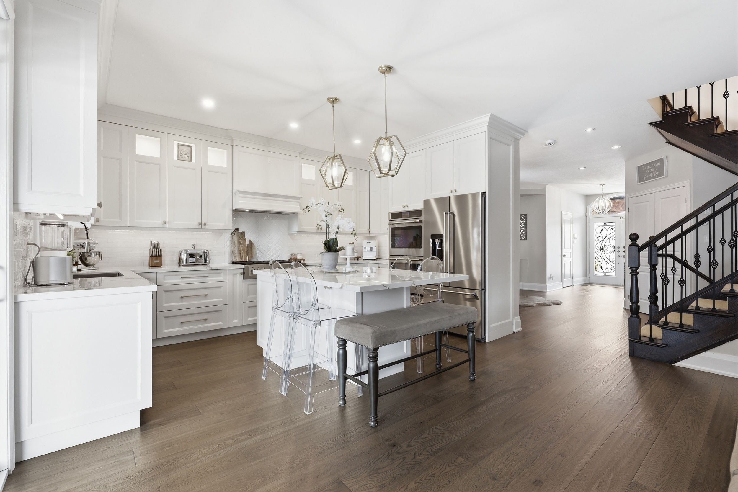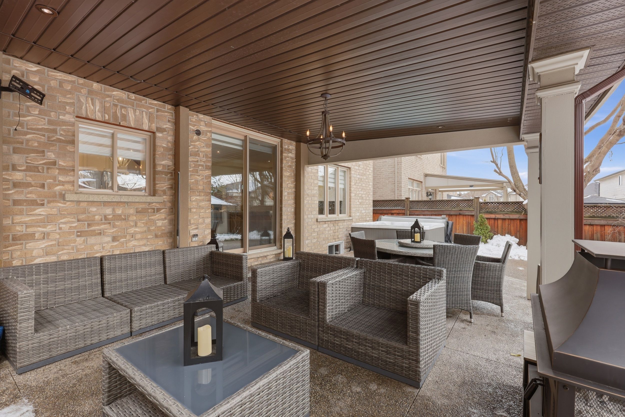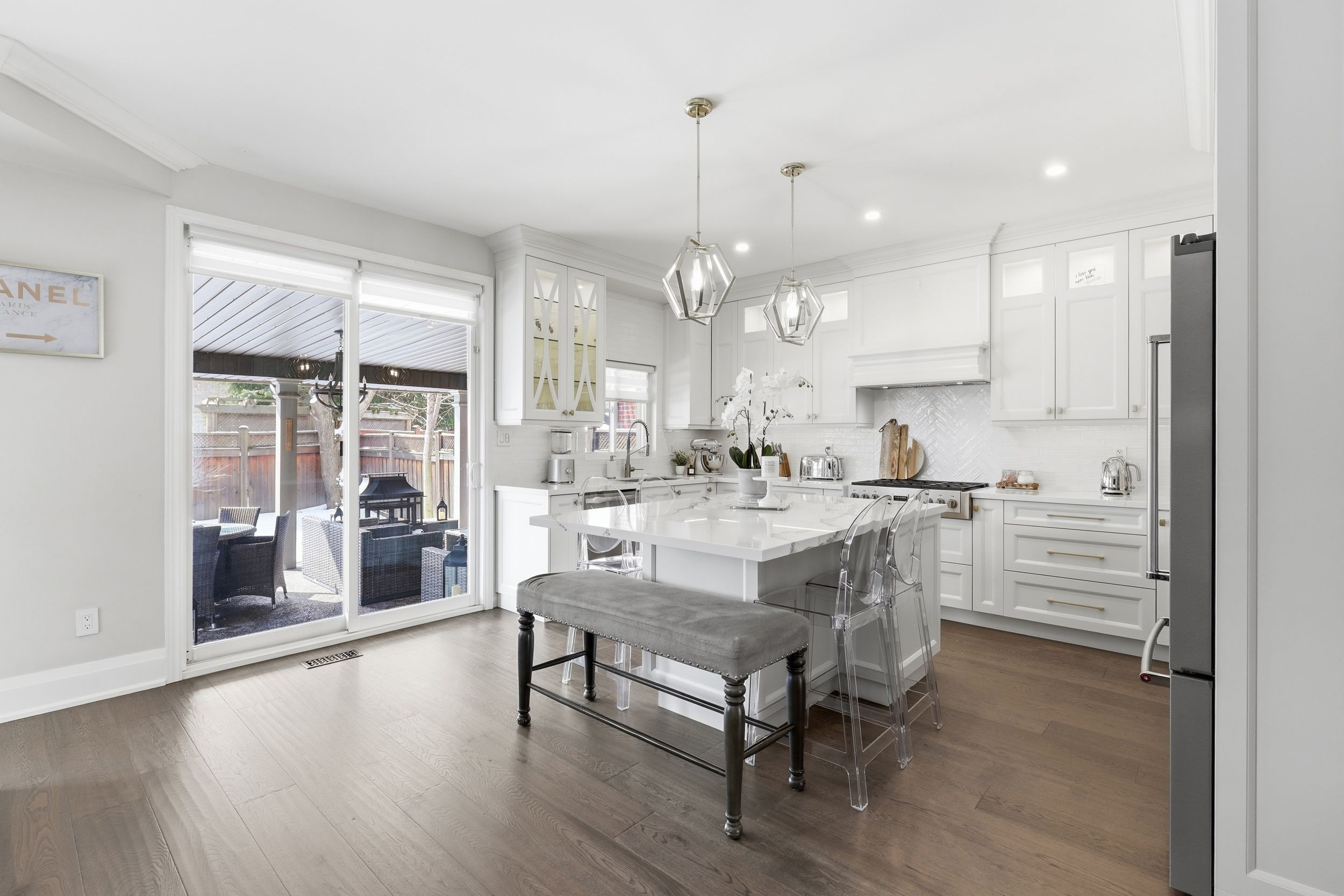 Nestled on a quiet, family-friendly street just steps from excellent schools and nearby parks, this beautifully updated residence blends refined design with everyday comfort. From the moment you step inside, wide-plank hardwood floors stretch out before you, guiding you through a thoughtfully designed layout enhanced with crown moulding and soft pot lighting that creates warmth from morning to night. At the heart of the home is the beautifully renovated kitchen, finished with high-end built-in appliances, stone counters and a substantial island that anchors the space. It's designed for everyday efficiency yet elevated enough to impress. Sightlines connect seamlessly into the main living area, creating a space that feels both functional and inviting. The primary suite is generously sized and truly private - a calm retreat at the end of the day with ample room to unwind. The additional bedrooms are well proportioned and versatile, easily accommodating family, guests or a dedicated workspace without compromise. Step outside and the experience continues. The backyard has been transformed into a lush, private outdoor living space built for real enjoyment. A covered structure extends the usability of the yard through multiple seasons. The fully equipped outdoor kitchen makes hosting effortless, while the hot tub, surrounded by greenery, creates a relaxing escape that feels worlds away from the everyday. Even the garage elevates expectations. This fully finished double car space features high-performance interlocking flooring, dramatic hex led lighting, overhead storage, and a dedicated power wash station - ideal for enthusiasts, hobbyists, or anyone who appreciates a clean, functional workspace that goes beyond the ordinary. With recent renovations throughout and a roof replaced approximately five years ago, the major elements have been addressed. This is a home that balances comfort, quality and lifestyle - designed not just to be owned, but to be used and enjoyed.