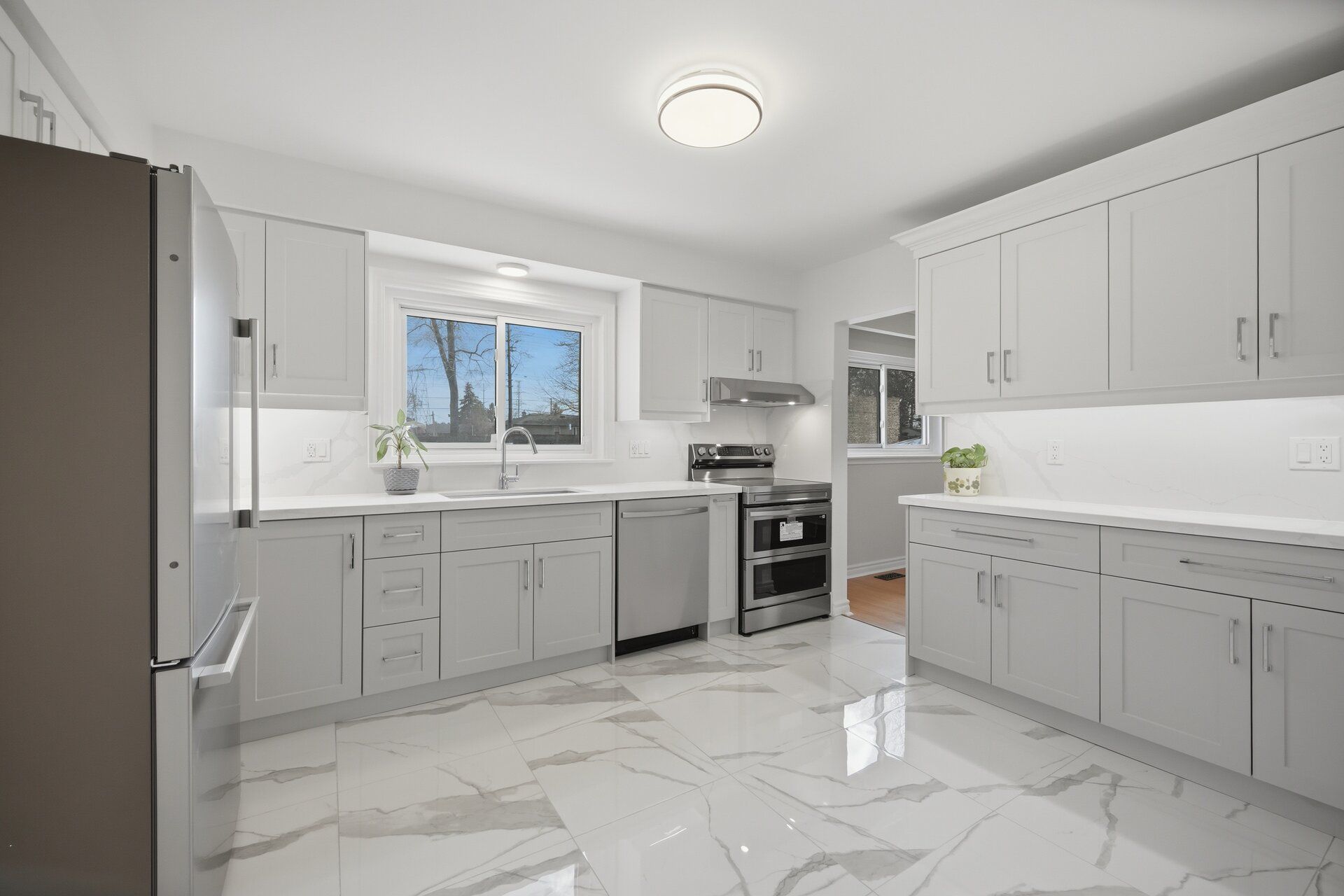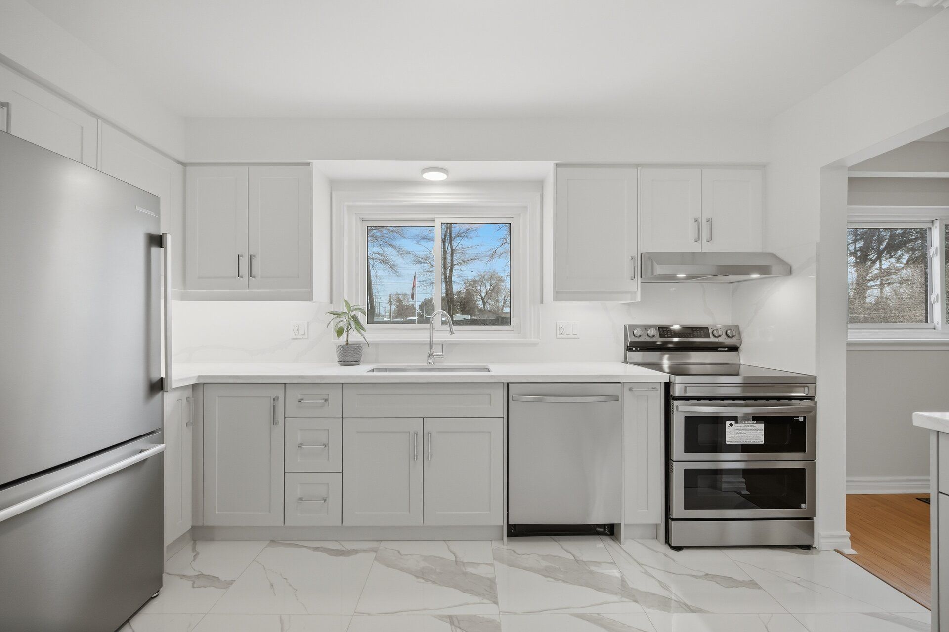 Set on a great lot in toronto's established woburn community, 19 portico drive offers the rare combination of size, style, comfort, and true move-in-ready living that today's toronto & gta buyers have been waiting for. Extensively renovated with a reported $150,000+ spent on upgrades, this beautifully transformed home features 4 spacious bedrooms, 3 updated bathrooms, and a huge, finished basement bedroom ideal for large families, multi-generational living, guests, or work-from-home flexibility. The quality is felt throughout with refreshed wood flooring, new porcelain tile, fresh paint, upgraded hardware, modern lighting, pot lights, and 5 brand-new appliances. The completely redesigned kitchen is a standout, showcasing stylish grey and white cabinetry, quartz countertops, quartz backsplash, under-cabinet led lighting, built-in spice storage, a large single-bowl stainless steel sink, and an upgraded layout that blends beauty with function. Renovated bathrooms add even more value with new vanities, quartz counters, premium moen fixtures, upgraded tile finishes, mirrors, and lighting. The finished lower level extends the living space with new vinyl flooring, a built-in bookcase, updated 3-piece bath, and rough-in plumbing for a future easy to install kitchenette for the basement apartment. Located in family-friendly woburn, at your home's backyard, excellent convenience with ttc bus stop, bike path, meadoway park trail, quick access to hwy 401, & close proximity to cedarbrae centre, scarborough town centre, centennial college, u of t scarborough campus, parks, recreation, and everyday amenities. Buyers will also appreciate nearby schools, green space, and the strong lifestyle appeal of this well-connected scarborough neighbourhood. For anyone searching toronto real estate, homes for sale, or a renovated family home near transit, schools, shopping, and parks, you found the standout turnkey opportunity packed with comfort, flexibility, and long-term value!!