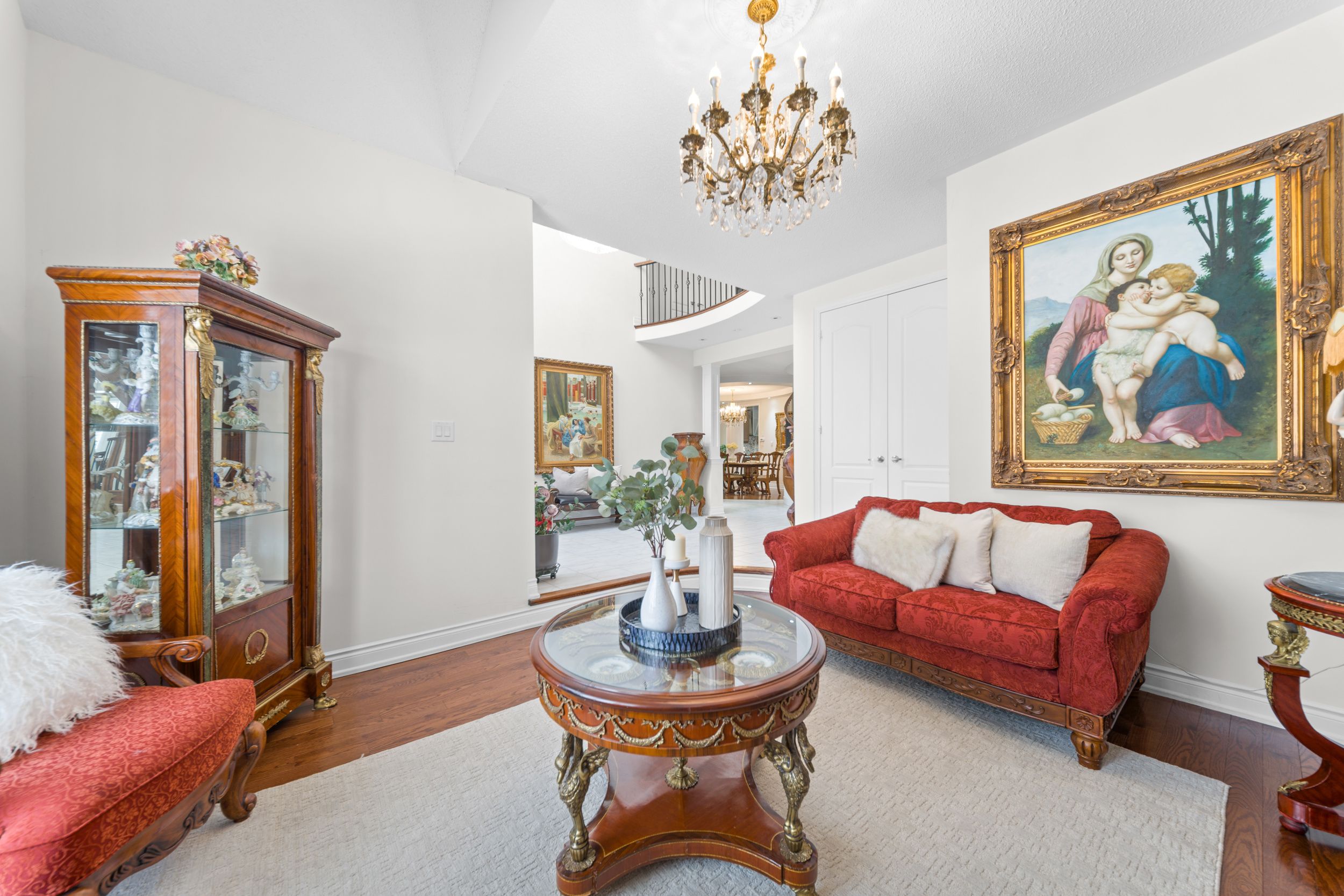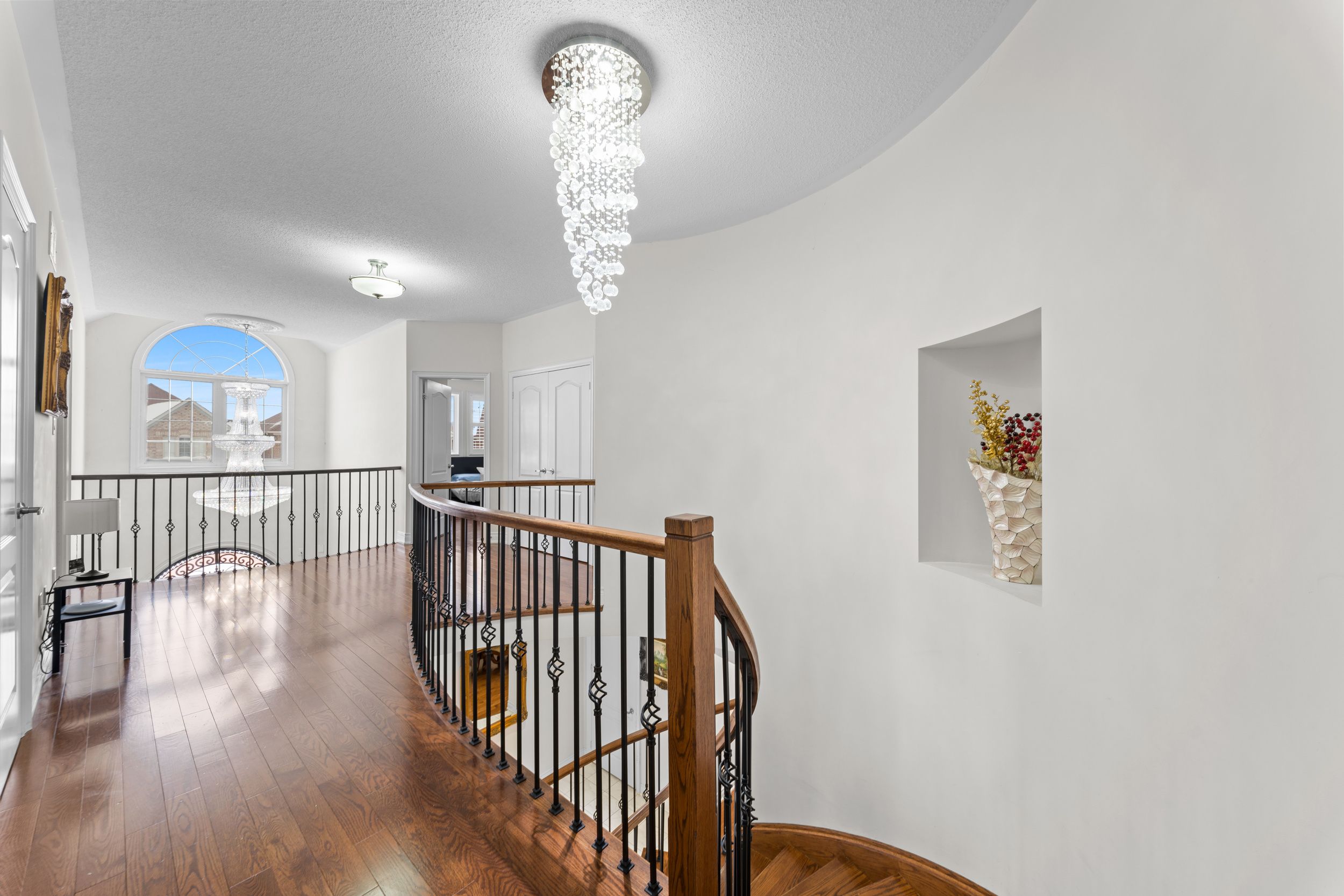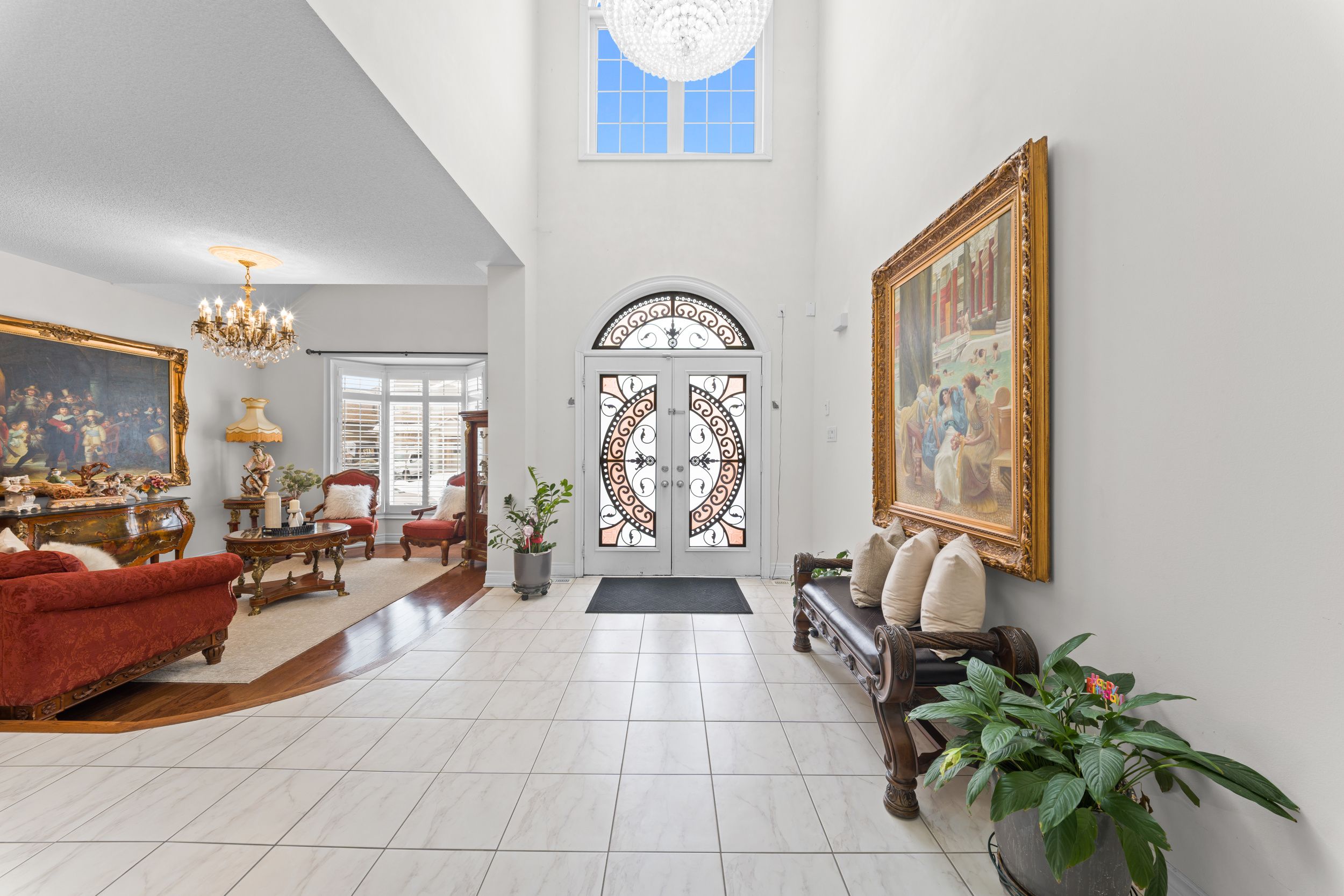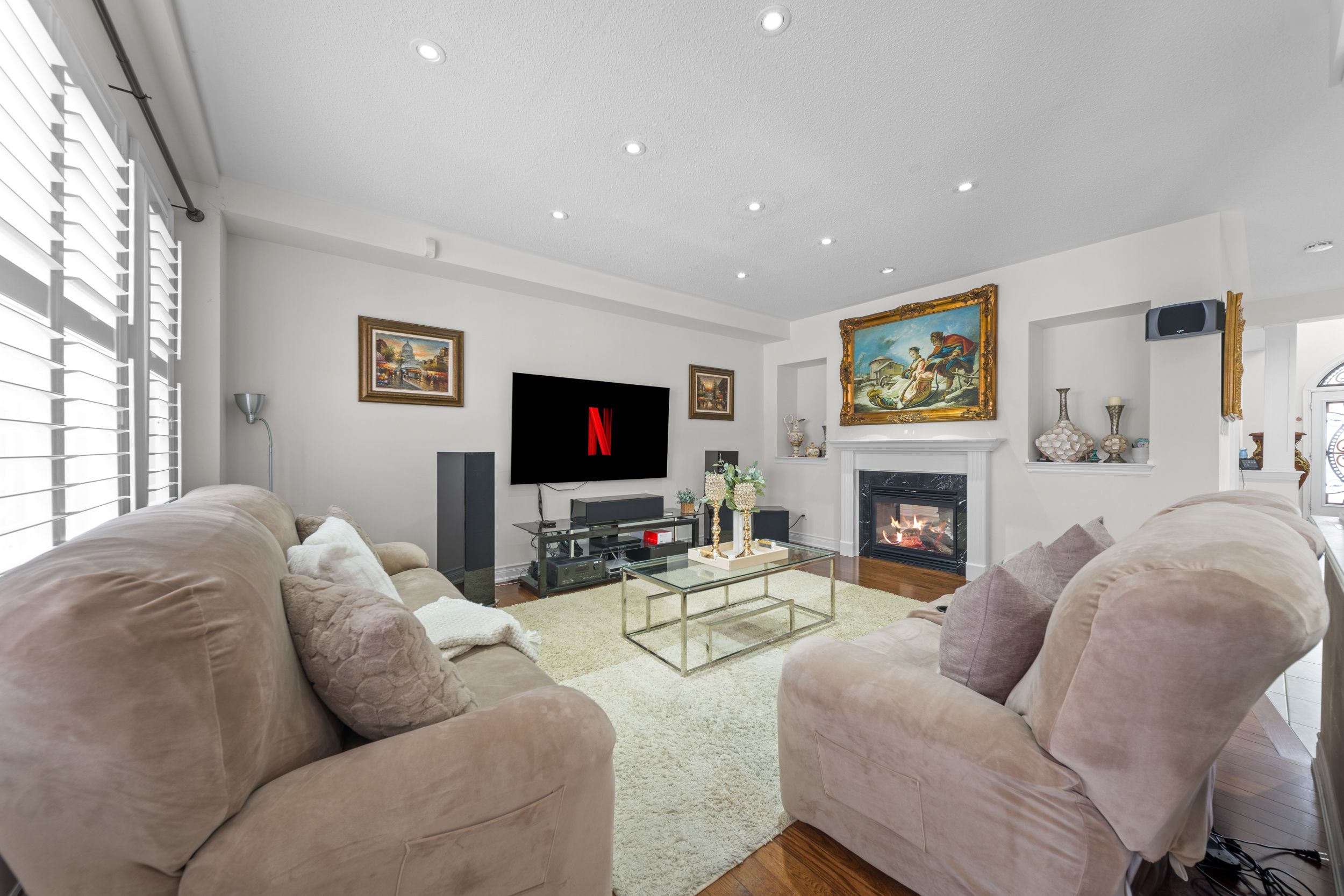 Exquisite home offering approx. 3,700 sq. Ft. Of refined living space, featuring 9-ft ceilings on both floors and rich hardwood throughout. A grand double-door entry opens to a breathtaking open-to-above foyer with an elegant chandelier. The gourmet kitchen is beautifully appointed with granite countertops, designer backsplash, premium maple cabinetry, a spacious center island, built-in cooktop and oven, and stainless steel appliances. Expansive principal rooms include gas fireplaces in both the living room and private office, ideal for elegant entertaining and everyday comfort. The luxurious primary suite offers a spacious walk-in closet and a spa-inspired ensuite bath, complemented by four generously sized bedrooms and the rare convenience of three full bathrooms on the upper level. California shutters throughout enhance sophistication and privacy. Additional highlights include pot lights on the main floor and exterior, a separate entrance, no sidewalk for maximum parking, an interlocked driveway and patio, and a beautifully landscaped backyard with shed-an exceptional blend of luxury, space, and functionality.