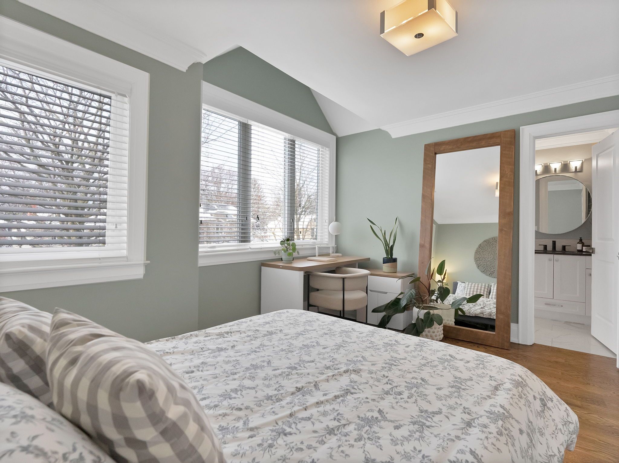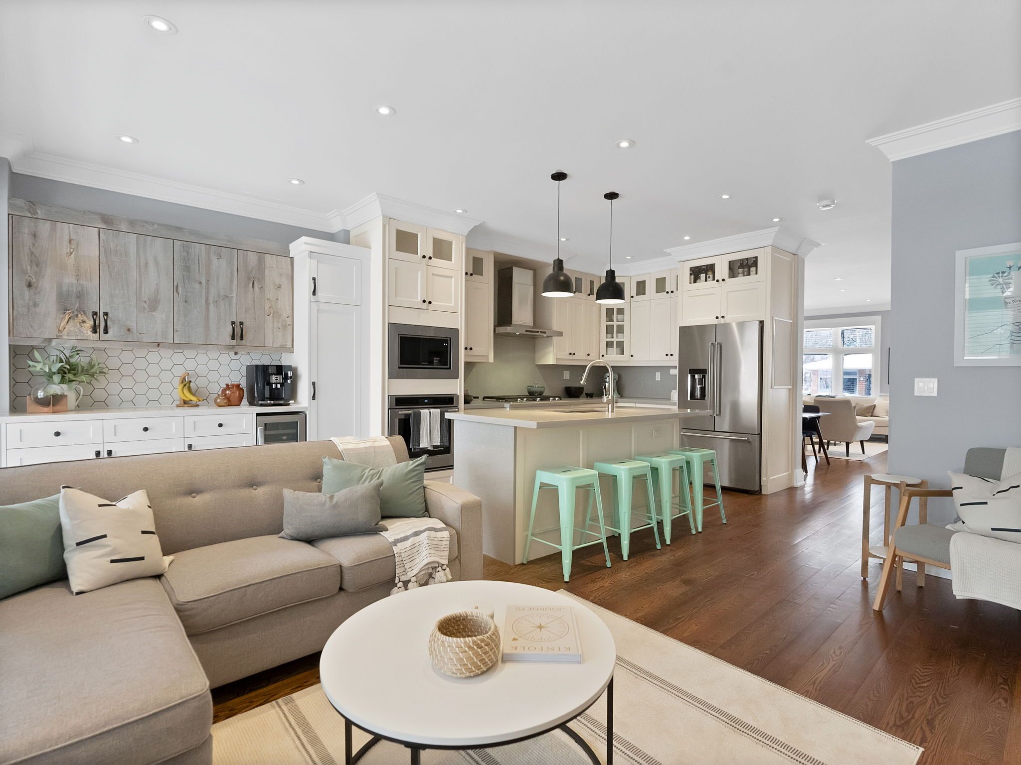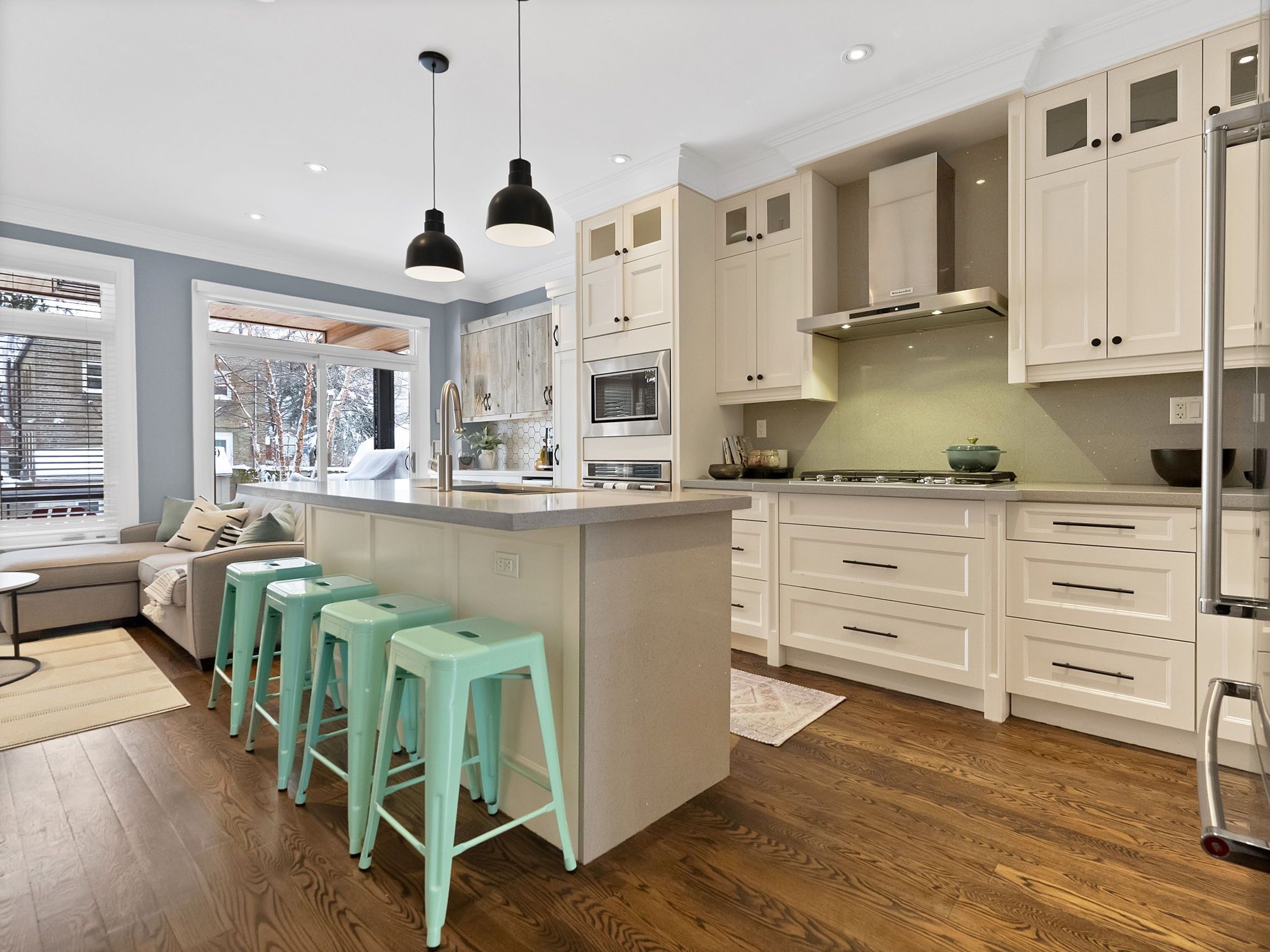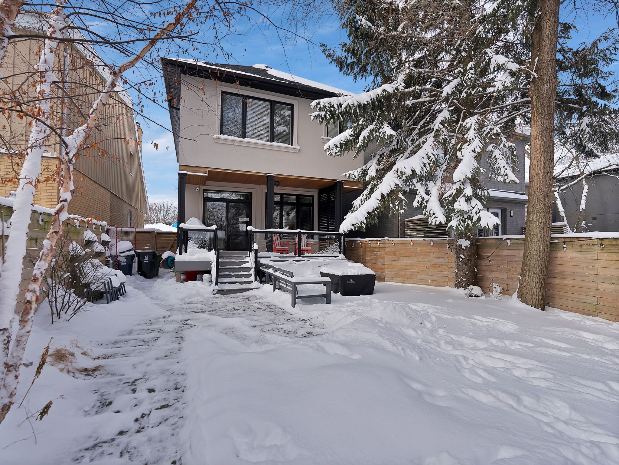 This impeccably renovated 4-bedroom, 5-bathroom family home is an entertainer's dream, set on a gorgeous tree-lined street and ideally located near top-rated schools, parks, cafes, gyms, and transit, and finished top to bottom with high-end craftsmanship. Featuring two floors of custom-finished hardwood, high ceilings, wainscoting, and plaster crown moulding, the home offers a chef's kitchen with caesarstone countertops and backsplash, newer fridge, dishwasher, and microwave, and a walk-out from the family room to a composite deck with lifetime warranty. The thoughtful layout includes second-floor laundry, two skylights, one fireplace with a second roughed-in in the basement, and custom built-ins in the primary bedroom and ensuite, guest bedroom, and living area. Recent upgrades include a renovated primary bathroom (2023), renovated main-floor powder room, new washer and dryer (2024), new ac unit (2024), making this move-in-ready home the perfect blend of luxury, comfort, and family living.