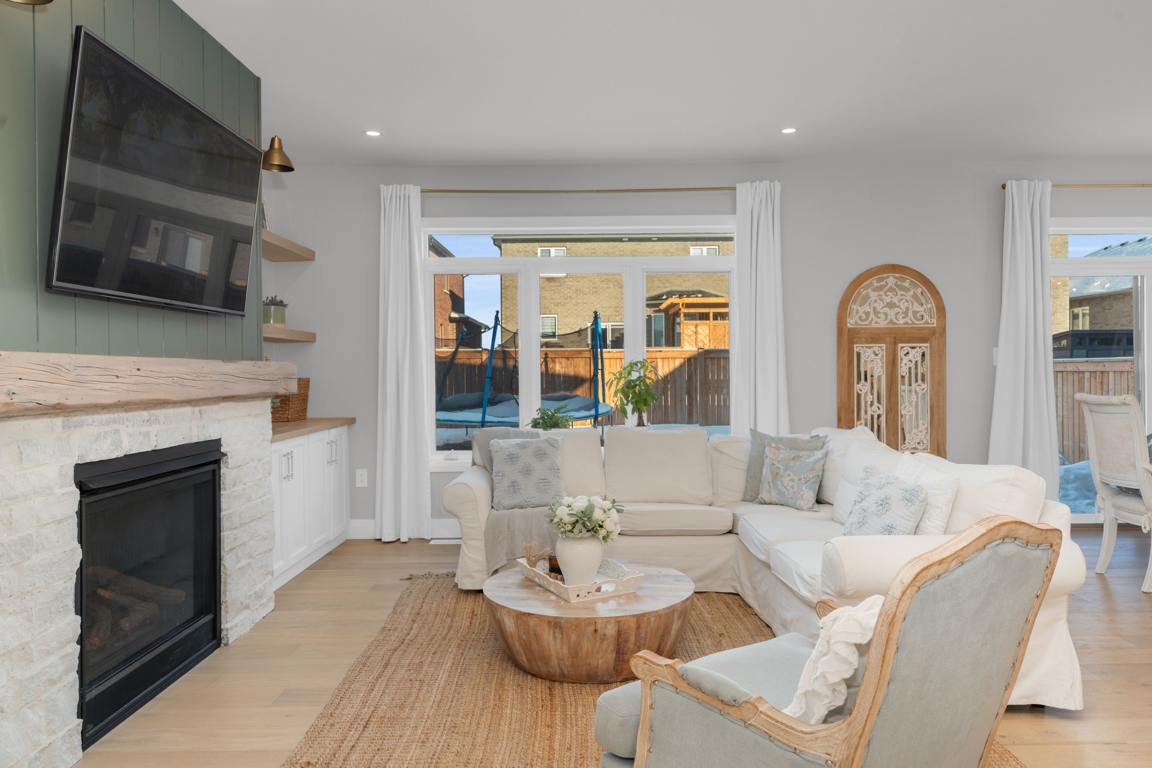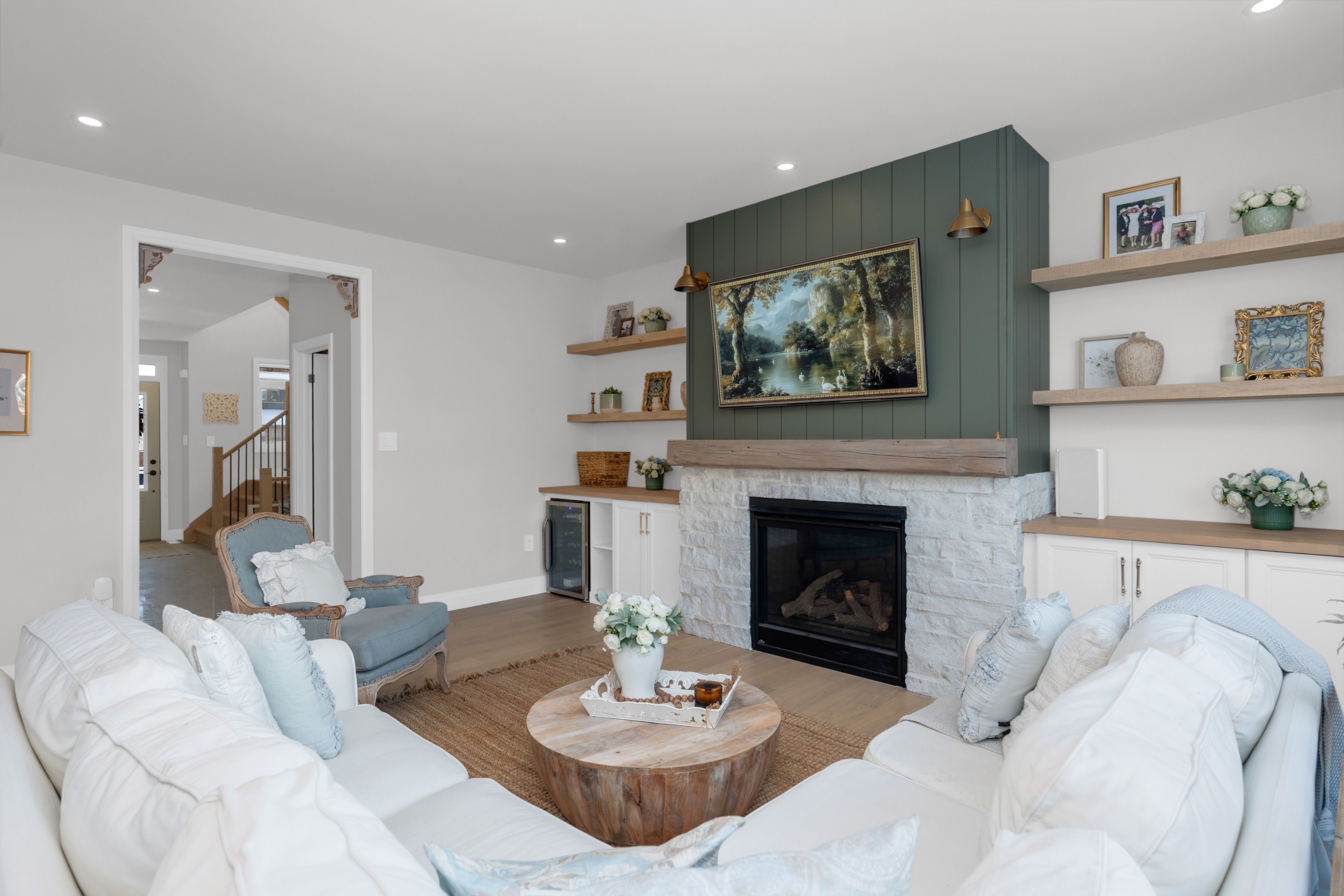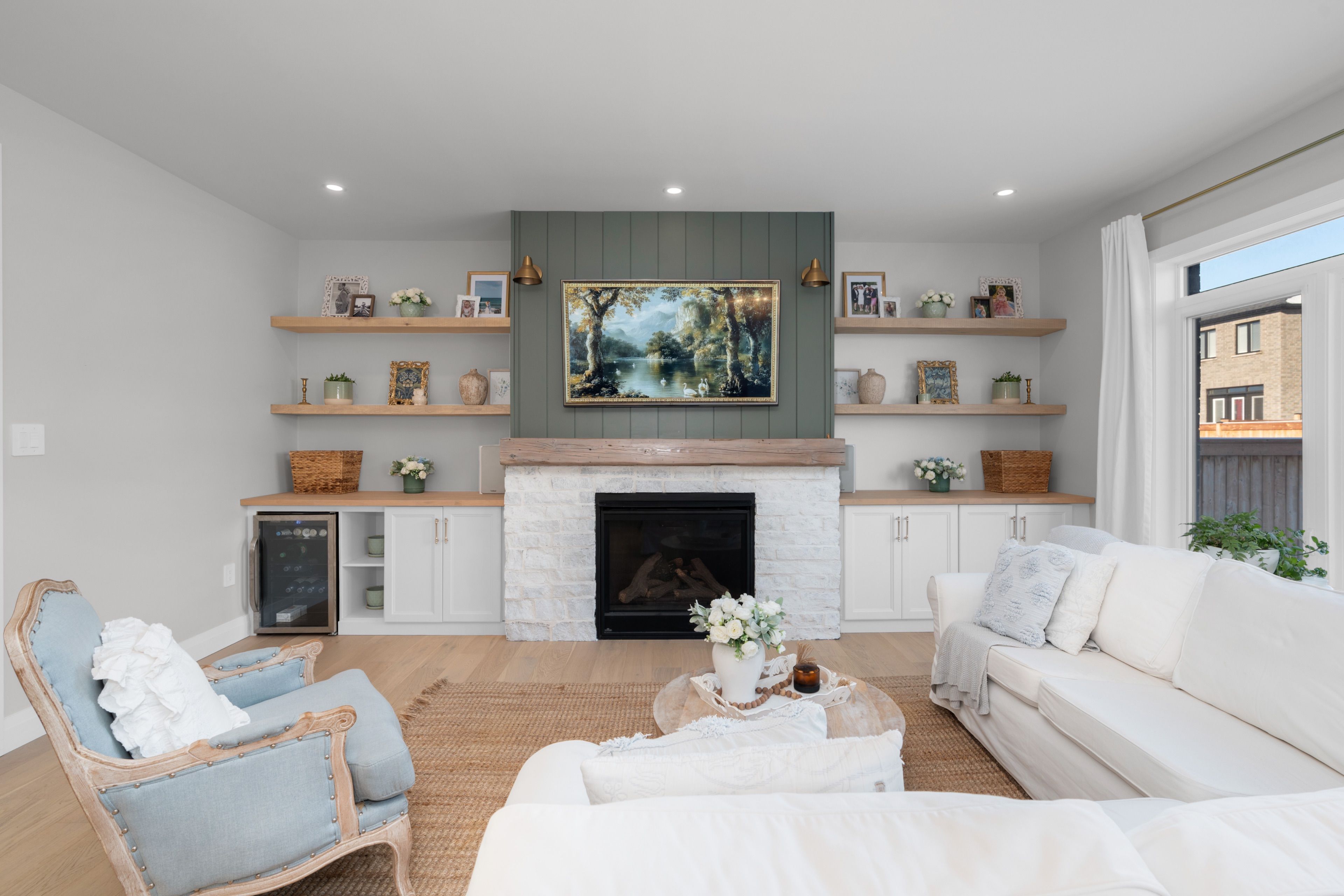 • Cozy family room with gas fireplace and built-ins for added comfort.