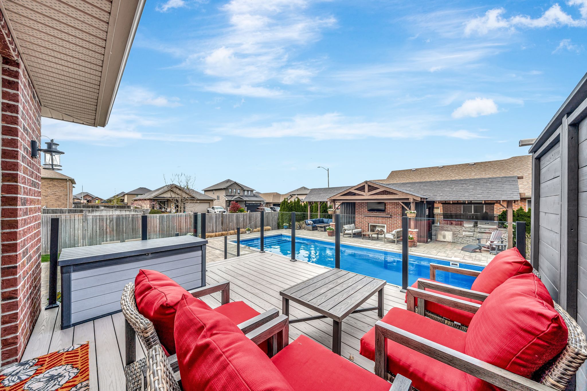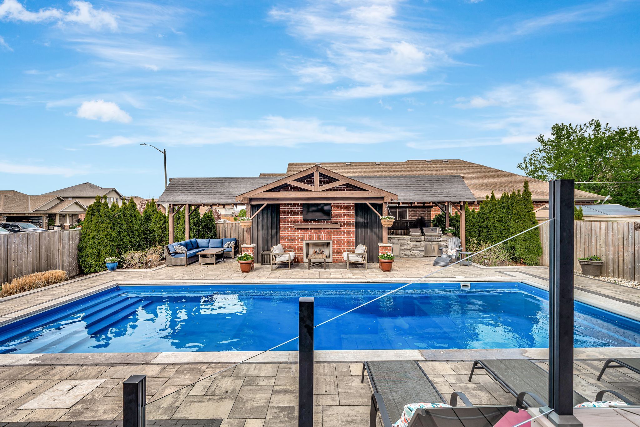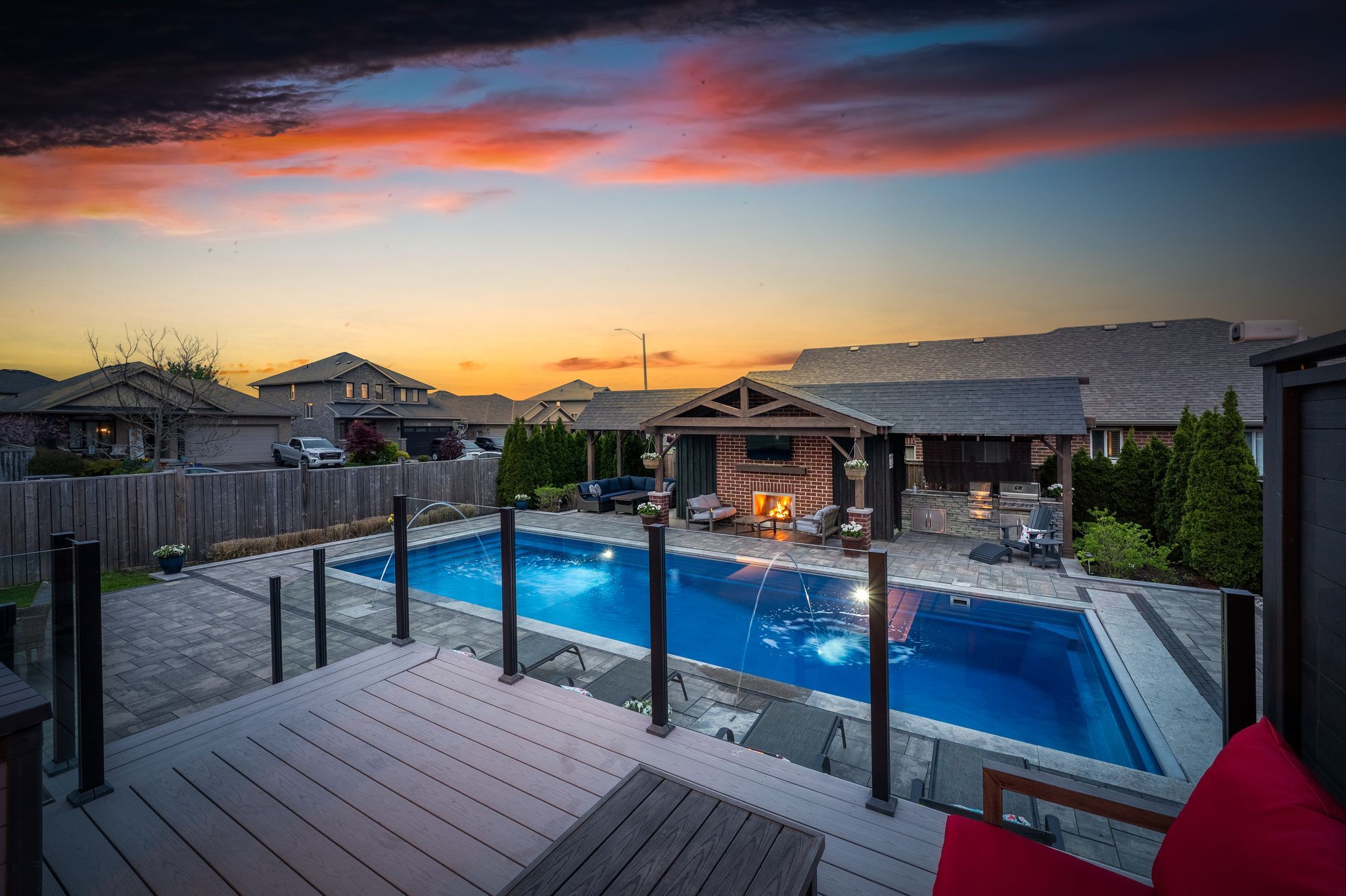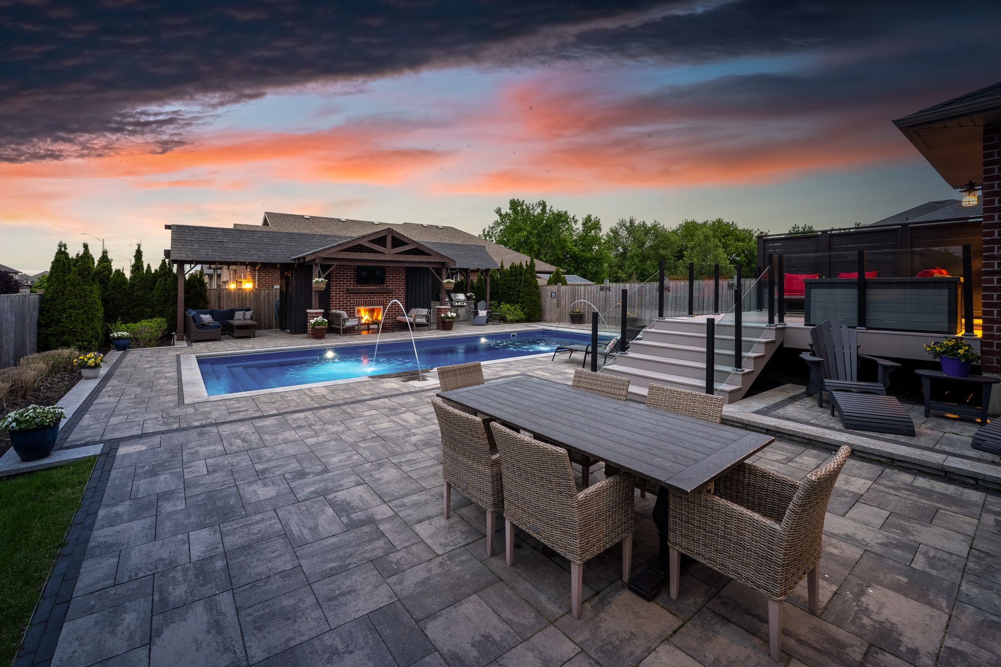 This beautifully appointed 2-storey home offers 4+1 bedrooms, 4 bathrooms, and a perfect blend of luxury, comfort and practicality in one of belleville's most desirable neighbouhoods. The gourmet kitchen offers leathered granite counters, stainless steel appliances, walk-in pantry, and breakfast bar. The great room includes a gas fireplace and walkout to a fully landscaped backyard oasis. The main floor has a well-appointed mudroom. Finished basement with family room, office with herringbone laminate flooring, gas fireplace, an additional bedroom and a full bath offer plenty of flexible living space. The primary suite features a large ensuite with oversized shower, and both upstairs bathrooms include beautiful granite countertops. Outside, enjoy a 16x40 ft heated fiber glass pool with new heater, luminar streams, and coverstar automatic safety cover (serviced annually) plus a winter cover. Composite decking with two covered seating areas (one with gas fireplace and tv hookup), and outdoor kitchen with granite bar, sink, and premium gas bbq complete the package. The pool house includes a 2-piece bath, utility room, and was stained and painted in 2023. Additional features include a fully insulated garage with high ceilings, interlock path to back door, double fencing for privacy and professionally landscaped yard that's simple to maintain. At night, the majestic exterior light transforms the home into a stunning oasis.