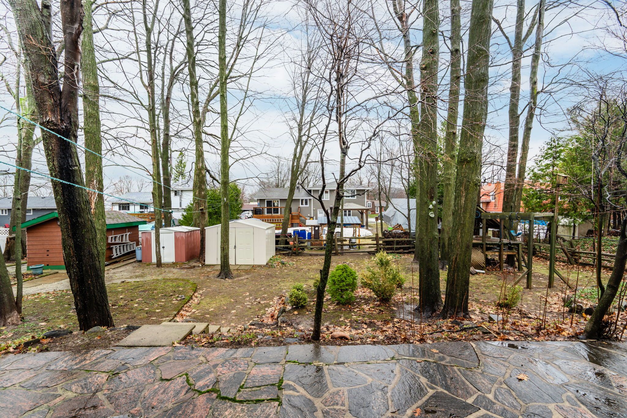 • Low-maintenance outdoor spaces with granite stone patios and sheds.
