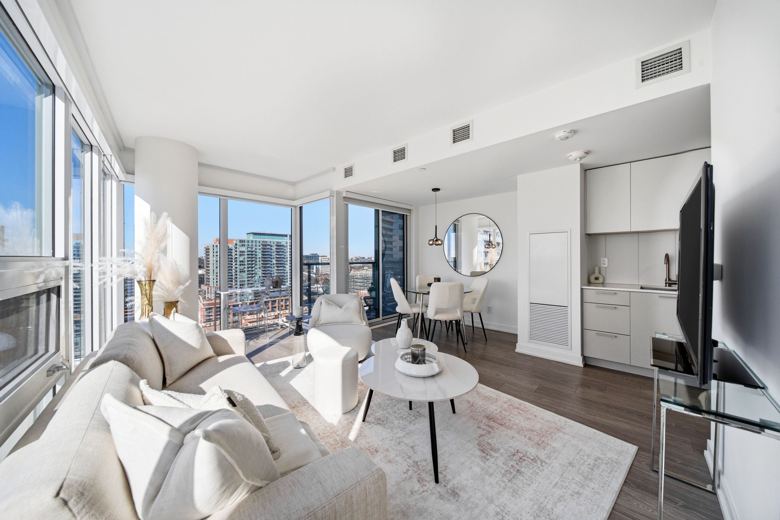 Welcome to zen king west at 19 western battery road-where elevated urban living meets the vibrant energy of liberty village. This beautifully designed corner suite offers 755 square feet of bright, functional space, with floor-to-ceiling windows in every room that fill the home with natural light. The open-concept living and dining area is both spacious and inviting-ideal for relaxing or entertaining-while modern laminate flooring adds a clean, contemporary feel throughout. The kitchen is thoughtfully appointed with quartz countertops, sleek cabinetry, and stainless steel appliances, including a separate oven and cooktop-perfect for both everyday living and hosting. This suite features two generously sized bedrooms, each with floor-to-ceiling windows and ample closet space. Two full bathrooms, including a private ensuite in the primary bedroom, offer both comfort and convenience. Enjoy beautiful views of lake ontario and take in everything liberty village has to offer right from your home. Step outside and you're right in the heart of liberty village; an urban comminity with all of life's conveneinces including grocery stores, restaurants, shops, hardware stores, drug stores, medical services and more. We are also just moments from the best of toronto-king west, downtown, and the scenic martin goodman trail along the waterfront. With easy access to the gardiner expressway, go transit, and ttc, getting around the city is seamless. Residents also enjoy exceptional amenities, including a 5,000-square-foot fitness centre, an outdoor sky track, and a luxurious 3,000-square-foot spa complete with a hot tub and plunge pools. This is a perfect blend of style, comfort, and convenience-an exceptional place to call home.
