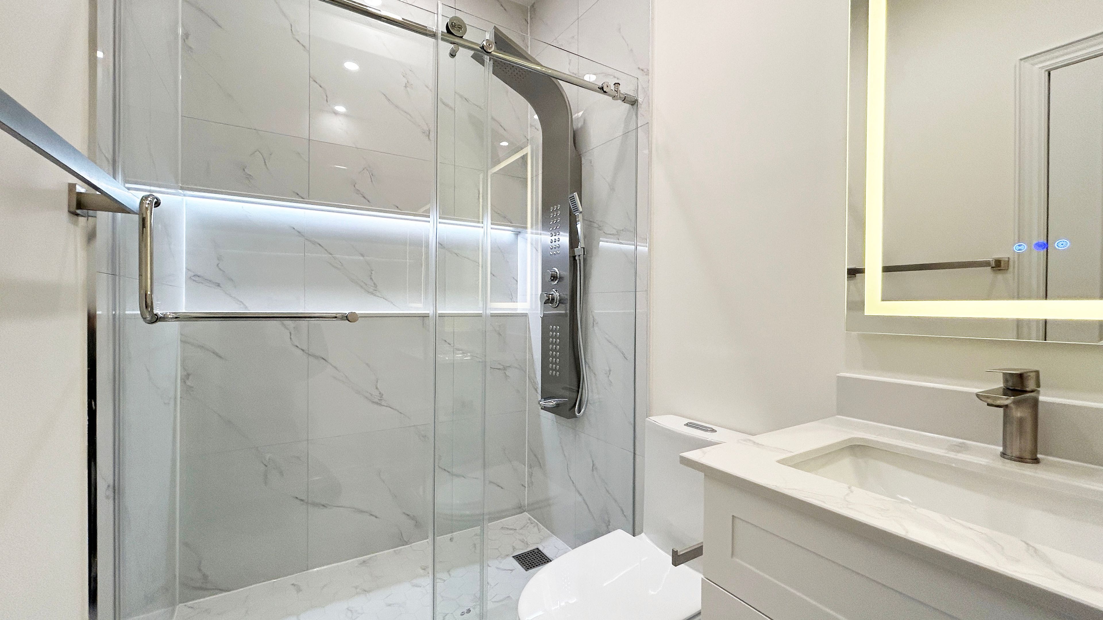 • Modern kitchen features high-end appliances and quartz countertops.