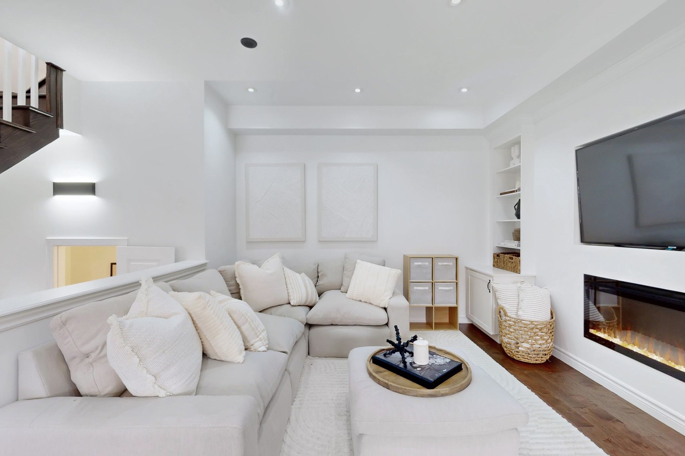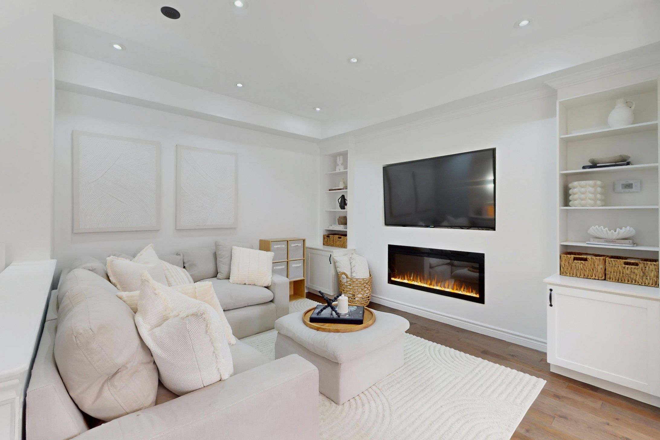 • Cozy living room with an electric fireplace and elegant built-in shelving.