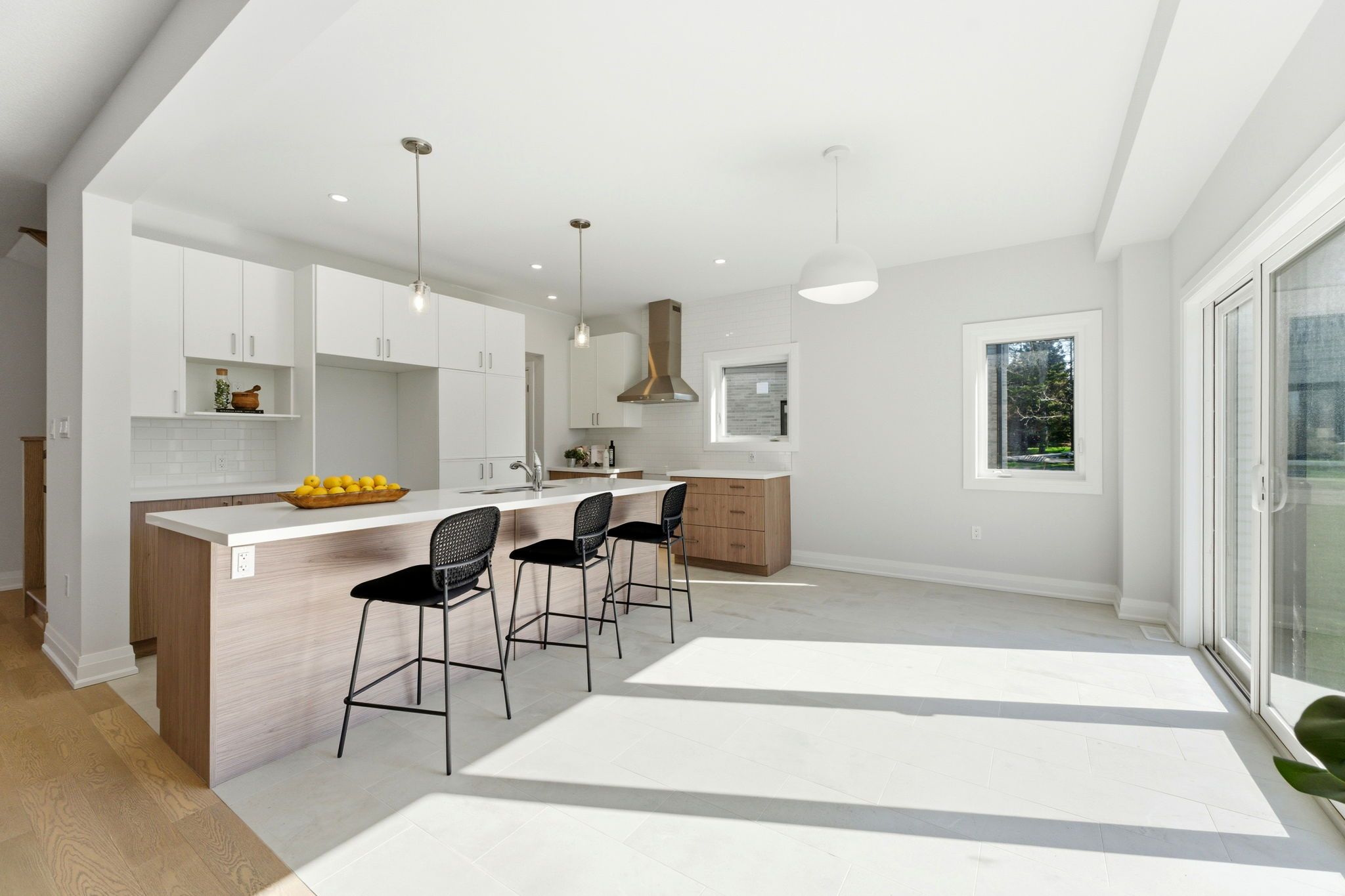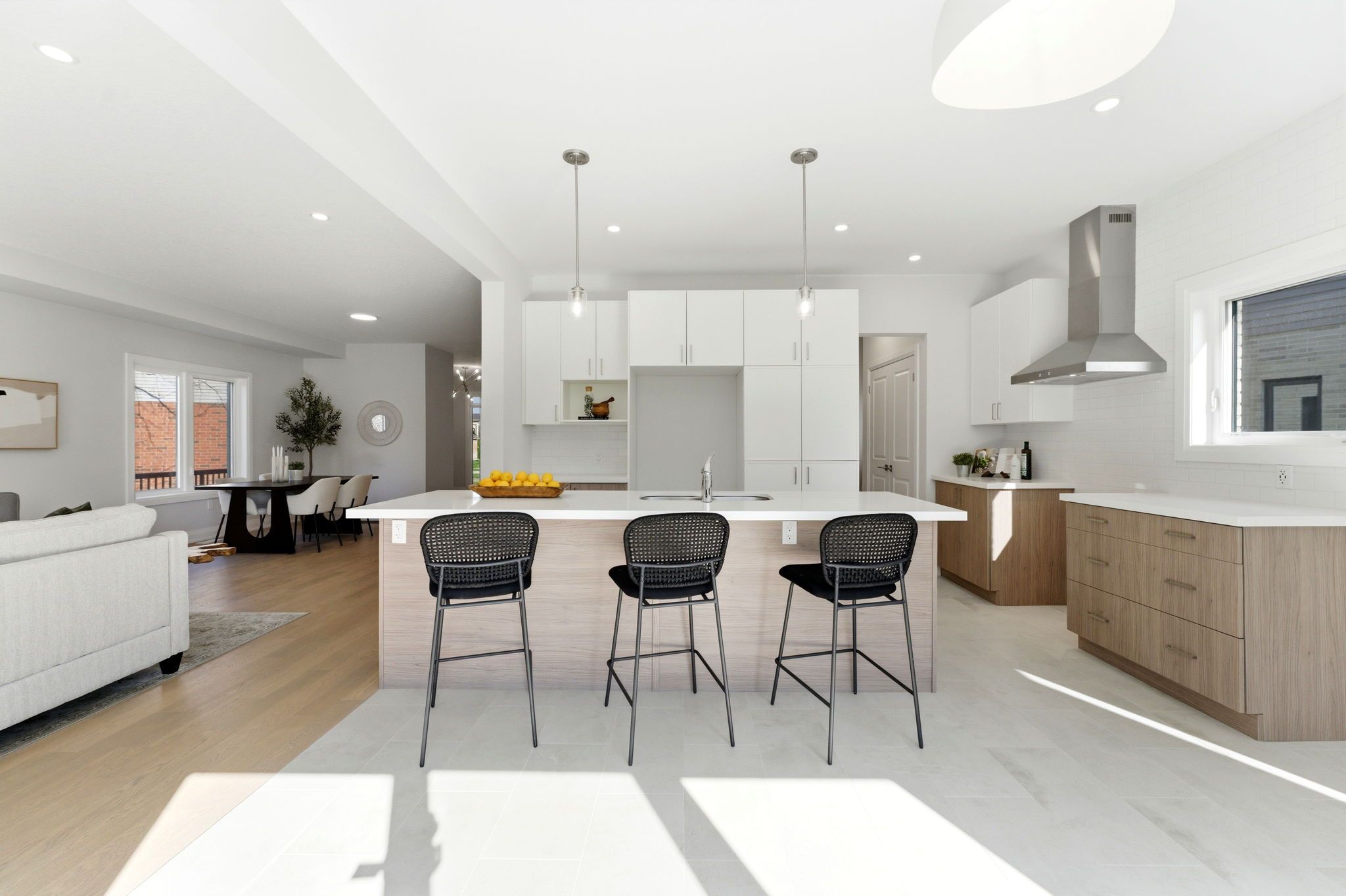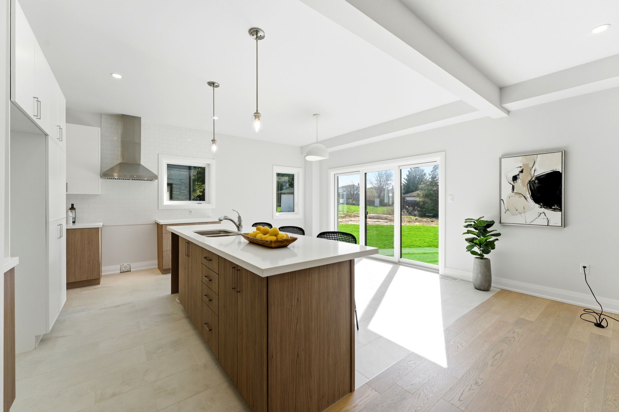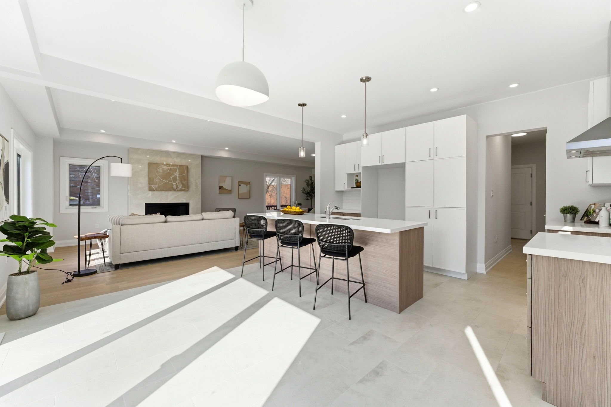 • Stylish kitchen features quartz countertops and a large center island.