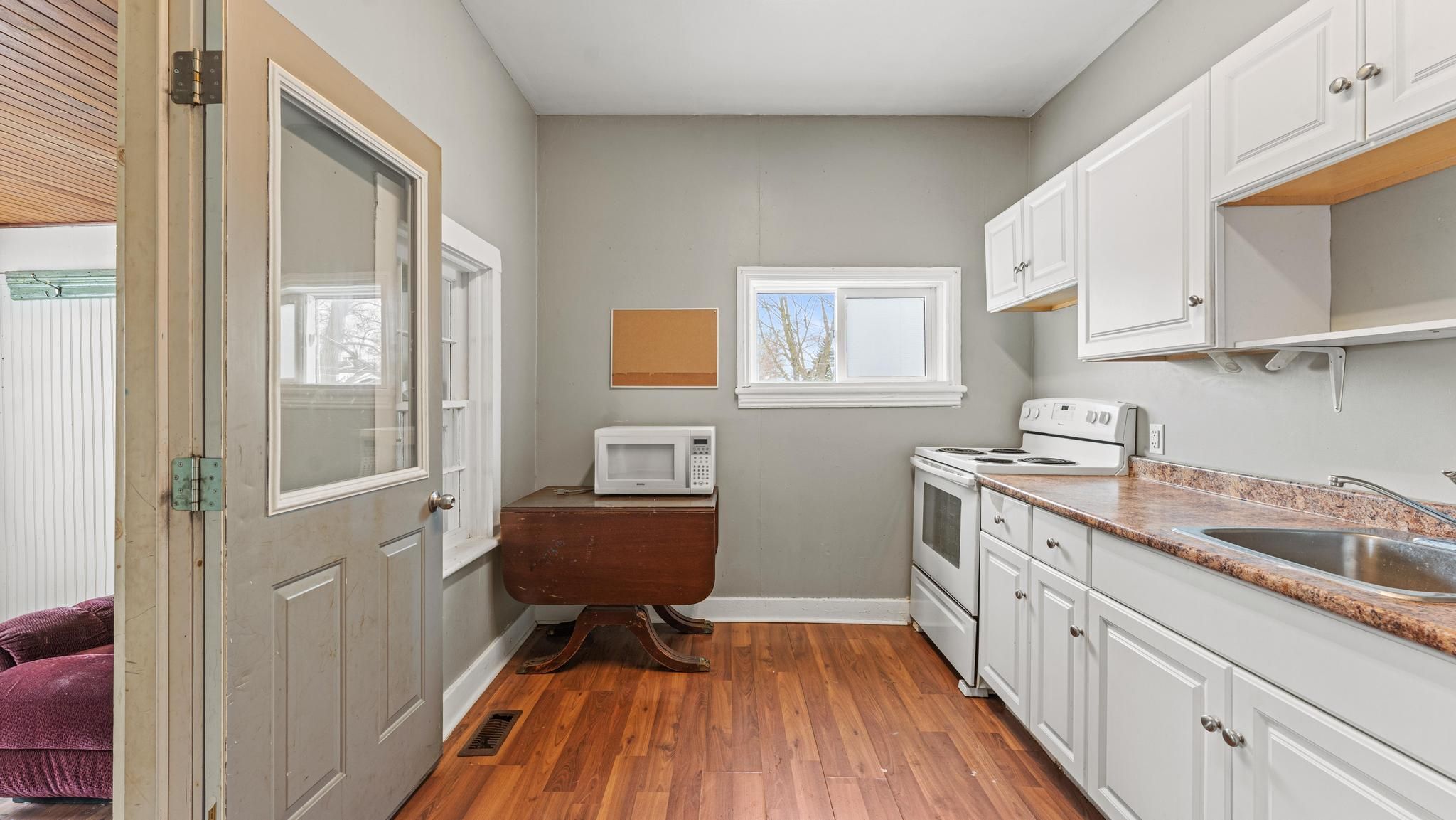 • Front unit features three bedrooms and inviting eat-in kitchen.