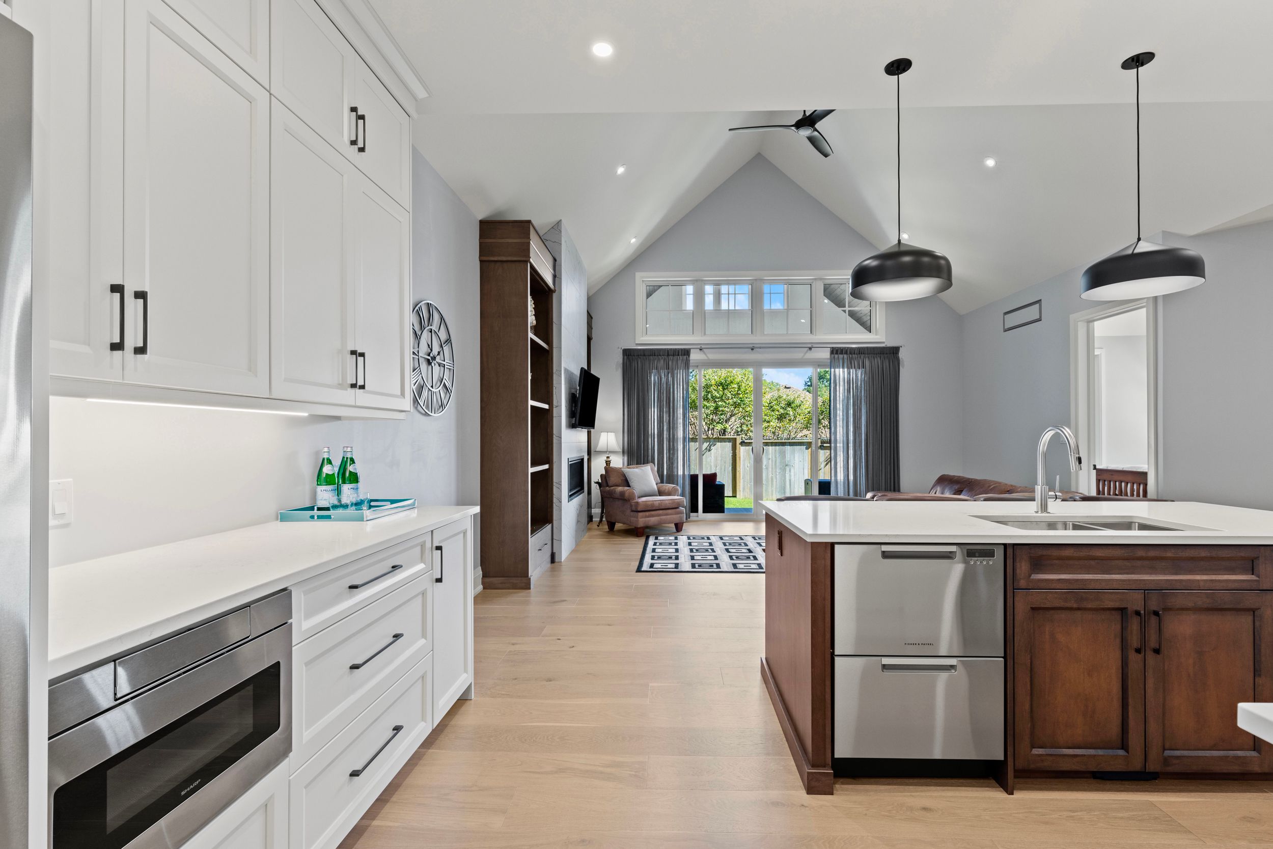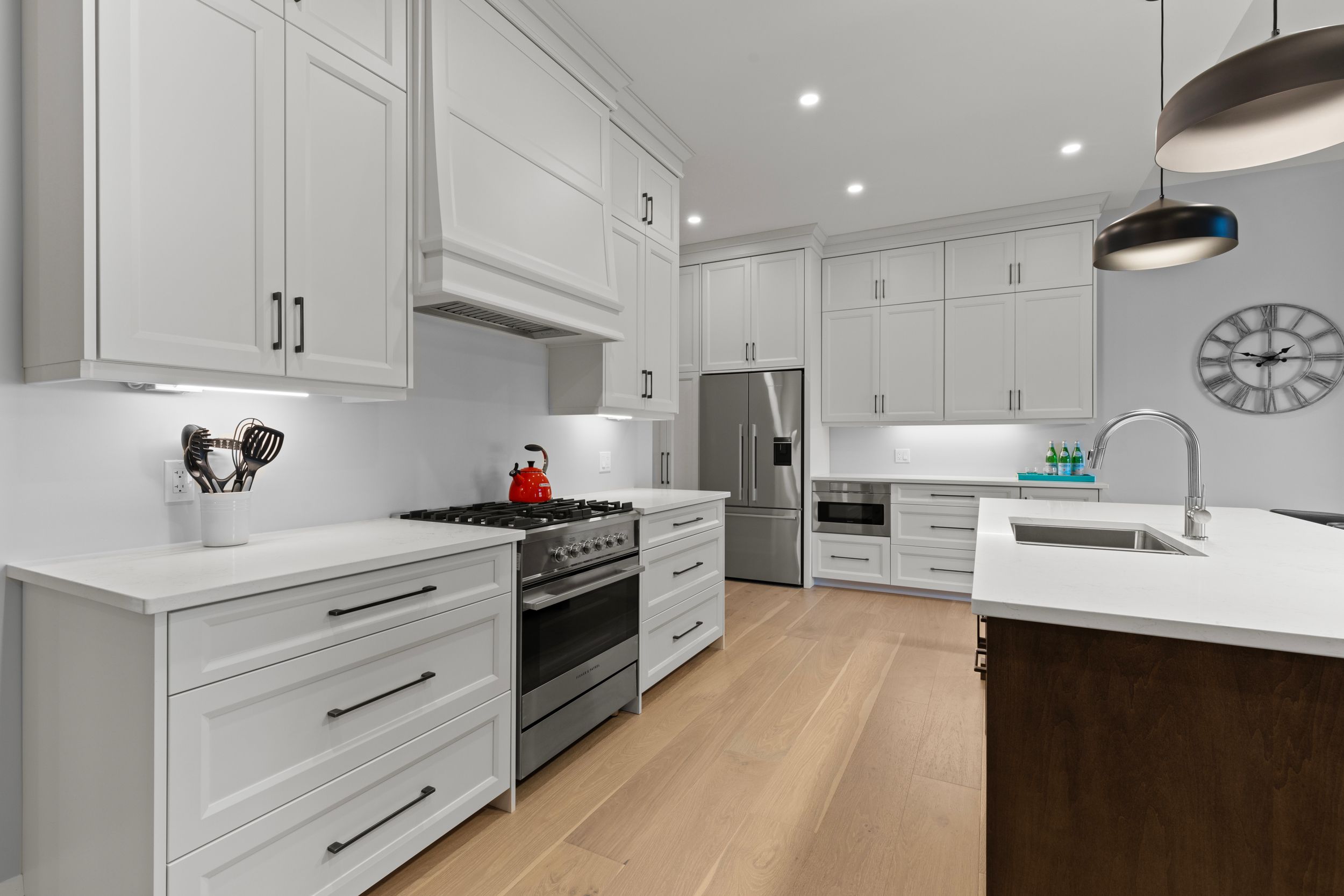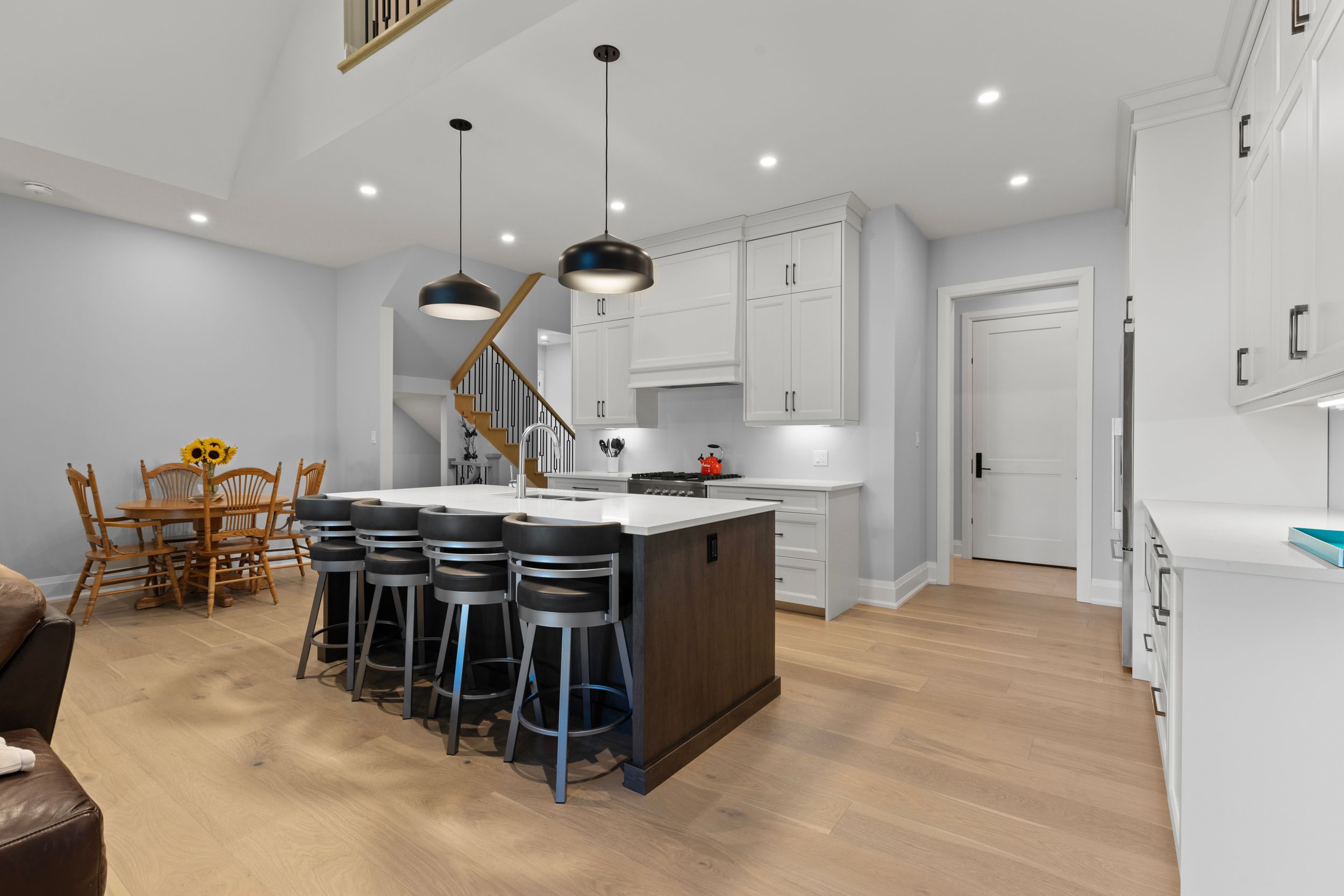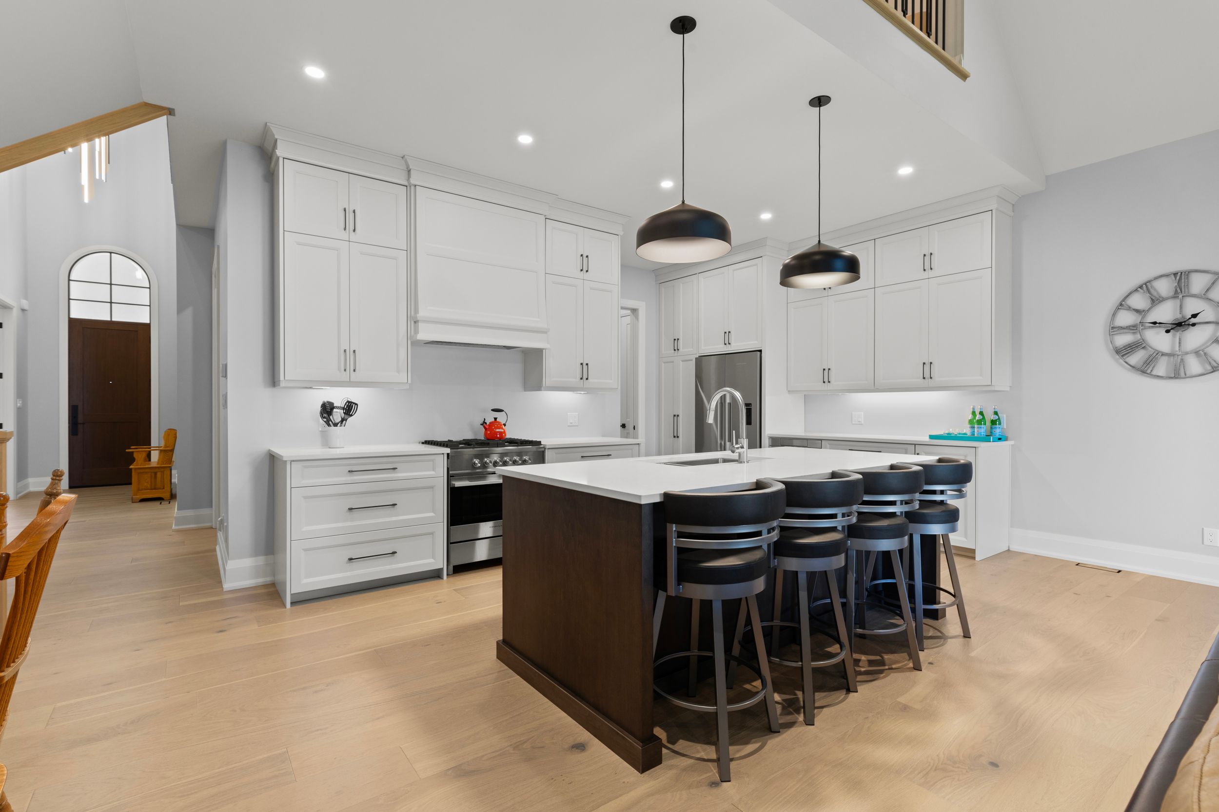 • Chef’s kitchen with quartz surfaces and oversized island for gatherings.