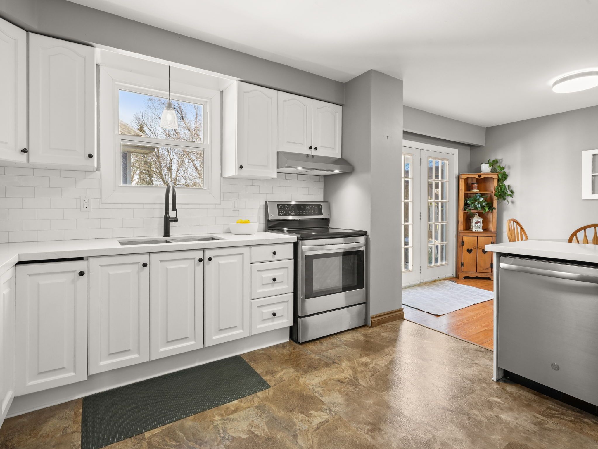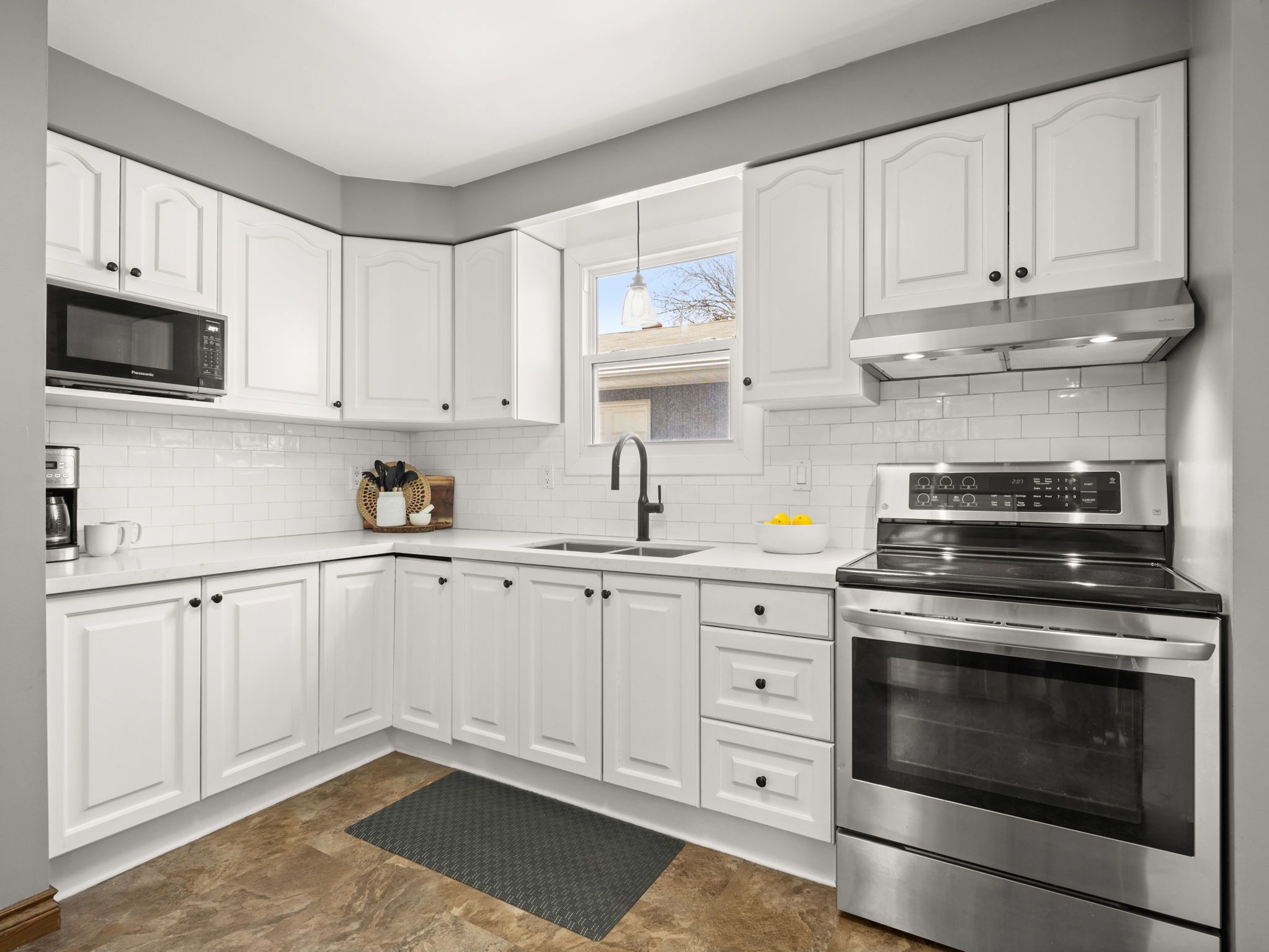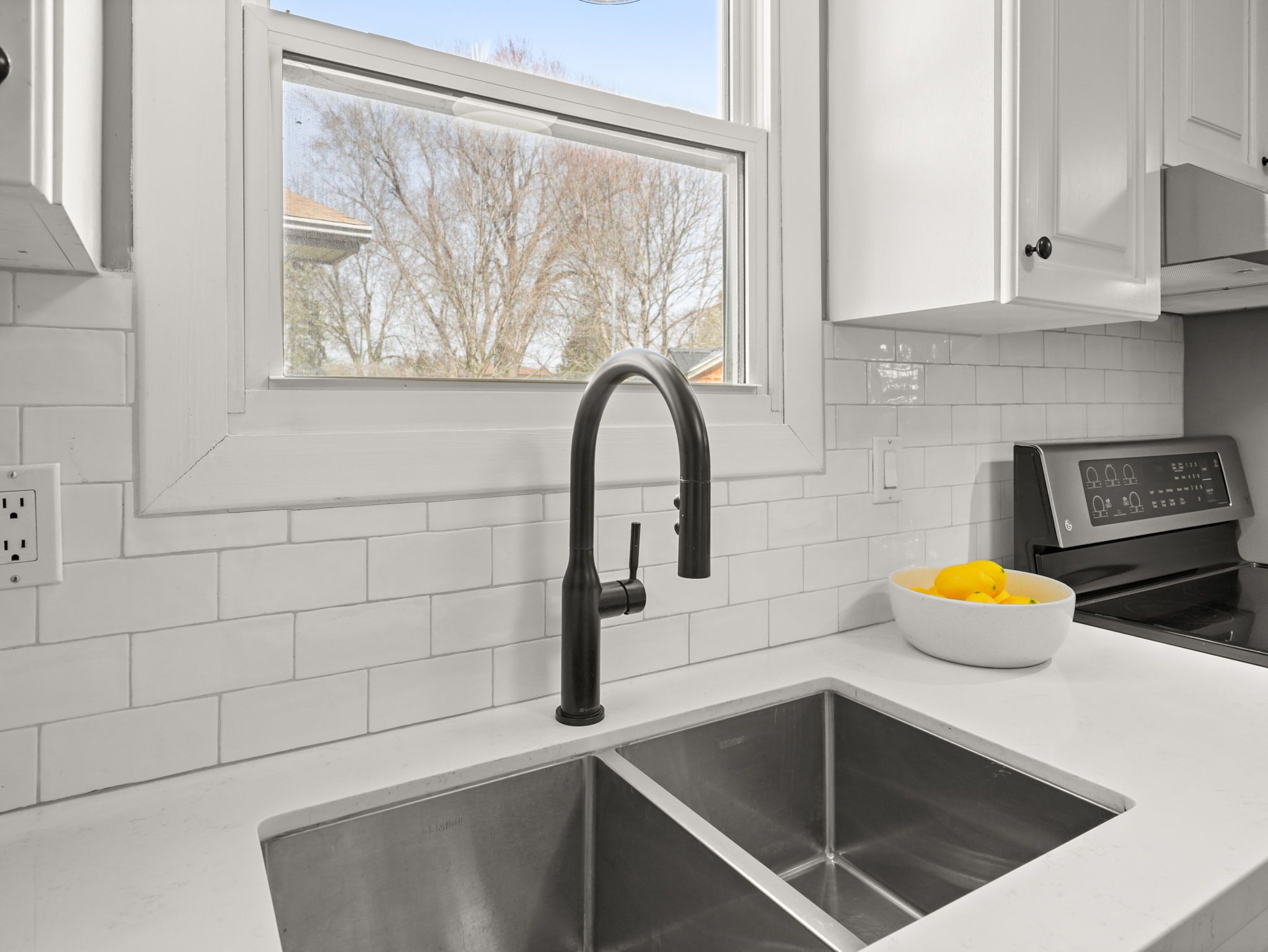 • Renovated kitchen with quartz countertops, stylish backsplash, and easy patio access.