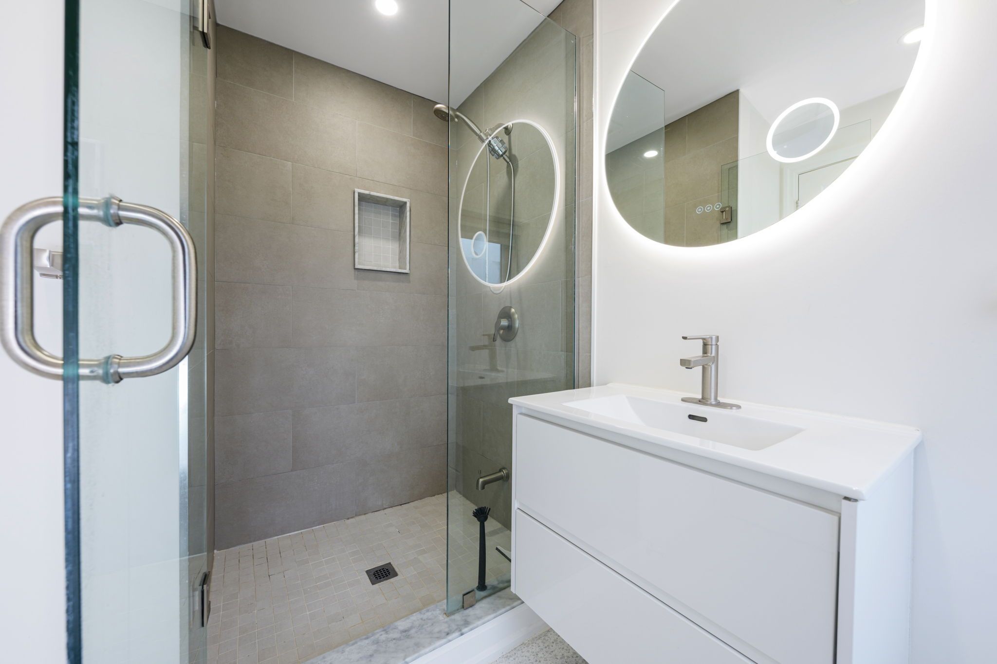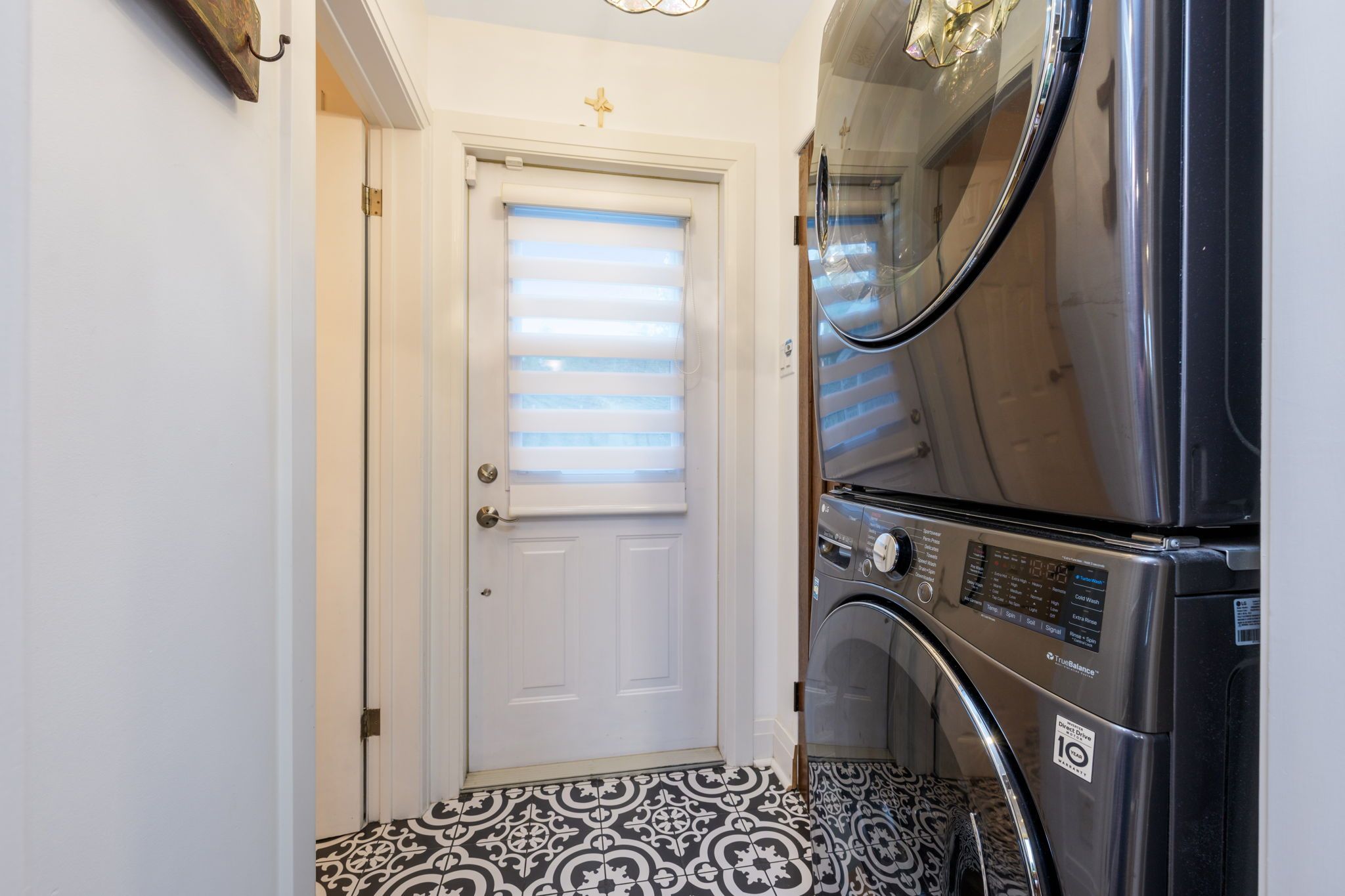 • Modern kitchen features heated floors, quartz countertops, and stainless steel appliances.