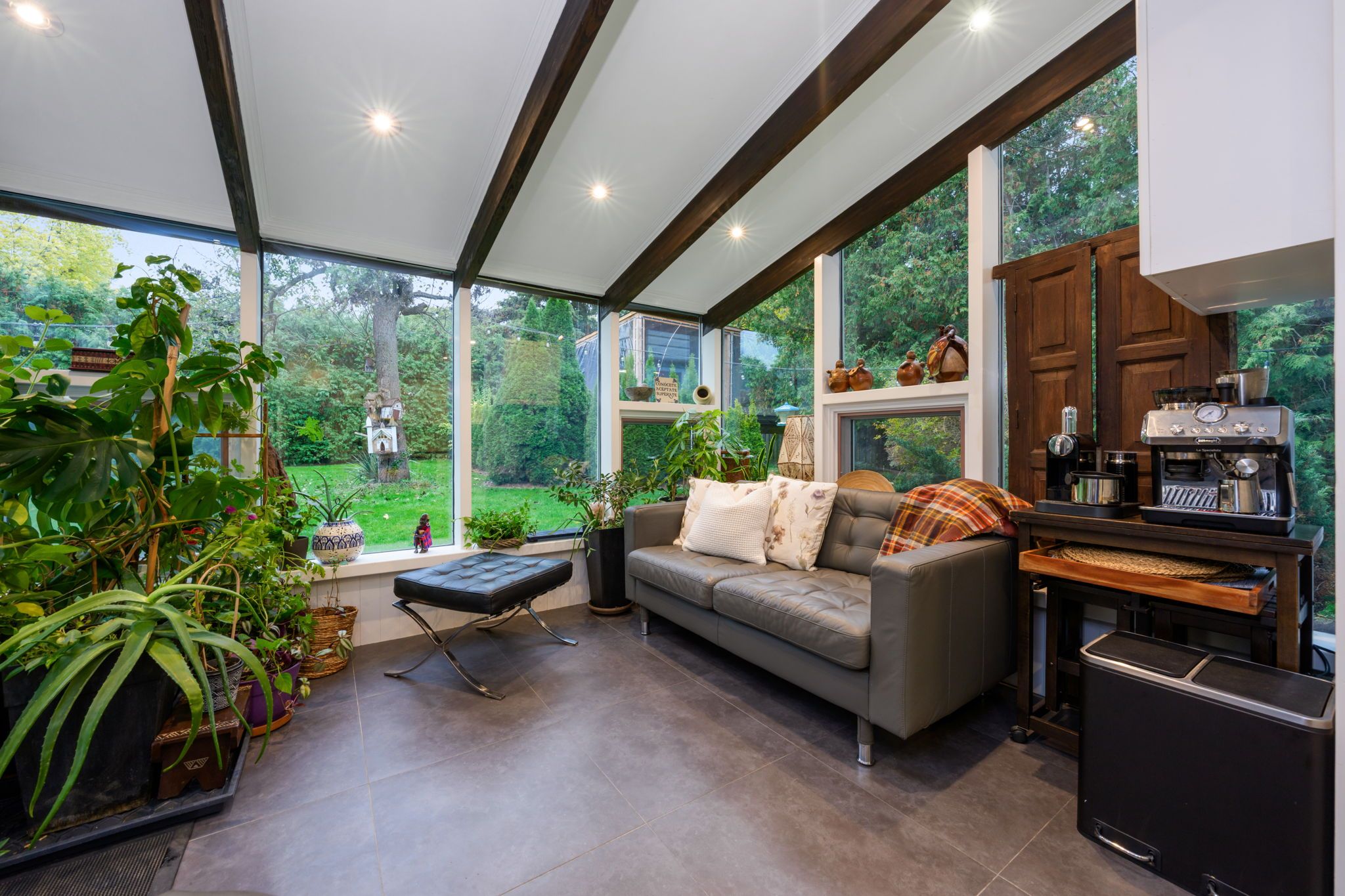 • Bright four-season sunroom opens to partially covered deck for outdoor entertaining.