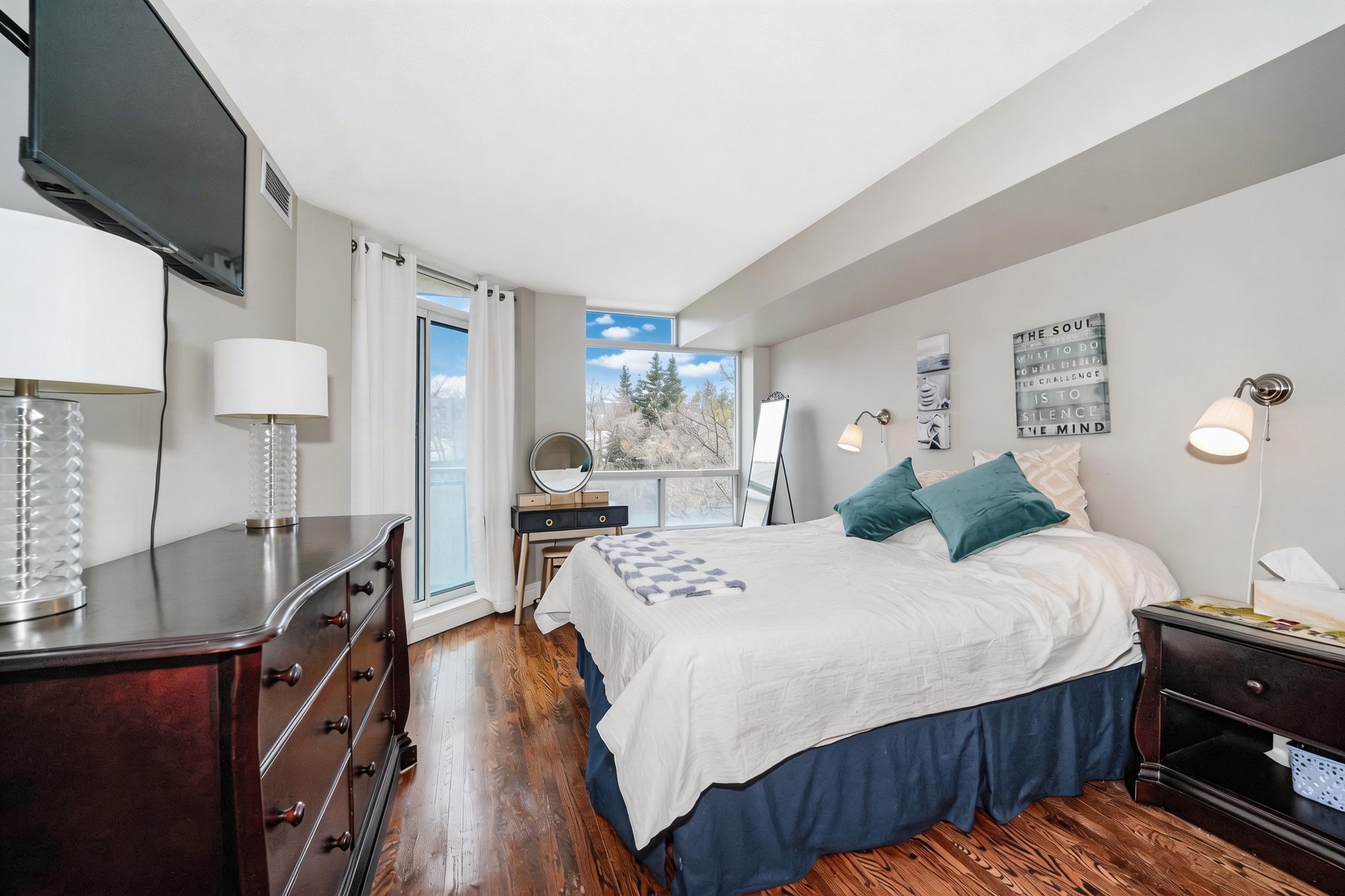 Discover bright, elevated living in this spacious corner suite with views overlooking a charming parkette. This beautifully maintained 2-bedroom, 2 full bathroom residence features a highly desirable southwest exposure, filling the home with sunshine throughout the day. With windows in every room, you will enjoy an airy, open feel and stunning views from every angle. The thoughtfully designed layout includes two balconies, each with walkouts from both bedrooms as well as the main living area and kitchen, ideal for seamless indoor-outdoor living and relaxing or entertaining. One of the balconies also features a gas bbq hookup, perfect for easy outdoor cooking and hosting. Inside, the home features elegant hardwood flooring paired with durable tile in key areas. The updated eat-in kitchen offers stone countertops, generous cabinetry, and an extended breakfast bar along the living room side, creating a perfect setting for everyday meals or effortless entertaining while staying connected to the living space. The primary bedroom features a generous walk-in closet and a 4-piece ensuite. The second bedroom is a great size, offering a roomy double closet and ample space for a variety of uses. A standout feature of this building is that each unit is equipped with its own furnace and air conditioner, maintained by the building, giving you the rare ability to control your own temperature year-round. Conveniently located just a 16-minute walk to mimico go, this home is close to highways, parks, and schools, with easy access to transit and the waterfront, featuring popular restaurants nearby. The unit includes two tandem underground parking spaces and a locker with built-in shelving for extra storage.