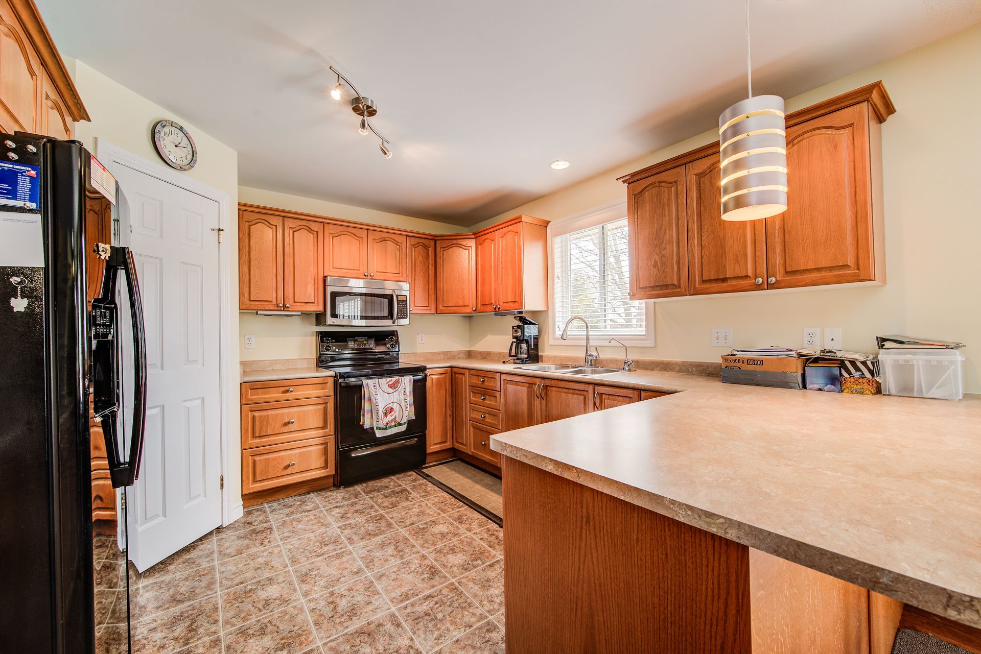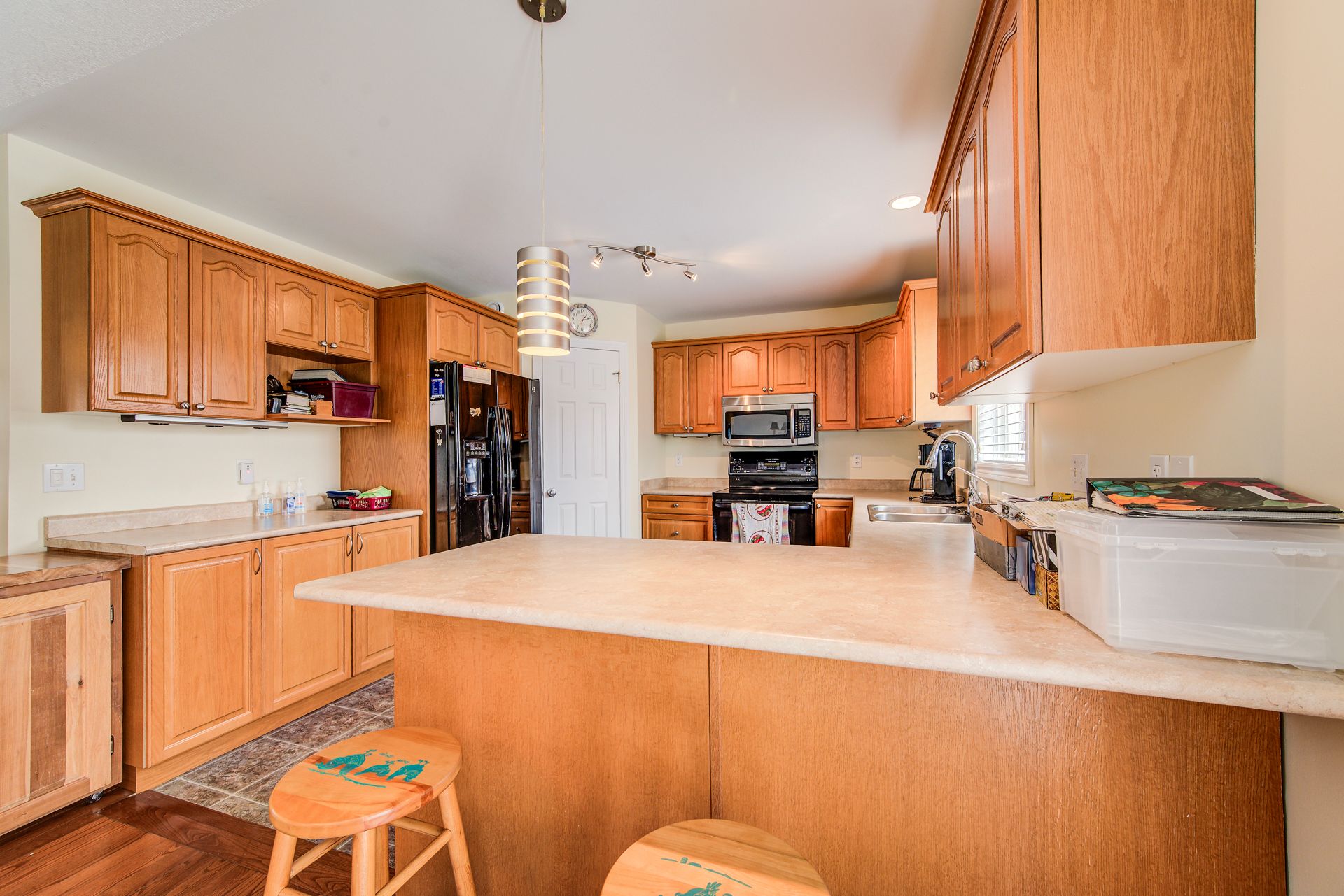 • Kitchen includes a peninsula and a walk-in pantry for extra storage.
