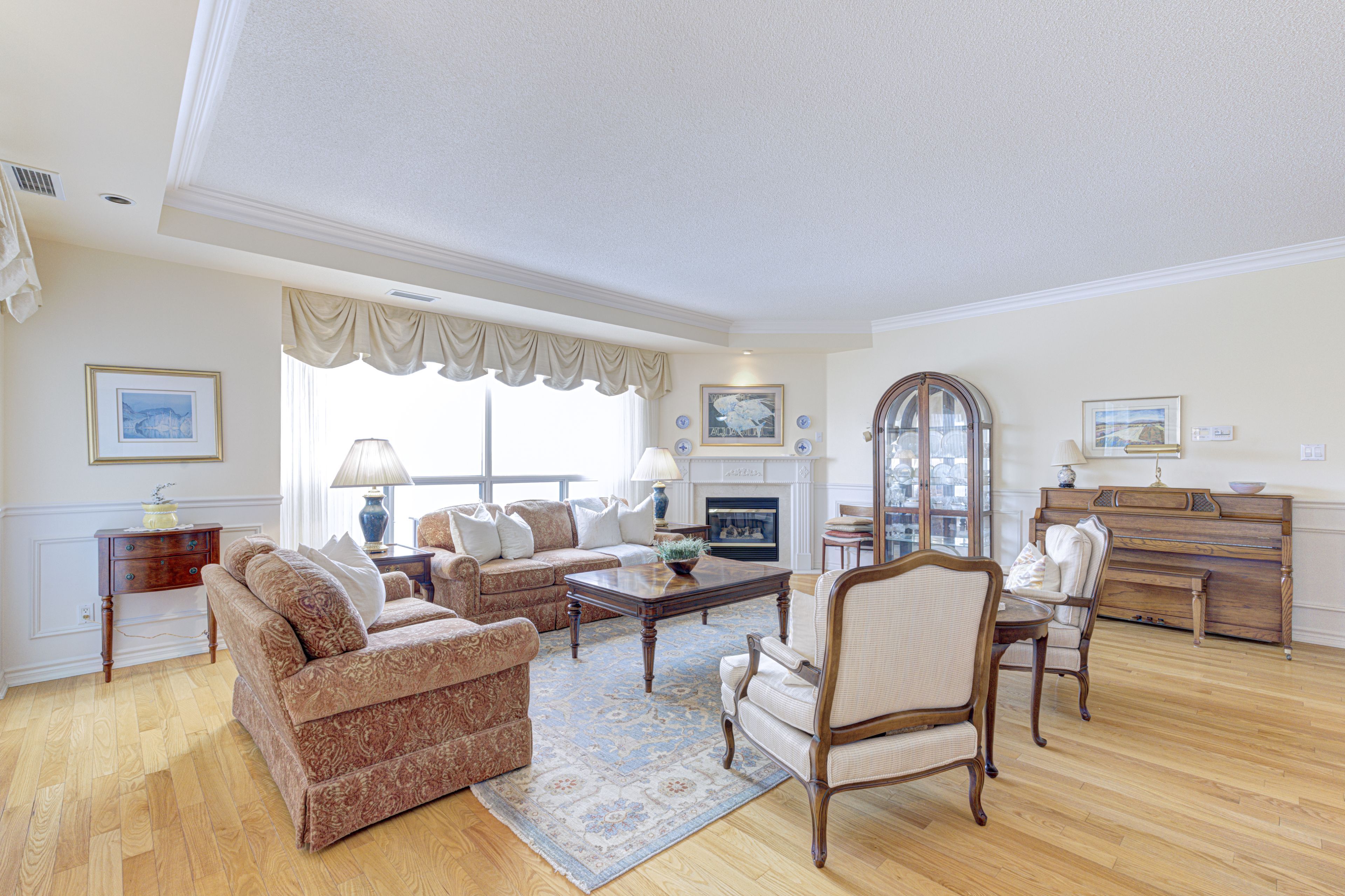• Bright living area features a gas fireplace and large windows.