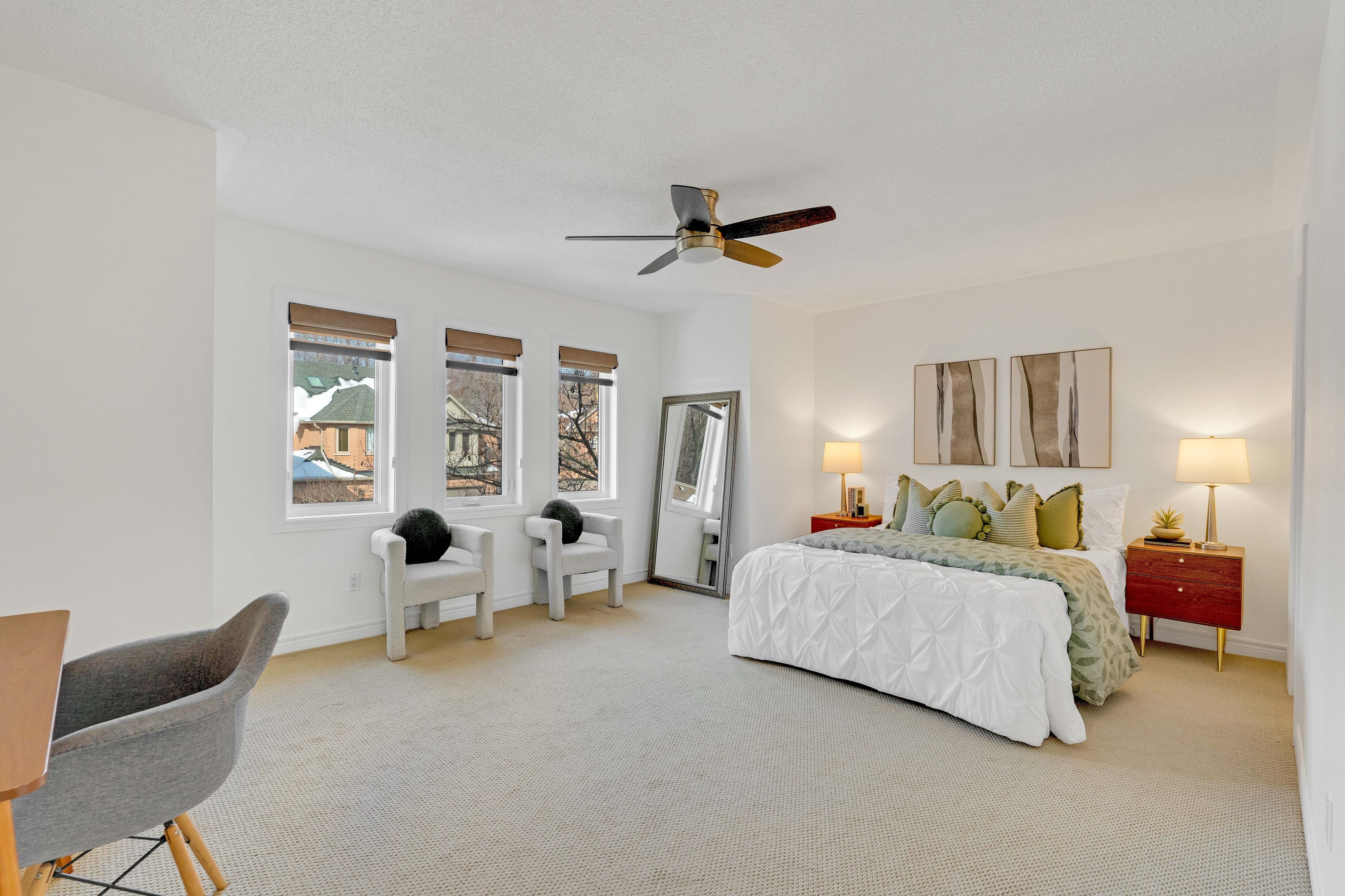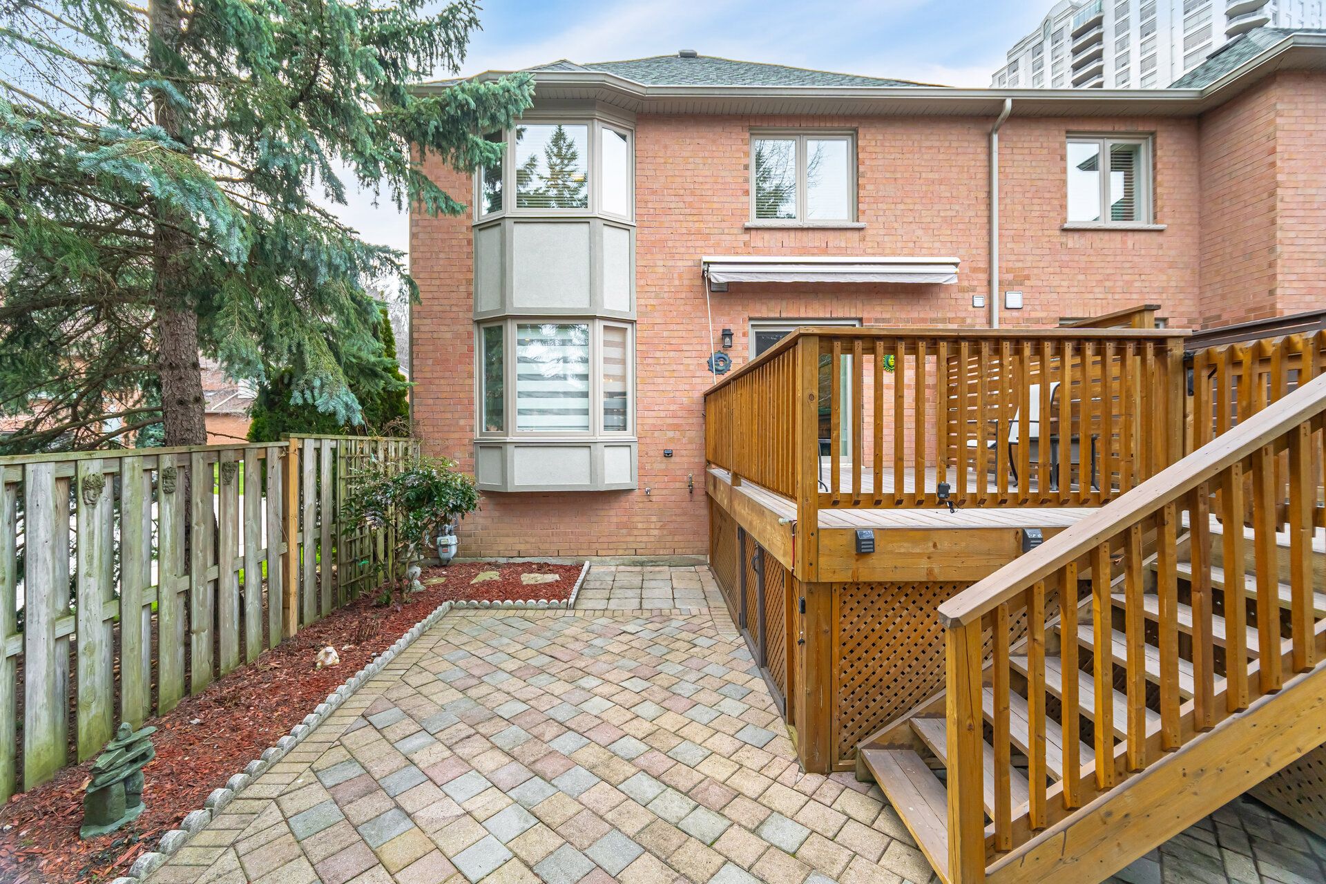 Rarely offered in prestigious sawmill valley, this fully renovated townhome is surrounded by serene forest trails and sits within an exclusive enclave of just 56 homes. Offering approx. 2,200 sq. Ft. Plus an additional 775 sq ft of finished basement, it delivers the space and feel of a detached home with the ease of condo living. A dramatic two-storey foyer with a european crystal chandelier leads into elegant interiors featuring hardwood and porcelain floors, crown mouldings, and sun-filled principal rooms. The updated kitchen opens to a cozy family room with a built-in fireplace-perfect for everyday living and entertaining. Upstairs offers three spacious bedrooms, second-floor laundry, and a spa-inspired primary ensuite with soaker tub, oversized shower, towel warmer, and natural light from a solar tube. The finished basement includes a large rec room, fourth bedroom, and 3-piece bath-ideal for guests. Enjoy a private deck and interlocking patio surrounded by mature greenery. A turnkey, lock-and-leave opportunity for those seeking luxury, space, and a peaceful, nature-filled setting just minutes to city amenities.