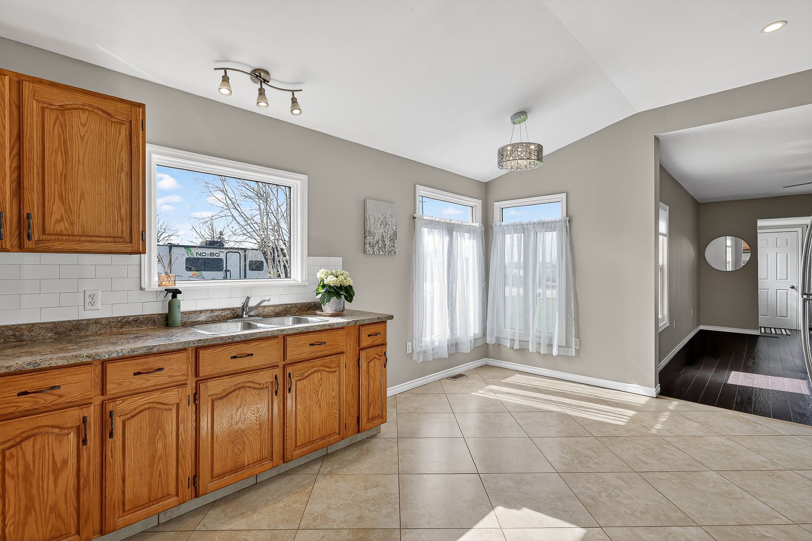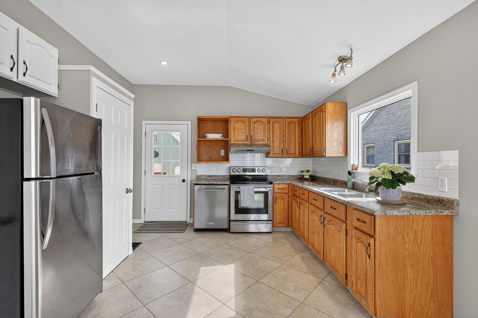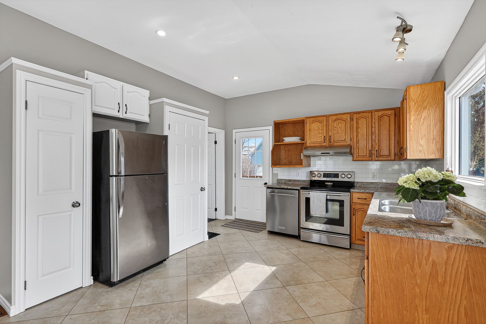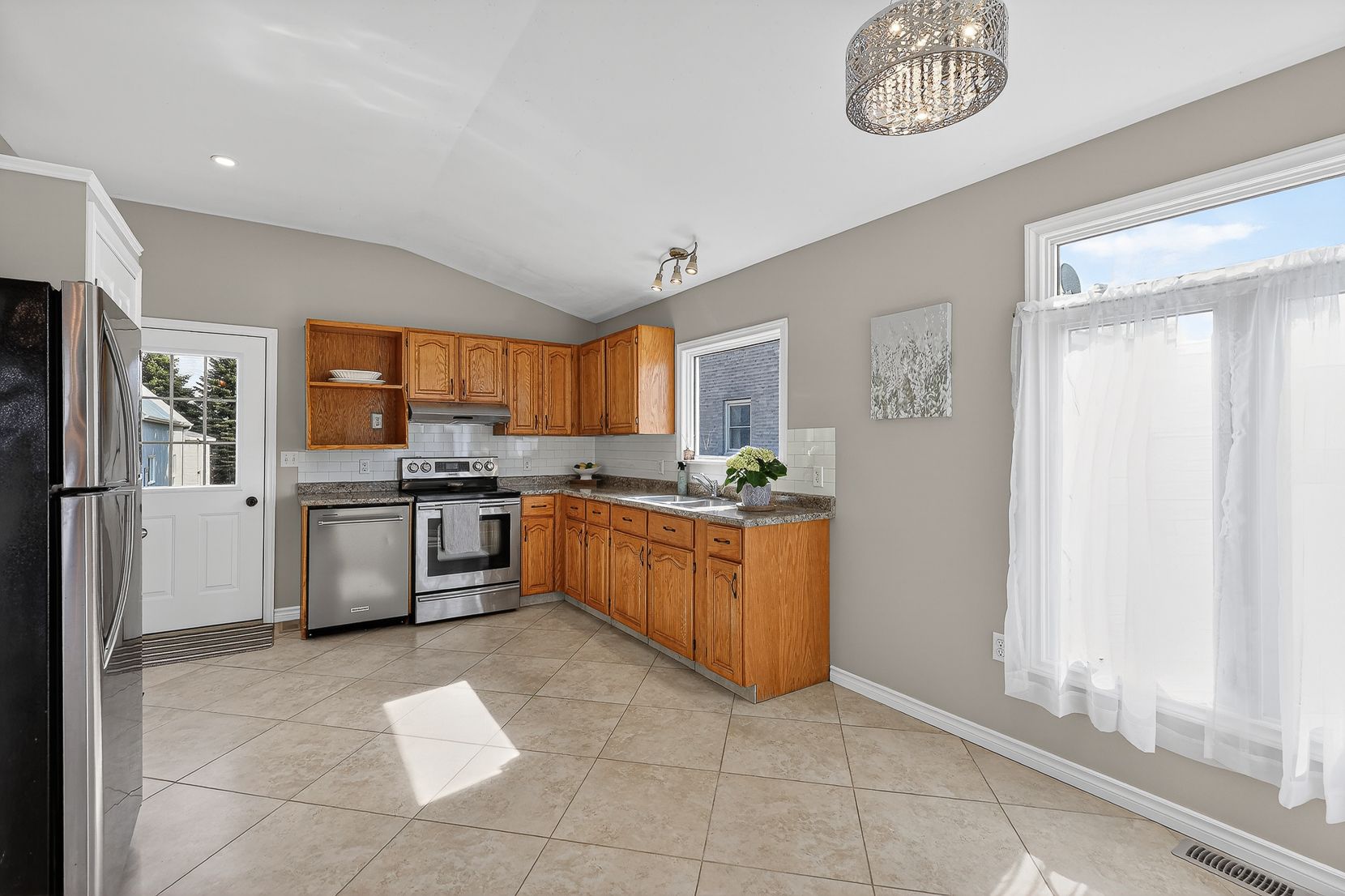 • Bright kitchen with tiled floors and high ceilings.