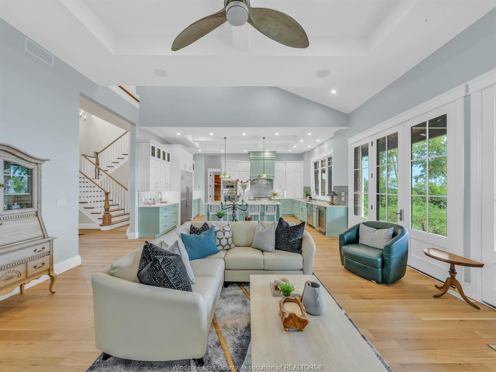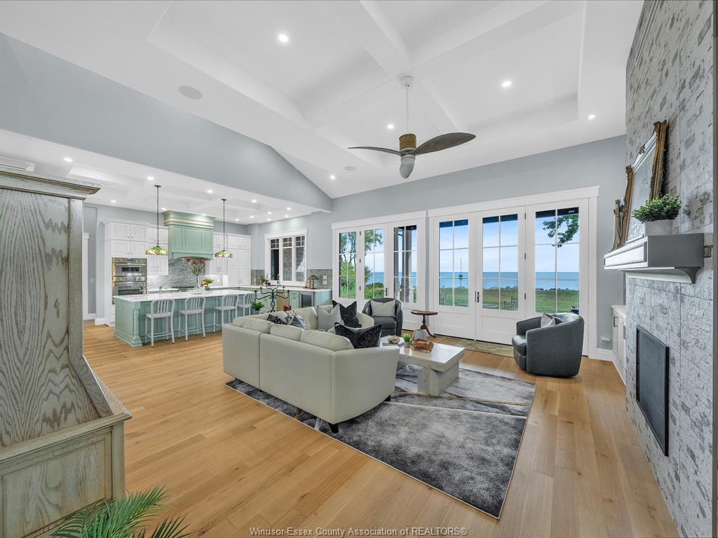 glass invite natural light and frame breathtaking water views, while soaring ceilings, custom millwork, and refined finishes evoke