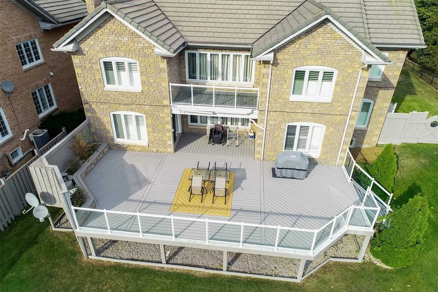 • Custom deck with waterfall and lighting creates a unique outdoor space.