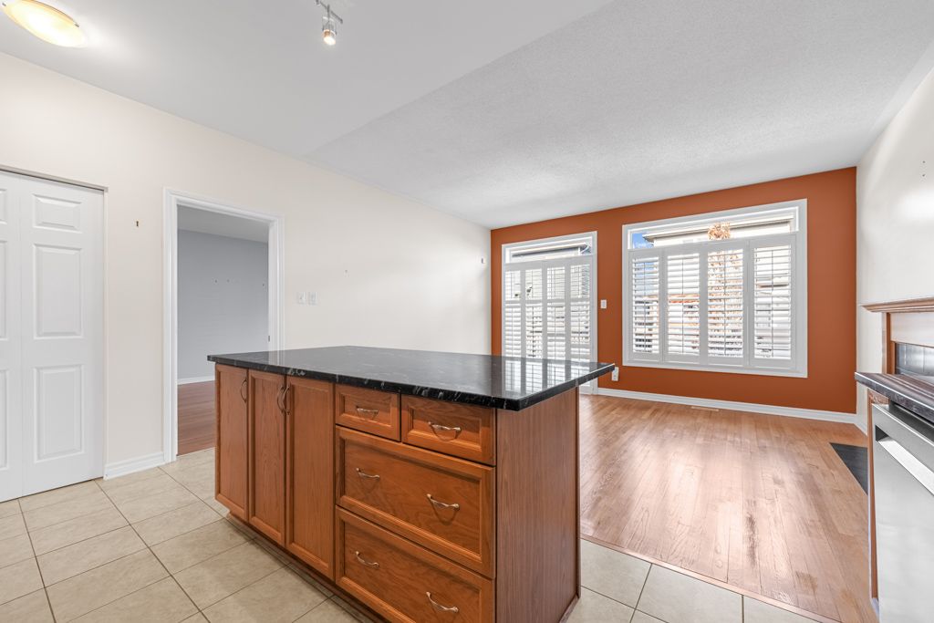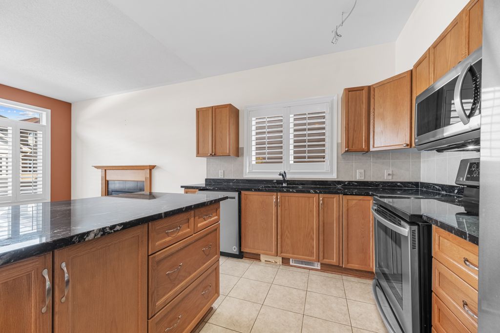 • Open concept kitchen with granite counters and ample solid wood cupboards.