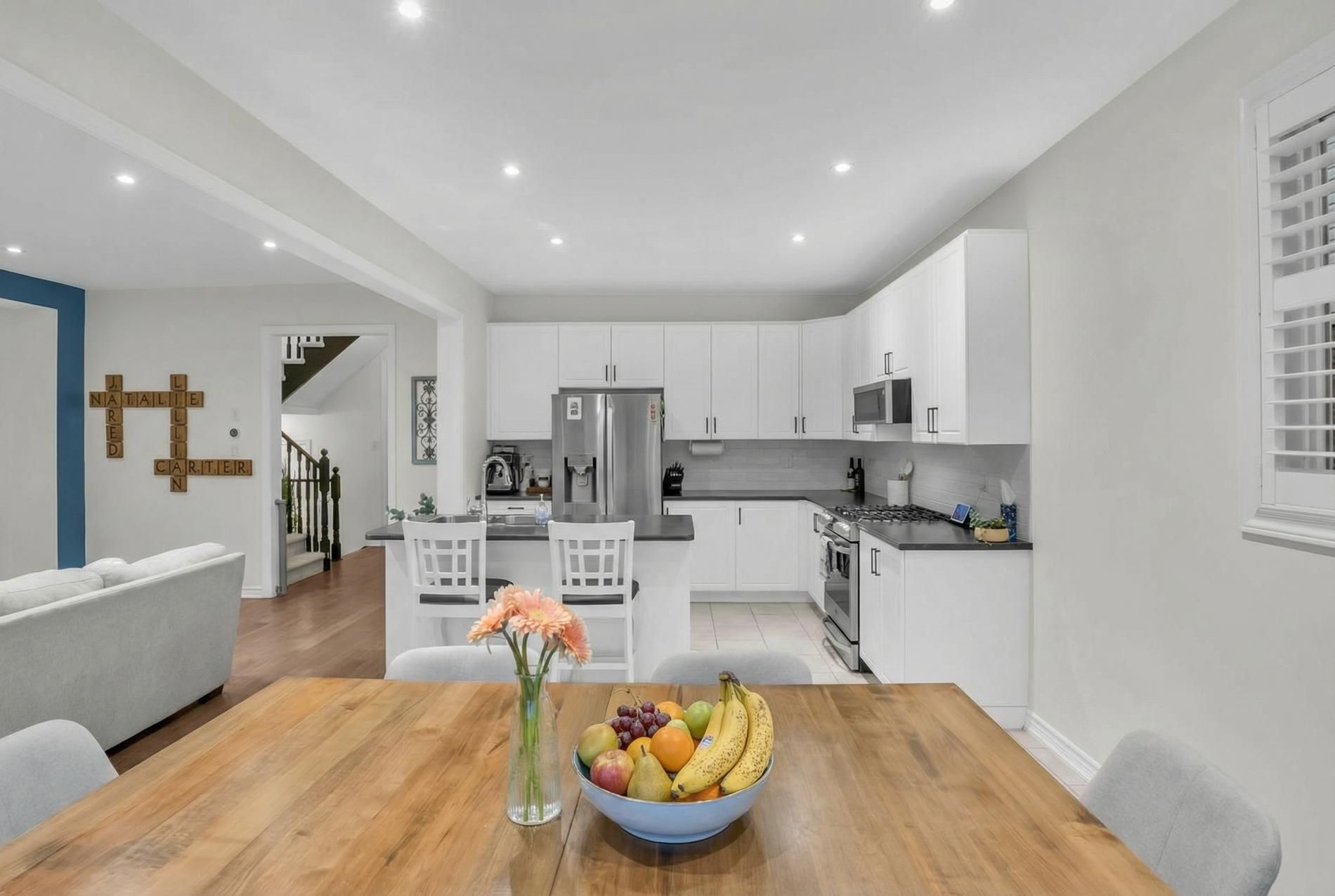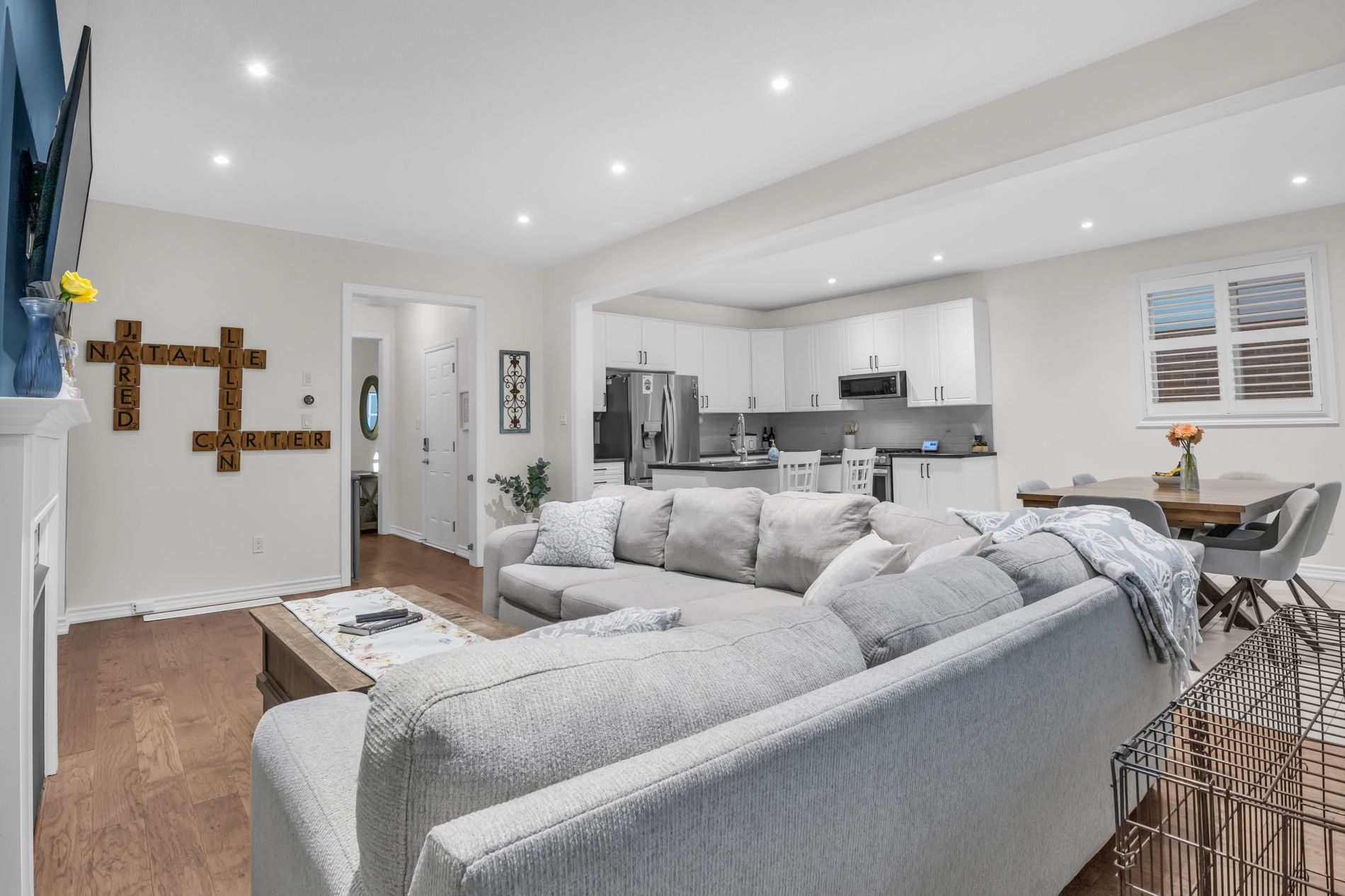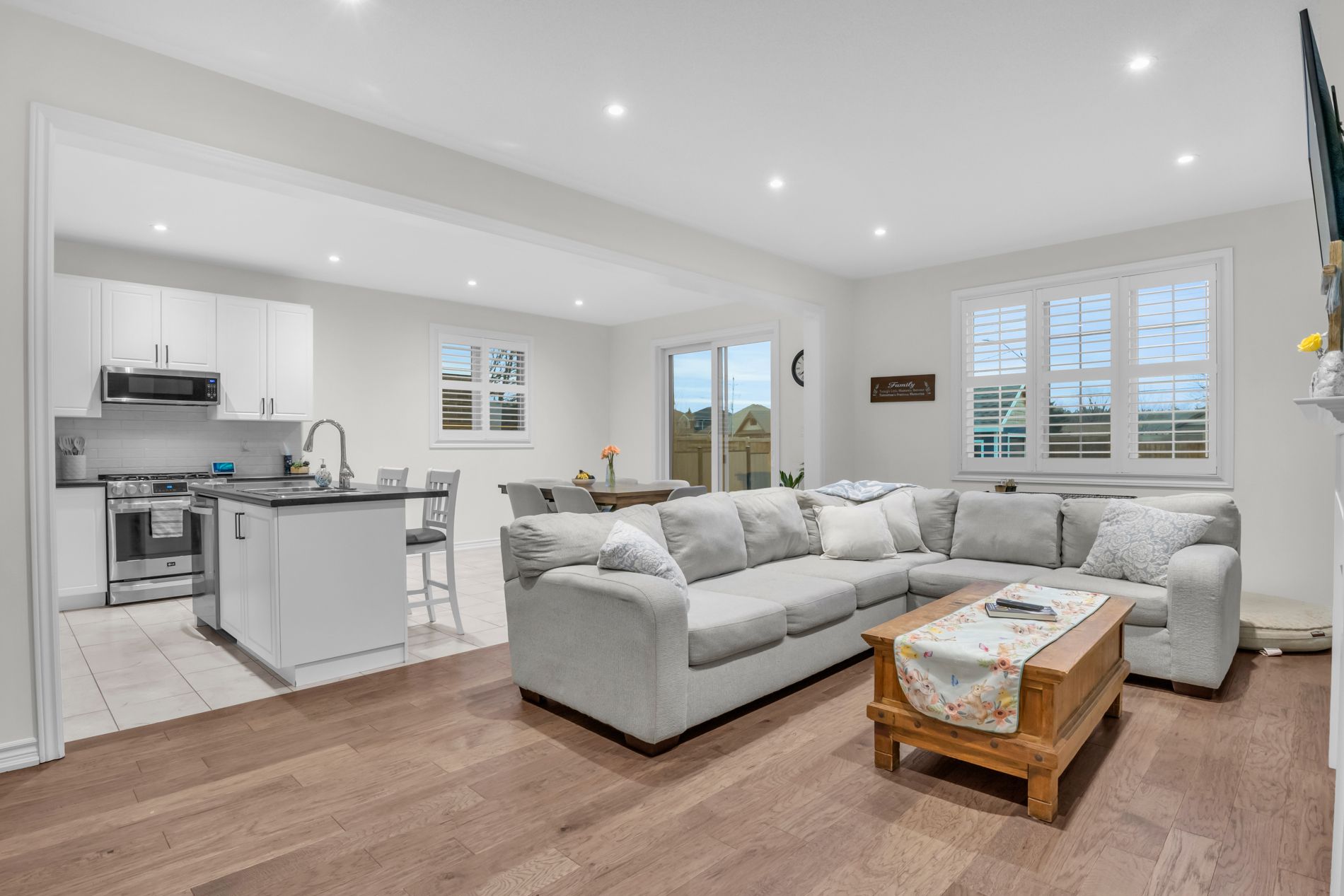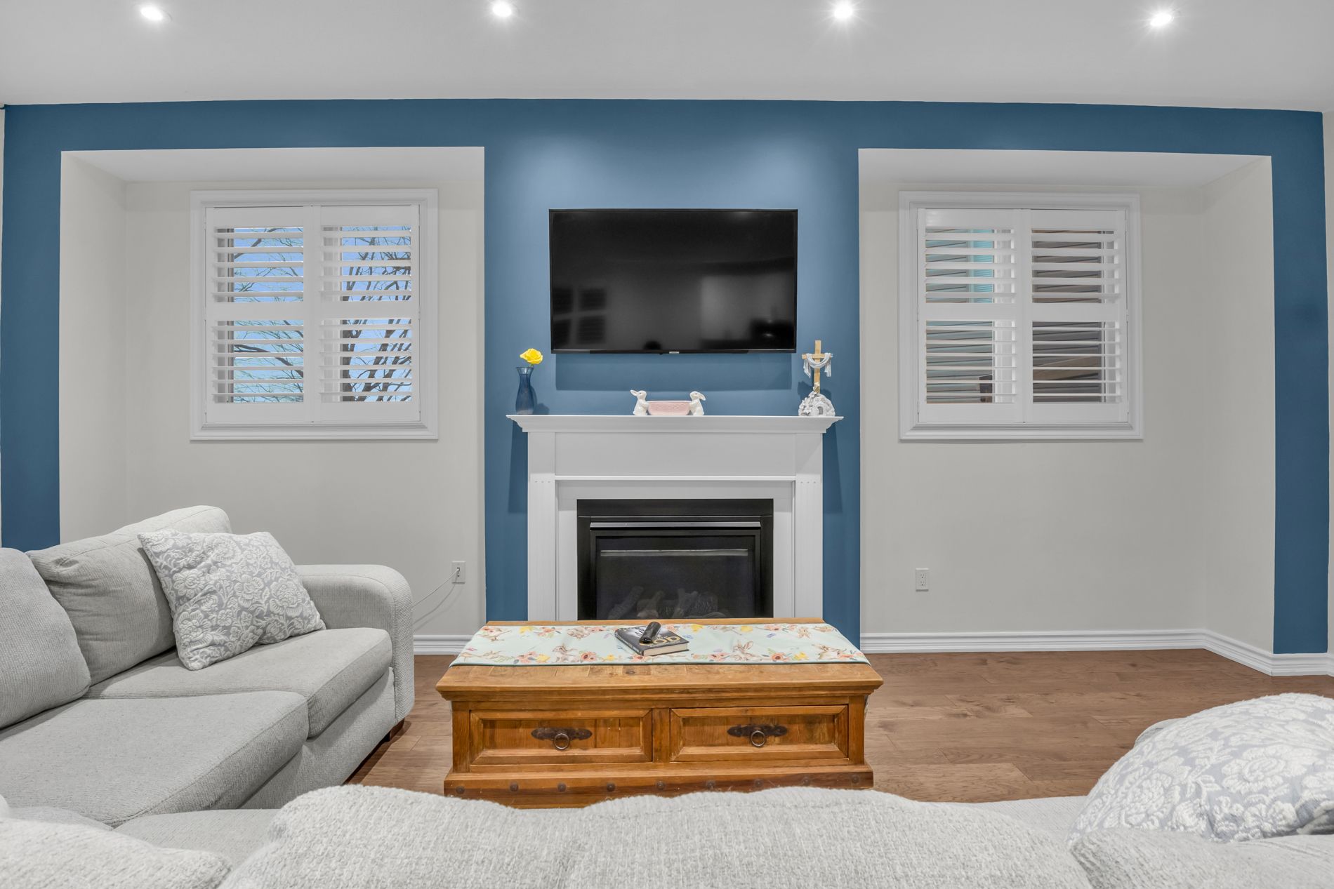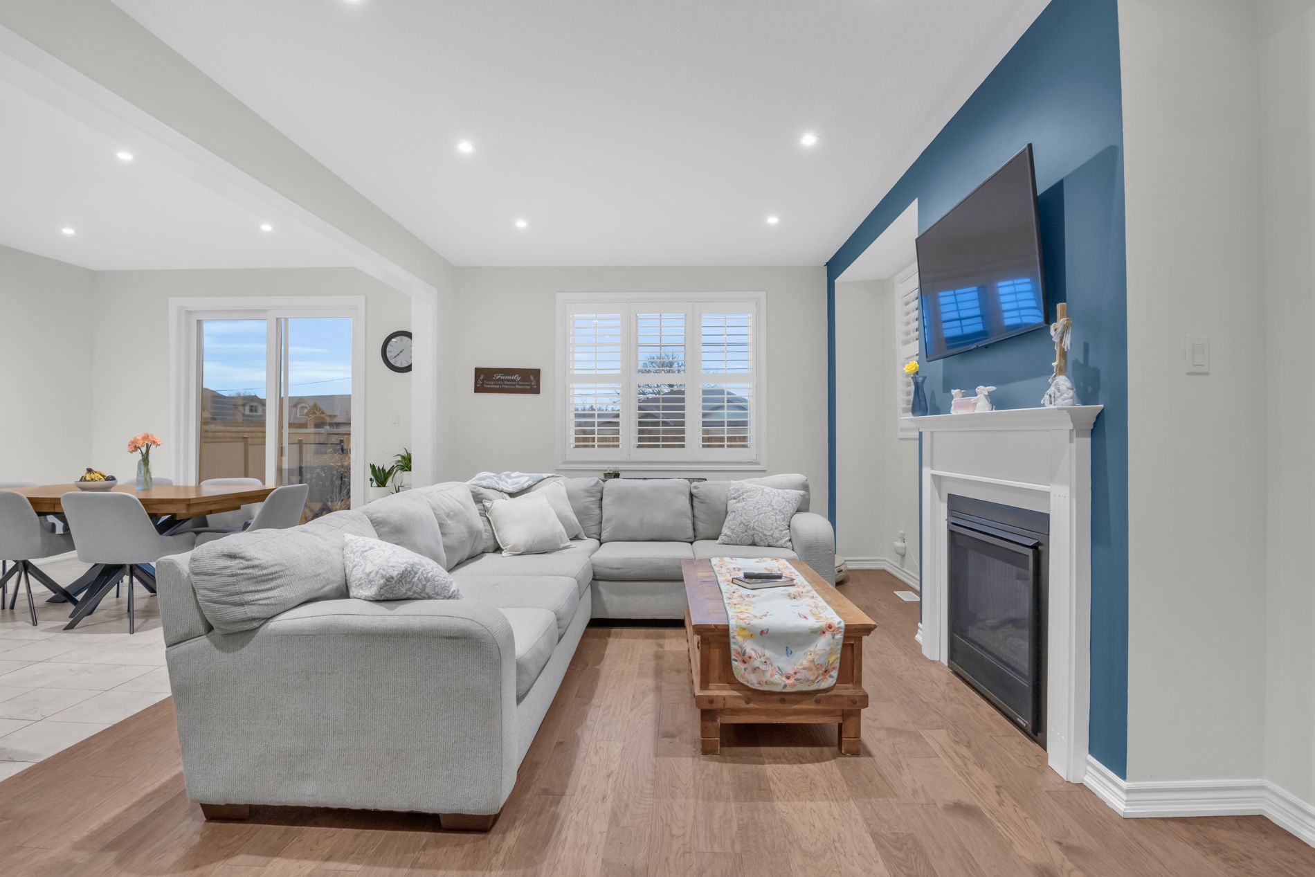 • Open-concept main floor with large windows and a cozy gas fireplace.