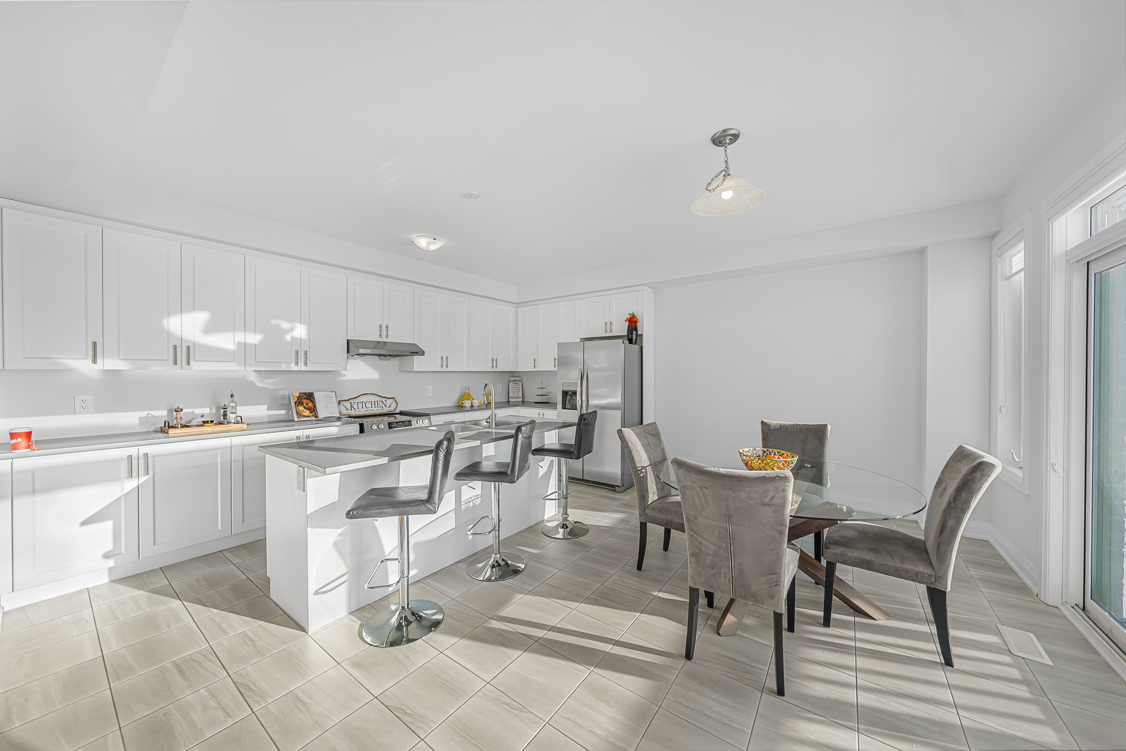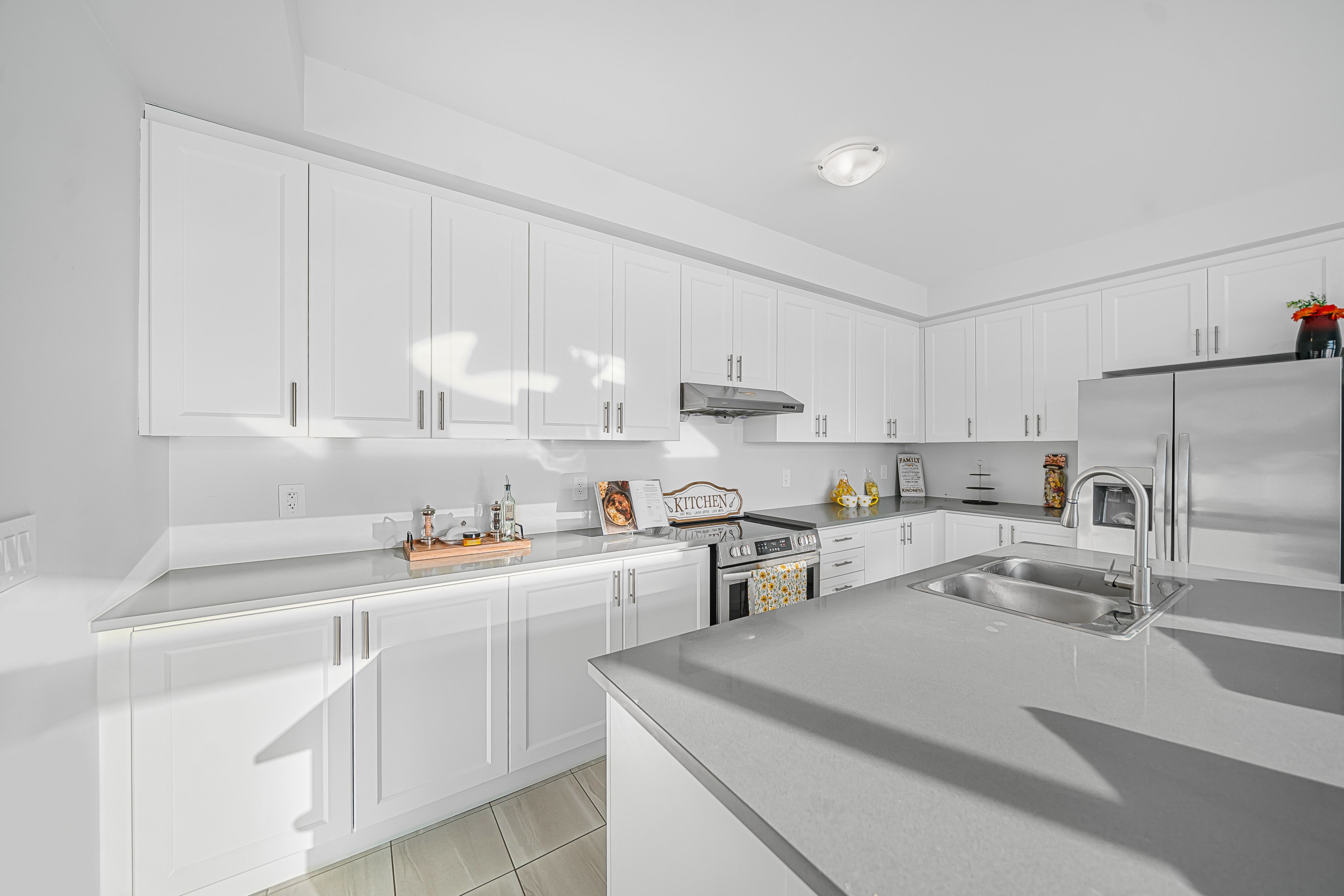 • Chef's kitchen features modern appliances, quartz countertops, and a spacious island.